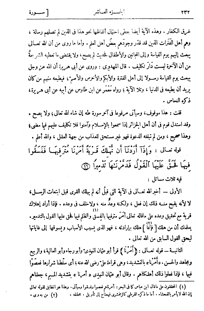 (١). المحققون على ما قال ابن عباس كما في البحر: أمرناهم فعصوا وفسقوا وسيأتي. وهذا هو المطابق كقوله تعالى إن الله لا يأمر بالفحشاء. أما ما ذكره القرطبي كالزمخشري فيحتاج إلى تأويل. محققة.