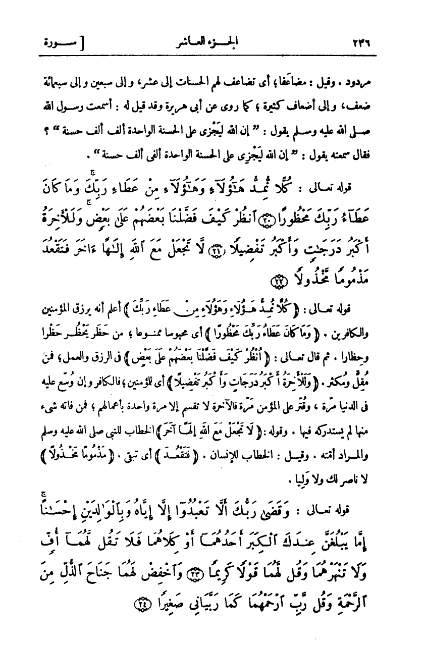وَقَضى رَبُّكَ أَلاَّ تَعْبُدُوا إِلاَّ إِيَّاهُ وَبِالْوالِدَيْنِ إِحْساناً إِمَّا يَبْلُغَنَّ عِنْدَكَ الْكِبَرَ أَحَدُهُما أَوْ كِلاهُما فَلا تَقُلْ لَهُما أُفٍّ وَلا تَنْهَرْهُما وَقُلْ لَهُما قَوْلاً كَرِيماً (٢٣) وَاخْفِضْ لَهُما جَناحَ الذُّلِّ مِنَ الرَّحْمَةِ وَقُلْ رَبِّ ارْحَمْهُما كَما رَبَّيانِي صَغِيراً (٢٤)