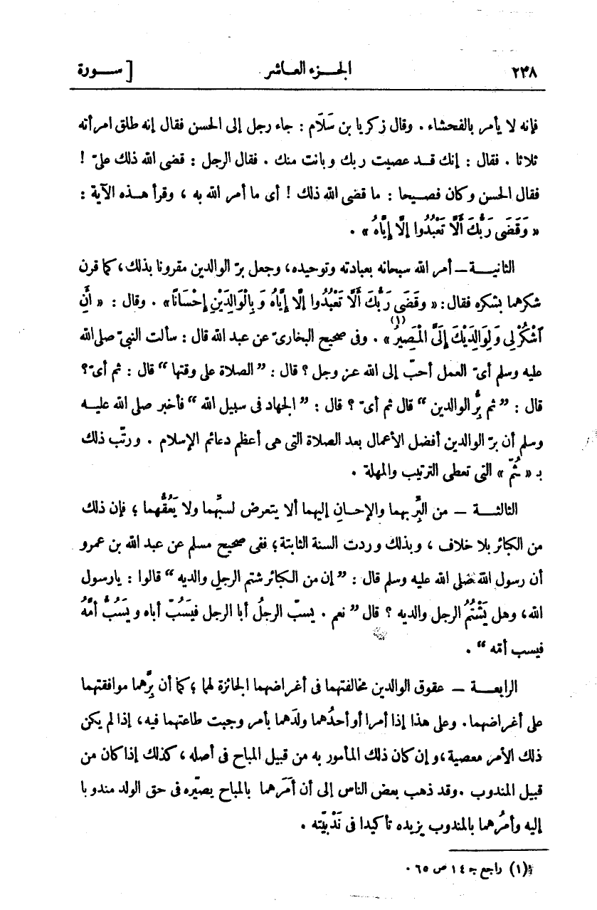 فَإِنَّهُ لَا يَأْمُرُ بِالْفَحْشَاءِ. وَقَالَ زَكَرِيَّا بْنُ سَلَّامٍ: جَاءَ رَجُلٌ إِلَى الْحَسَنِ فَقَالَ إِنَّهُ طَلَّقَ امْرَأَتَهُ ثَلَاثًا. فَقَالَ: إِنَّكَ قَدْ عَصَيْتَ رَبَّكَ وَبَانَتْ مِنْكَ. فَقَالَ الرَّجُلُ: قَضَى اللَّهُ ذَلِكَ عَلَيَّ! فَقَالَ الْحَسَنُ وَكَانَ فَصِيحًا: مَا قَضَى اللَّهُ ذَلِكَ أَيْ مَا أَمَرَ اللَّهُ بِهِ، وَقَرَأَ هَذِهِ الْآيَةَ:" وَقَضى رَبُّكَ أَلَّا تَعْبُدُوا إِلَّا إِيَّاهُ". الثَّانِيَةُ- أَمَرَ اللَّهُ سُبْحَانَهُ بِعِبَادَتِهِ وَتَوْحِيدِهِ، وَجَعَلَ بِرَّ الْوَالِدَيْنِ مَقْرُونًا بِذَلِكَ، كَمَا قَرَنَ شُكْرَهُمَا بِشُكْرِهِ فَقَالَ:" وَقَضى رَبُّكَ أَلَّا تَعْبُدُوا إِلَّا إِيَّاهُ وَبِالْوالِدَيْنِ إِحْساناً". وَقَالَ:" أَنِ اشْكُرْ لِي وَلِوالِدَيْكَ إِلَيَّ الْمَصِيرُ «١» ". وَفِي صَحِيحِ الْبُخَارِيِّ عَنْ عَبْدِ اللَّهِ قَالَ: سَأَلْتُ النَّبِيَّ صَلَّى اللَّهُ عَلَيْهِ وَسَلَّمَ أَيُّ الْعَمَلِ أَحَبُّ إِلَى اللَّهِ عَزَّ وَجَلَّ؟ قَالَ:" الصَّلَاةُ عَلَى وَقْتِهَا" قَالَ: ثُمَّ أَيُّ؟ قَالَ:" ثُمَّ بِرُّ الْوَالِدَيْنِ" قَالَ ثُمَّ أَيُّ؟ قَالَ:" الْجِهَادُ فِي سَبِيلِ اللَّهِ" فَأَخْبَرَ صَلَّى اللَّهُ عَلَيْهِ وَسَلَّمَ أَنَّ بِرَّ الْوَالِدَيْنِ أَفْضَلُ الْأَعْمَالِ بَعْدَ الصَّلَاةِ الَّتِي هِيَ أَعْظَمُ دَعَائِمِ الْإِسْلَامِ. وَرَتَّبَ ذَلِكَ" بِثُمَّ" الَّتِي تُعْطِي التَّرْتِيبَ وَالْمُهْلَةَ. الثَّالِثَةُ- مِنَ الْبِرِّ بِهِمَا وَالْإِحْسَانِ إِلَيْهِمَا أَلَّا يَتَعَرَّضَ لِسَبِّهِمَا وَلَا يَعُقَّهُمَا، فَإِنَّ ذَلِكَ مِنَ الْكَبَائِرِ بِلَا خِلَافٍ، وَبِذَلِكَ وَرَدَتِ السُّنَّةُ الثَّابِتَةُ، فَفِي صَحِيحِ مُسْلِمٍ عَنْ عَبْدِ اللَّهِ بْنِ عَمْرٍو أَنَّ رَسُولَ اللَّهِ صَلَّى اللَّهُ عَلَيْهِ وَسَلَّمَ قَالَ:" إِنَّ مِنَ الْكَبَائِرِ شَتْمَ الرَّجُلِ وَالِدَيْهِ" قَالُوا: يَا رَسُولَ اللَّهِ، وَهَلْ يَشْتُمُ الرَّجُلُ وَالِدَيْهِ؟ قَالَ" نَعَمْ. يَسُبُّ الرَّجُلُ أَبَا الرَّجُلِ فَيَسُبُّ أَبَاهُ وَيَسُبُّ أُمَّهُ فَيَسُبُّ أُمَّهُ". الرَّابِعَةُ- عُقُوقُ الْوَالِدَيْنِ مُخَالَفَتُهُمَا فِي أَغْرَاضِهِمَا الْجَائِزَةِ لَهُمَا، كَمَا أَنَّ بِرَّهُمَا مُوَافَقَتُهُمَا عَلَى أَغْرَاضِهِمَا. وَعَلَى هَذَا إِذَا أَمَرَا أَوْ أَحَدُهُمَا وَلَدَهُمَا بِأَمْرٍ وَجَبَتْ طَاعَتُهُمَا فِيهِ، إِذَا لَمْ يَكُنْ ذَلِكَ الْأَمْرُ مَعْصِيَةً، وَإِنْ كَانَ ذَلِكَ الْمَأْمُورُ بِهِ مِنْ قَبِيلِ الْمُبَاحِ فِي أَصْلِهِ، وَكَذَلِكَ إِذَا كَانَ مِنْ قَبِيلِ الْمَنْدُوبِ. وَقَدْ ذَهَبَ بَعْضُ النَّاسِ إِلَى أَنَّ أَمْرَهُمَا بِالْمُبَاحِ يُصَيِّرُهُ فِي حَقِّ الْوَلَدِ مَنْدُوبًا إِلَيْهِ وَأَمْرَهُمَا بِالْمَنْدُوبِ يَزِيدُهُ تأكيدا في ندبيته.
