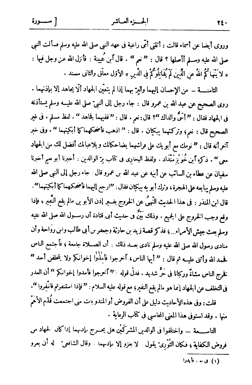 وَرُوِيَ أَيْضًا عَنْ أَسْمَاءَ قَالَتْ: أَتَتْنِي أُمِّي رَاغِبَةً فِي عَهْدِ النَّبِيِّ صَلَّى اللَّهُ عَلَيْهِ وَسَلَّمَ فَسَأَلْتُ النَّبِيَّ صَلَّى اللَّهُ عَلَيْهِ وَسَلَّمَ أأصلها؟ قال:" نعم". قال ابن عينية: فَأَنْزَلَ اللَّهُ عَزَّ وَجَلَّ فِيهَا:" لَا يَنْهاكُمُ اللَّهُ عَنِ الَّذِينَ لَمْ يُقاتِلُوكُمْ فِي الدِّينِ" الْأَوَّلُ مُعَلَّقٌ وَالثَّانِي مُسْنَدٌ. الثَّامِنَةُ- مِنَ الْإِحْسَانِ إِلَيْهِمَا وَالْبِرِّ بِهِمَا إِذَا لَمْ يَتَعَيَّنِ الْجِهَادُ أَلَّا يُجَاهَدَ إِلَّا بِإِذْنِهِمَا. رَوَى الصَّحِيحُ عَنْ عَبْدِ اللَّهِ بْنِ عَمْرٍو قَالَ: جَاءَ رَجُلٌ إِلَى النَّبِيِّ صَلَّى اللَّهُ عَلَيْهِ وَسَلَّمَ يَسْتَأْذِنُهُ فِي الْجِهَادِ فَقَالَ:" أَحَيٌّ وَالِدَاكَ"؟ قَالَ نَعَمْ. قَالَ:" فَفِيهِمَا فَجَاهِدْ". لَفْظُ مُسْلِمٍ. فِي غَيْرِ الصَّحِيحِ قَالَ: نَعَمْ، وَتَرَكْتُهُمَا يَبْكِيَانِ. قَالَ:" اذْهَبْ فَأَضْحِكْهُمَا كَمَا أَبْكَيْتَهُمَا". وَفِي خَبَرٍ آخَرَ أَنَّهُ قَالَ:" نَوْمُكَ مَعَ أَبَوَيْكَ عَلَى فِرَاشِهِمَا يُضَاحِكَانِكَ وَيُلَاعِبَانِكَ أَفْضَلُ لَكَ مِنَ الْجِهَادِ مَعِي". ذَكَرَهُ ابْنُ خُوَيْزِ مَنْدَادَ. وَلَفْظُ الْبُخَارِيِّ فِي كِتَابِ بِرِّ الْوَالِدَيْنِ: أَخْبَرَنَا أَبُو نُعَيْمٍ أَخْبَرَنَا سُفْيَانُ عَنْ عَطَاءِ بْنِ السَّائِبِ عَنْ أَبِيهِ عَنْ عَبْدِ اللَّهِ بْنِ عَمْرٍو قَالَ: جَاءَ رَجُلٌ إِلَى النَّبِيِّ صَلَّى اللَّهُ عَلَيْهِ وَسَلَّمَ يُبَايِعُهُ عَلَى الْهِجْرَةِ، وَتَرَكَ أَبَوَيْهِ يَبْكِيَانِ فَقَالَ:" ارْجِعْ إِلَيْهِمَا فَأَضْحِكْهُمَا كَمَا أَبْكَيْتَهُمَا". قَالَ ابْنُ الْمُنْذِرِ: فِي هَذَا الْحَدِيثِ النَّهْيُ عَنِ الْخُرُوجِ بِغَيْرِ إِذْنِ الْأَبَوَيْنِ مَا لَمْ يَقَعِ النَّفِيرُ، فَإِذَا وَقَعَ وَجَبَ الْخُرُوجُ عَلَى الْجَمِيعِ. وَذَلِكَ بَيِّنٌ فِي حَدِيثِ أَبِي قَتَادَةَ أَنَّ رَسُولَ اللَّهِ صَلَّى اللَّهُ عَلَيْهِ وَسَلَّمَ بَعَثَ جَيْشَ الْأُمَرَاءِ ... ، فَذَكَرَ قِصَّةَ زَيْدِ بْنِ حَارِثَةَ وَجَعْفَرِ بْنِ أبى طالب وابن رواحة وأن منادى وسول اللَّهِ صَلَّى اللَّهُ عَلَيْهِ وَسَلَّمَ نَادَى بَعْدَ ذَلِكَ: أَنَّ الصَّلَاةَ جَامِعَةٌ، فَاجْتَمَعَ النَّاسُ فَحَمِدَ اللَّهَ وَأَثْنَى عَلَيْهِ ثُمَّ قَالَ:" أَيُّهَا النَّاسُ، اخْرُجُوا فَأَمِدُّوا «١» إِخْوَانَكُمْ وَلَا يَتَخَلَّفَنَّ أَحَدٌ" فَخَرَجَ النَّاسُ مُشَاةً وَرُكْبَانًا فِي حَرٍّ شَدِيدٍ. فَدَلَّ قَوْلُهُ:" اخْرُجُوا فَأَمِدُّوا إِخْوَانَكُمْ" أَنَّ الْعُذْرَ فِي التخلف عن الجهاد إنما هما لَمْ يَقَعِ النَّفِيرُ، مَعَ قَوْلِهِ عَلَيْهِ السَّلَامُ:" فَإِذَا اسْتُنْفِرْتُمْ فَانْفِرُوا". قُلْتُ: وَفِي هَذِهِ الْأَحَادِيثِ دَلِيلٌ عَلَى أَنَّ الْمَفْرُوضَ أَوِ الْمَنْدُوبَاتِ مَتَى اجْتَمَعَتْ قُدِّمَ الْأَهَمُّ مِنْهَا. وَقَدِ اسْتَوْفَى هَذَا الْمَعْنَى الْمُحَاسِبِيُّ فِي كِتَابِ الرِّعَايَةِ. التَّاسِعَةُ- وَاخْتَلَفُوا فِي الْوَالِدَيْنِ الْمُشْرِكَيْنِ هَلْ يَخْرُجُ بِإِذْنِهِمَا إِذَا كَانَ الْجِهَادُ مِنْ فَرَوْضِ الْكِفَايَةِ، فَكَانَ الثَّوْرِيُّ يَقُولُ: لَا يَغْزُو إِلَّا بِإِذْنِهِمَا. وَقَالَ الشَّافِعِيُّ: له أن يغزو