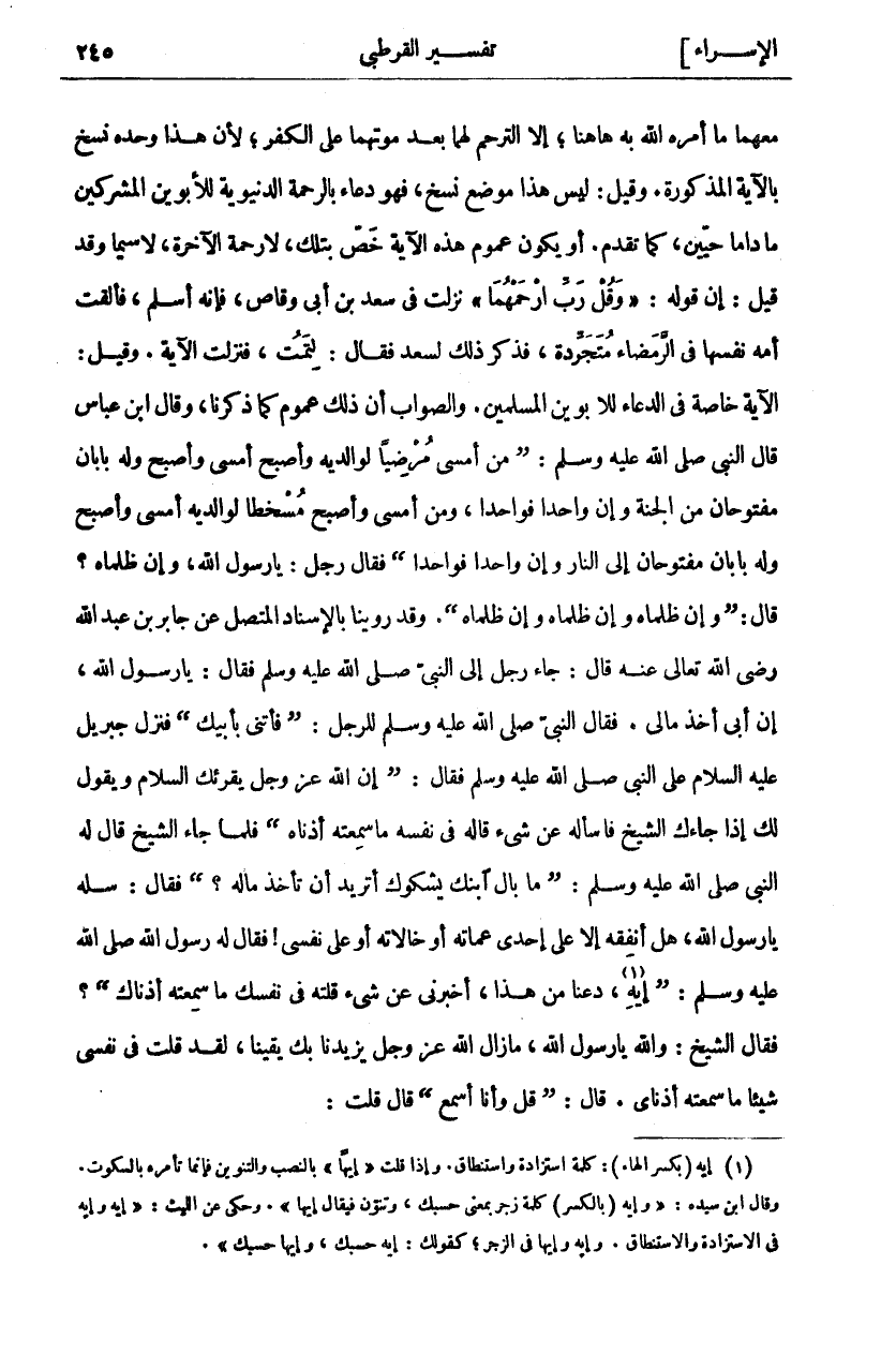 مَعَهُمَا مَا أَمَرَهُ اللَّهُ بِهِ هَاهُنَا، إِلَّا التَّرَحُّمَ لَهُمَا بَعْدَ مَوْتِهِمَا عَلَى الْكُفْرِ، لِأَنَّ هَذَا وَحْدَهُ نُسِخَ بِالْآيَةِ الْمَذْكُورَةِ. وَقِيلَ: لَيْسَ هَذَا مَوْضِعُ نَسْخٍ، فَهُوَ دُعَاءٌ بِالرَّحْمَةِ الدُّنْيَوِيَّةِ لِلْأَبَوَيْنِ الْمُشْرِكَيْنِ مَا دَامَا حَيَّيْنِ، كَمَا تَقَدَّمَ. أَوْ يَكُونُ عُمُومُ هَذِهِ الْآيَةِ خُصَّ بِتِلْكَ، لَا رَحْمَةِ الْآخِرَةِ، لَا سِيَّمَا وَقَدْ قِيلَ إِنَّ قَوْلَهُ:" وَقُلْ رَبِّ ارْحَمْهُما" نَزَلَتْ فِي سَعْدِ بْنِ أَبِي وَقَّاصٍ، فَإِنَّهُ أَسْلَمَ، فَأَلْقَتْ أُمُّهُ نَفْسَهَا فِي الرَّمْضَاءِ مُتَجَرِّدَةً، فَذُكِرَ ذَلِكَ لسعد فعال: لِتَمُتْ، فَنَزَلَتِ الْآيَةُ. وَقِيلَ: الْآيَةُ خَاصَّةً فِي الدُّعَاءِ لِلْأَبَوَيْنِ الْمُسْلِمَيْنِ. وَالصَّوَابُ أَنَّ ذَلِكَ عُمُومٌ كَمَا ذَكَرْنَا، وَقَالَ ابْنُ عَبَّاسٍ قَالَ النَّبِيُّ صَلَّى اللَّهُ عَلَيْهِ وَسَلَّمَ:" مَنْ أَمْسَى مُرْضِيًا لِوَالِدَيْهِ وَأَصْبَحَ أَمْسَى وَأَصْبَحَ وَلَهُ بَابَانِ مَفْتُوحَانِ مِنَ الْجَنَّةِ وَإِنْ وَاحِدًا فَوَاحِدًا. وَمَنْ أَمْسَى وَأَصْبَحَ مُسْخِطًا لِوَالِدَيْهِ أَمْسَى وَأَصْبَحَ وَلَهُ بَابَانِ مَفْتُوحَانِ إِلَى النَّارِ وَإِنْ وَاحِدًا فَوَاحِدًا" فَقَالَ رَجُلٌ: يَا رَسُولَ اللَّهِ، وَإِنْ ظَلَمَاهُ؟ قَالَ:" وَإِنْ ظَلَمَاهُ وَإِنْ ظَلَمَاهُ وَإِنْ ظَلَمَاهُ". وَقَدْ رُوِينَا بِالْإِسْنَادِ الْمُتَّصِلِ عَنْ جَابِرِ بْنِ عَبْدِ اللَّهِ رَضِيَ اللَّهُ تَعَالَى عَنْهُ قَالَ: جَاءَ رَجُلٌ إِلَى النَّبِيِّ صَلَّى اللَّهُ عَلَيْهِ وَسَلَّمَ فَقَالَ: يَا رَسُولَ اللَّهِ، إِنَ أَبِي أَخَذَ مَالِي. فَقَالَ النَّبِيُّ صَلَّى اللَّهُ عَلَيْهِ وَسَلَّمَ لِلرَّجُلِ:" فَأْتِنِي بِأَبِيكَ" فَنَزَلَ جِبْرِيلُ عَلَيْهِ السَّلَامُ عَلَى النَّبِيِّ صَلَّى اللَّهُ عَلَيْهِ وَسَلَّمَ فَقَالَ:" إِنَّ اللَّهَ عَزَّ وَجَلَّ يُقْرِئُكَ السَّلَامَ وَيَقُولُ لك إذا جاءك الشيخ فاسأله عن شي قَالَهُ فِي نَفْسِهِ مَا سَمِعَتْهُ أُذُنَاهُ" فَلَمَّا جَاءَ الشَّيْخُ قَالَ لَهُ النَّبِيَّ صَلَّى اللَّهُ عَلَيْهِ وَسَلَّمَ:" مَا بَالُ ابْنِكَ يَشْكُوكَ أَتُرِيدُ أَنْ تَأْخُذَ مَالَهُ"؟ فَقَالَ: سَلْهُ يَا رَسُولَ اللَّهِ، هَلْ أُنْفِقُهُ إِلَّا عَلَى إِحْدَى عَمَّاتِهِ أَوْ خَالَاتِهِ أَوْ عَلَى نَفْسِي! فَقَالَ لَهُ وسول اللَّهِ صَلَّى اللَّهُ عَلَيْهِ وَسَلَّمَ:" إِيهِ «١»، دَعْنَا من هذا أخبرني عن شي قُلْتَهُ فِي نَفْسِكَ مَا سَمِعَتْهُ أُذُنَاكَ"؟ فَقَالَ الشَّيْخُ: وَاللَّهِ يَا رَسُولَ اللَّهِ، مَا زَالَ اللَّهُ عَزَّ وَجَلَّ يَزِيدُنَا بِكَ يَقِينًا، لَقَدْ قُلْتُ فِي نَفْسِي شَيْئًا مَا سَمِعَتْهُ أُذُنَايَ. قال:" قل وأنا أسمع" قال قلت: