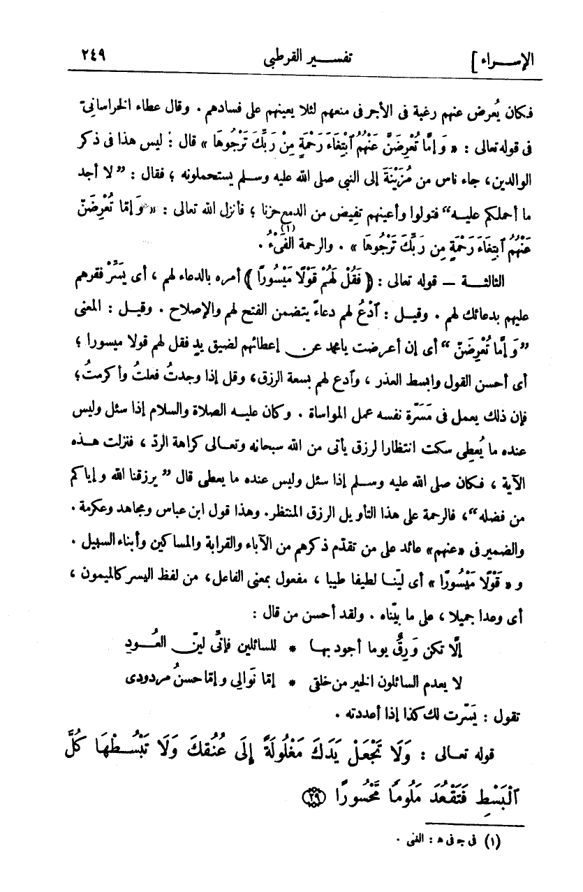 فَكَانَ يَعْرِضُ عَنْهُمْ رَغْبَةً فِي الْأَجْرِ فِي مَنْعِهِمْ لِئَلَّا يُعِينَهُمْ عَلَى فَسَادِهِمْ. وَقَالَ عَطَاءٌ الْخُرَاسَانِيُّ فِي قَوْلِهِ تَعَالَى" وَإِمَّا تُعْرِضَنَّ عَنْهُمُ ابْتِغاءَ رَحْمَةٍ مِنْ رَبِّكَ تَرْجُوها" قَالَ: لَيْسَ هَذَا فِي ذِكْرِ الْوَالِدَيْنِ، جَاءَ نَاسٌ مِنْ مُزَيْنَةَ إِلَى النَّبِيِّ صَلَّى اللَّهُ عَلَيْهِ وَسَلَّمَ يَسْتَحْمِلُونَهُ، فَقَالَ:" لَا أَجِدُ مَا أَحْمِلُكُمْ عَلَيْهِ" فَتَوَلَّوْا وَأَعْيُنُهُمْ تَفِيضُ مِنَ الدَّمْعِ حَزَنًا، فَأَنْزَلَ اللَّهُ تَعَالَى:" وَإِمَّا تُعْرِضَنَّ عَنْهُمُ ابْتِغاءَ رَحْمَةٍ مِنْ رَبِّكَ تَرْجُوها". والرحمة الفيء «١». الثَّالِثَةُ- قَوْلُهُ تَعَالَى: (فَقُلْ لَهُمْ قَوْلًا مَيْسُوراً) أَمَرَهُ بِالدُّعَاءِ لَهُمْ، أَيْ يَسِّرْ فَقْرَهُمْ عَلَيْهِمْ بِدُعَائِكَ لَهُمْ. وَقِيلَ: ادْعُ لَهُمْ دُعَاءً يَتَضَمَّنُ الْفَتْحَ لَهُمْ وَالْإِصْلَاحَ. وَقِيلَ: الْمَعْنَى" وَإِمَّا تُعْرِضَنَّ" أَيْ إِنْ أَعْرَضْتَ يَا مُحَمَّدُ عَنْ إِعْطَائِهِمْ لِضِيقِ يَدٍ فَقُلْ لَهُمْ قَوْلًا مَيْسُورًا، أَيْ أَحْسِنِ الْقَوْلَ وَابْسُطِ الْعُذْرَ، وَادْعُ لَهُمْ بِسَعَةِ الرِّزْقِ، وَقُلْ إِذَا وَجَدْتُ فَعَلْتُ وَأَكْرَمْتُ، فَإِنَّ ذَلِكَ يَعْمَلُ فِي مَسَرَّةِ نَفْسِهِ عَمَلَ الْمُوَاسَاةِ. وَكَانَ عَلَيْهِ الصَّلَاةُ وَالسَّلَامُ إِذَا سُئِلَ وَلَيْسَ عِنْدَهُ مَا يُعْطِي سَكَتَ انْتِظَارًا لِرِزْقٍ يَأْتِي مِنَ اللَّهِ سُبْحَانَهُ وَتَعَالَى كَرَاهَةَ الرَّدِّ، فَنَزَلَتْ هَذِهِ الْآيَةُ، فَكَانَ صَلَّى اللَّهُ عَلَيْهِ وَسَلَّمَ إِذَا سُئِلَ وَلَيْسَ عِنْدَهُ مَا يُعْطِي قَالَ:" يَرْزُقُنَا اللَّهُ وَإِيَّاكُمْ مِنْ فَضْلِهِ". فَالرَّحْمَةُ عَلَى هَذَا التَّأْوِيلِ الرِّزْقُ الْمُنْتَظَرُ. وَهَذَا قَوْلُ ابْنِ عَبَّاسٍ وَمُجَاهِدٍ وَعِكْرِمَةَ. وَ" قَوْلًا مَيْسُوراً" أَيْ لَيِّنًا لَطِيفًا طَيِّبًا، مَفْعُولٌ بِمَعْنَى الْفَاعِلِ، مِنْ لَفْظِ الْيُسْرِ كَالْمَيْمُونِ، أَيْ وَعْدًا جَمِيلًا، عَلَى مَا بَيَّنَّاهُ. وَلَقَدْ أَحْسَنَ مَنْ قَالَ: