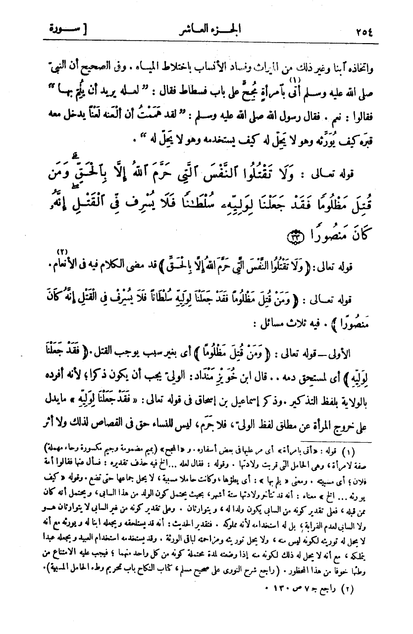 قَوْلُهُ تَعَالَى: (وَلا تَقْتُلُوا النَّفْسَ الَّتِي حَرَّمَ اللَّهُ إِلَّا بِالْحَقِّ) قَدْ مَضَّى الْكَلَامُ فِيهِ فِي الْأَنْعَامِ «٢». قَوْلُهُ تَعَالَى: (وَمَنْ قُتِلَ مَظْلُوماً فَقَدْ جَعَلْنا لِوَلِيِّهِ سُلْطاناً فَلا يُسْرِفْ فِي الْقَتْلِ إِنَّهُ كانَ مَنْصُوراً). فِيهِ ثَلَاثُ مَسَائِلَ: الْأُولَى- قَوْلُهُ تَعَالَى: (وَمَنْ قُتِلَ مَظْلُوماً) أَيْ بِغَيْرِ سَبَبٍ يُوجِبُ الْقَتْلَ. (فَقَدْ جَعَلْنا لِوَلِيِّهِ) أي لمستحق دمه .. قال خويز: الْوَلِيُّ يَجِبُ أَنْ يَكُونَ ذَكَرًا، لِأَنَّهُ أَفْرَدَهُ بِالْوِلَايَةِ بِلَفْظِ التَّذْكِيرِ. وَذَكَرَ إِسْمَاعِيلُ بْنُ إِسْحَاقَ فِي قَوْلِهِ تَعَالَى:" فَقَدْ جَعَلْنا لِوَلِيِّهِ" مَا يَدُلُّ عَلَى خُرُوجِ الْمَرْأَةِ عَنْ مُطْلَقِ لَفْظِ الْوَلِيِّ، فَلَا جَرَمَ، لَيْسَ لِلنِّسَاءِ حَقٌّ فِي القصاص لذلك ولا أثر