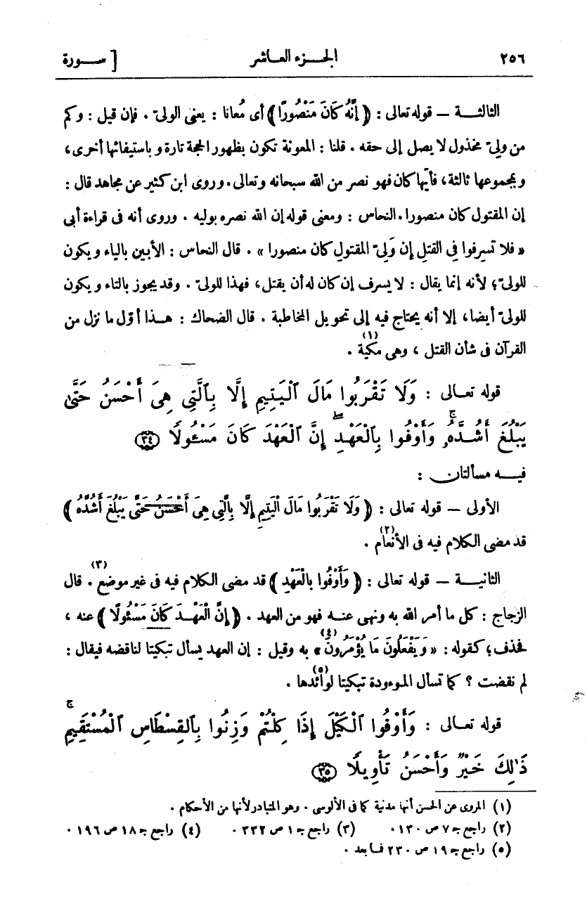 الثالثة- قوله تعالى: (إِنَّهُ كانَ مَنْصُوراً) أَيْ مُعَانًا، يَعْنِي الْوَلِيَّ. فَإِنْ قِيلَ: وَكَمْ مِنْ وَلِيٍّ مَخْذُولٍ لَا يَصِلُ إِلَى حَقِّهِ. قُلْنَا: الْمَعُونَةُ تَكُونُ بِظُهُورِ الْحُجَّةِ تَارَةً وَبِاسْتِيفَائِهَا أُخْرَى، وَبِمَجْمُوعِهِمَا ثَالِثَةً، فَأَيُّهَا كَانَ فَهُوَ نَصْرٌ مِنَ اللَّهِ سُبْحَانَهُ وَتَعَالَى. وَرَوَى ابْنُ كَثِيرٍ عَنْ مُجَاهِدٍ قَالَ: إِنَّ الْمَقْتُولَ كَانَ مَنْصُورًا. النَّحَّاسُ: وَمَعْنَى قَوْلِهِ إِنَّ اللَّهَ نَصَرَهُ بِوَلِيِّهِ. وَرُوِيَ أَنَّهُ فِي قِرَاءَةِ أُبَيٍّ" فَلَا تُسْرِفُوا فِي الْقَتْلِ إِنَّ وَلِيَّ المقتول كان منصورا". قال النحاس: إلا بين بِالْيَاءِ وَيَكُونُ لِلْوَلِيِّ، لِأَنَّهُ إِنَّمَا يُقَالُ: لَا يُسْرِفُ إِنْ كَانَ لَهُ أَنْ يَقْتُلَ، فَهَذَا لِلْوَلِيِّ. وَقَدْ يَجُوزُ بِالتَّاءِ وَيَكُونُ لِلْوَلِيِّ أَيْضًا، إِلَّا أَنَّهُ يَحْتَاجُ فِيهِ إِلَى تَحْوِيلِ الْمُخَاطَبَةِ. قَالَ الضَّحَّاكُ: هَذَا أَوَّلُ مَا نَزَلَ مِنَ القرآن في شأن القتل. وهى مكية «١».