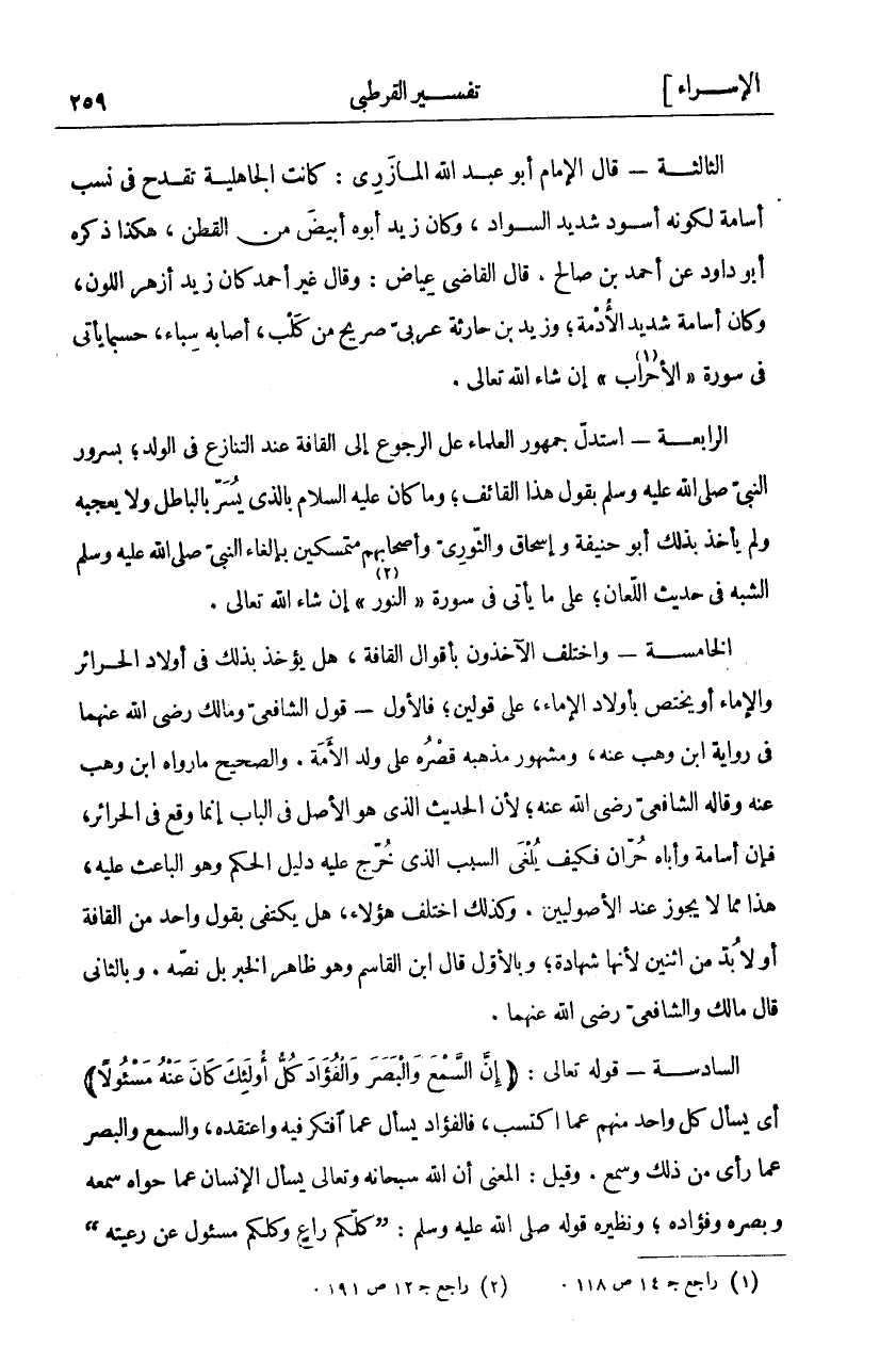 الثَّالِثَةُ- قَالَ الْإِمَامُ أَبُو عَبْدِ اللَّهِ الْمَازِرِيُّ: كَانَتِ الْجَاهِلِيَّةُ تَقْدَحُ فِي نَسَبِ أُسَامَةَ لِكَوْنِهِ أَسْوَدُ شَدِيدُ السَّوَادِ، وَكَانَ زَيْدٌ أَبُوهُ أَبْيَضَ الْقُطْنِ، هَكَذَا ذَكَرَهُ أَبُو دَاوُدَ عَنْ أَحْمَدَ بْنِ صَالِحٍ. قَالَ الْقَاضِي عِيَاضٌ: وَقَالَ غَيْرُ أَحْمَدَ كَانَ زَيْدٌ أَزْهَرَ اللَّوْنِ، وَكَانَ أُسَامَةُ شَدِيدَ الْأُدْمَةِ، وَزَيْدُ بْنُ حَارِثَةَ عَرَبِيٌّ صَرِيحٌ مِنْ كَلْبٍ، أَصَابَهُ سِبَاءٌ، حَسْبَمَا يَأْتِي فِي سُورَةِ" الْأَحْزَابِ «١» " إِنْ شَاءَ اللَّهُ تَعَالَى. الرَّابِعَةُ- اسْتَدَلَّ جُمْهُورُ الْعُلَمَاءِ عَلَى الرُّجُوعِ إِلَى الْقَافَةِ عِنْدَ التَّنَازُعِ فِي الْوَلَدِ، بِسُرُورِ النَّبِيِّ صَلَّى اللَّهُ عَلَيْهِ وَسَلَّمَ بِقَوْلِ هَذَا الْقَائِفِ، وَمَا كَانَ عَلَيْهِ السَّلَامُ بِالَّذِي يُسَرُّ بِالْبَاطِلِ وَلَا يُعْجِبُهُ. وَلَمْ يَأْخُذْ بِذَلِكَ أَبُو حَنِيفَةَ وَإِسْحَاقُ وَالثَّوْرِيُّ وَأَصْحَابُهُمْ مُتَمَسِّكِينَ بِإِلْغَاءِ النَّبِيِّ صَلَّى اللَّهُ عَلَيْهِ وَسَلَّمَ الشَّبَهَ فِي حَدِيثِ اللِّعَانِ، عَلَى مَا يَأْتِي فِي سُورَةِ" النُّورِ «٢» " إِنْ شَاءَ اللَّهُ تَعَالَى. الْخَامِسَةُ- وَاخْتَلَفَ الْآخِذُونَ بِأَقْوَالِ الْقَافَةِ، هَلْ يُؤْخَذُ بِذَلِكَ فِي أَوْلَادِ الْحَرَائِرِ وَالْإِمَاءِ أَوْ يَخْتَصُّ بِأَوْلَادِ الْإِمَاءِ، عَلَى قَوْلَيْنِ، فَالْأَوَّلُ: قَوْلُ الشَّافِعِيِّ وَمَالِكٍ رَضِيَ اللَّهُ عَنْهُمَا فِي رِوَايَةِ ابْنِ وَهْبٍ عَنْهُ، وَمَشْهُورُ مَذْهَبِهِ قَصْرُهُ عَلَى وَلَدِ الْأَمَةِ. وَالصَّحِيحُ مَا رَوَاهُ ابْنُ وَهْبٍ عَنْهُ وَقَالَ الشَّافِعِيُّ رَضِيَ اللَّهُ عَنْهُ، لِأَنَّ الْحَدِيثَ الَّذِي هُوَ الْأَصْلُ فِي الْبَابِ إِنَّمَا وَقَعَ فِي الْحَرَائِرِ، فَإِنَّ أُسَامَةَ وَأَبَاهُ حُرَّانِ فَكَيْفَ يُلْغَى السَّبَبُ الَّذِي خَرَجَ عَلَيْهِ دَلِيلُ الْحُكْمِ وَهُوَ الْبَاعِثُ عَلَيْهِ، هَذَا مِمَّا لَا يَجُوزُ عِنْدَ الْأُصُولِيِّينَ. وَكَذَلِكَ اخْتَلَفَ هَؤُلَاءِ، هَلْ يُكْتَفَى بِقَوْلِ وَاحِدٍ مِنَ الْقَافَةِ أَوْ لَا بُدَّ مِنَ اثْنَيْنِ لِأَنَّهَا شَهَادَةٌ، وَبِالْأَوَّلِ قَالَ ابْنُ الْقَاسِمِ وَهُوَ ظَاهِرُ الْخَبَرِ بَلْ نَصُّهُ. وَبِالثَّانِي قَالَ مَالِكٌ وَالشَّافِعِيُّ رَضِيَ اللَّهُ عَنْهُمَا. السَّادِسَةُ- قَوْلُهُ تَعَالَى: (إِنَّ السَّمْعَ وَالْبَصَرَ وَالْفُؤادَ كُلُّ أُولئِكَ كانَ عَنْهُ مَسْؤُلًا) أَيْ يُسْأَلُ كُلُّ وَاحِدٍ مِنْهُمْ عَمَّا اكْتَسَبَ، فَالْفُؤَادُ يُسْأَلُ عَمَّا افْتَكَرَ فِيهِ وَاعْتَقَدَهُ، وَالسَّمْعُ والبصر عما رأس مِنْ ذَلِكَ وَسَمِعَ. وَقِيلَ: الْمَعْنَى أَنَّ اللَّهَ سُبْحَانَهُ وَتَعَالَى يَسْأَلُ الْإِنْسَانَ عَمَّا حَوَاهُ سَمْعُهُ وَبَصَرُهُ وَفُؤَادُهُ، وَنَظِيرُهُ قَوْلُهُ صَلَّى اللَّهُ عَلَيْهِ وَسَلَّمَ:" كُلُّكُمْ رَاعٍ وَكُلُّكُمْ مَسْئُولٌ عَنْ رَعِيَّتِهِ"