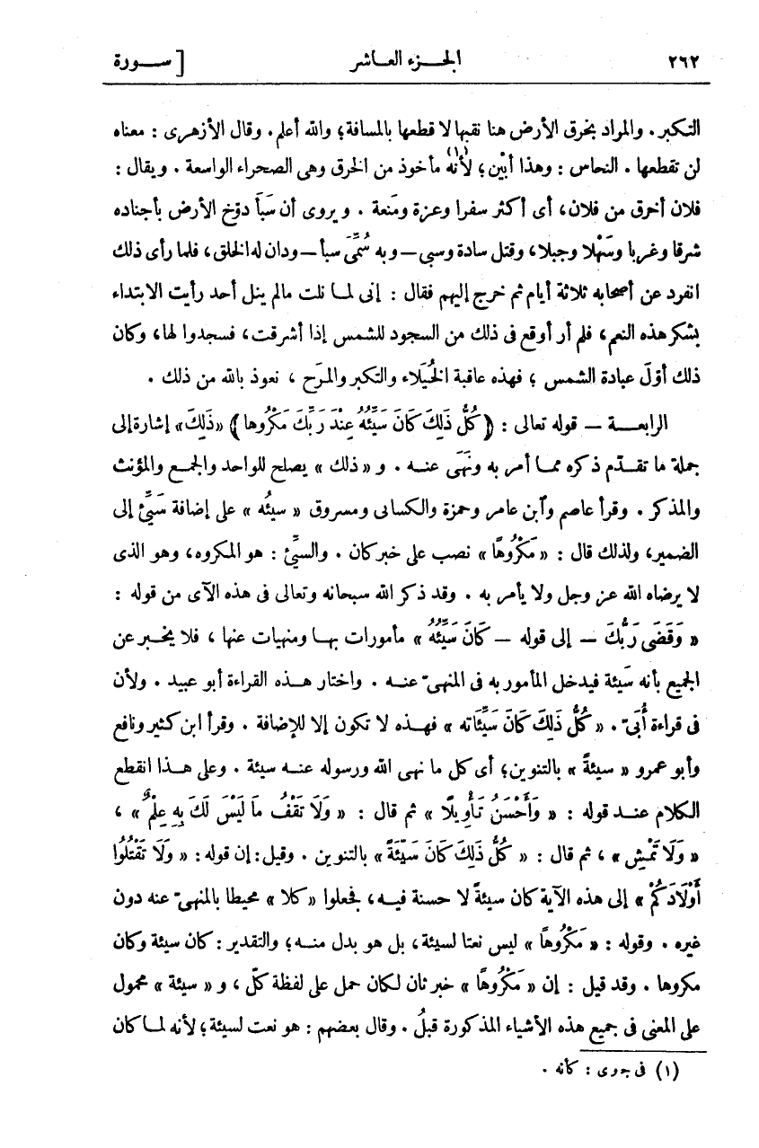 التَّكَبُّرُ وَالْمُرَادُ بِخَرْقِ الْأَرْضِ هُنَا نَقْبُهَا لَا قَطْعُهَا بِالْمَسَافَةِ، وَاللَّهُ أَعْلَمُ. وَقَالَ الْأَزْهَرِيُّ: مَعْنَاهُ لَنْ تَقْطَعَهَا. النَّحَّاسُ: وَهَذَا أَبْيَنُ، لِأَنَّهُ «١» مَأْخُوذٌ مِنَ الْخَرْقِ وَهِيَ الصَّحْرَاءُ الْوَاسِعَةُ. وَيُقَالُ: فُلَانٌ أَخْرَقُ مِنْ فُلَانٍ، أَيْ أَكْثَرُ سَفَرًا وَعِزَّةً وَمَنَعَةً. وَيُرْوَى أَنَّ سَبَأً دَوَّخَ الْأَرْضَ بِأَجْنَادِهِ شَرْقًا وَغَرْبًا وَسَهْلًا وَجَبَلًا، وَقَتَلَ سَادَةً وَسَبَى- وَبِهِ سُمِّيَ سَبَأٌ- وَدَانَ لَهُ الْخَلْقُ، فَلَمَّا رَأَى ذَلِكَ انْفَرَدَ عَنْ أَصْحَابِهِ ثَلَاثَةَ أَيَّامٍ ثُمَّ خَرَجَ إِلَيْهِمْ فَقَالَ: إِنِّي لَمَّا نِلْتُ مَا لَمْ يَنَلْ أَحَدٌ رَأَيْتُ الِابْتِدَاءَ بِشُكْرِ هَذِهِ النِّعَمِ، فَلَمْ أَرَ أَوْقَعَ فِي ذَلِكَ مِنَ السُّجُودِ لِلشَّمْسِ إِذَا أَشْرَقَتْ، فَسَجَدُوا لَهَا، وَكَانَ ذَلِكَ أَوَّلُ عِبَادَةِ الشَّمْسِ، فَهَذِهِ عَاقِبَةُ الْخُيَلَاءِ وَالتَّكَبُّرِ وَالْمَرَحِ، نَعُوذُ بِاللَّهِ مِنْ ذَلِكَ. الرَّابِعَةُ- قَوْلُهُ تَعَالَى: (كُلُّ ذلِكَ كانَ سَيِّئُهُ عِنْدَ رَبِّكَ مَكْرُوهاً) " ذلِكَ" إِشَارَةٌ إِلَى جُمْلَةِ مَا تَقَدَّمَ ذِكْرُهُ مِمَّا أَمَرَ بِهِ وَنَهَى عَنْهُ." ذلِكَ" يَصْلُحُ لِلْوَاحِدِ وَالْجَمْعِ وَالْمُؤَنَّثِ وَالْمُذَكَّرِ. وَقَرَأَ عَاصِمٌ وَابْنُ عَامِرٍ وَحَمْزَةُ وَالْكِسَائِيُّ وَمَسْرُوقٌ" سَيِّئُهُ" عَلَى إِضَافَةِ سَيِّئٍ إِلَى الضَّمِيرِ، وَلِذَلِكَ قَالَ:" مَكْرُوهاً" نُصِبَ عَلَى خَبَرِ كَانَ. وَالسَّيِّءُ: هُوَ الْمَكْرُوهُ، وَهُوَ الَّذِي لَا يَرْضَاهُ اللَّهُ عَزَّ وَجَلَّ وَلَا يَأْمُرُ بِهِ. وَقَدْ ذَكَرَ اللَّهُ سُبْحَانَهُ وَتَعَالَى فِي هَذِهِ الْآيِ مِنْ قَوْلِهِ:" وَقَضى رَبُّكَ"- إِلَى قَوْلِهِ- كَانَ" سَيِّئُهُ" مَأْمُورَاتٌ بِهَا وَمُنْهَيَاتٌ عَنْهَا، فَلَا يُخْبِرُ عَنِ الْجَمِيعِ بِأَنَّهُ سَيِّئَةٌ فَيَدْخُلُ الْمَأْمُورُ بِهِ فِي الْمَنْهِيِّ عَنْهُ. وَاخْتَارَ هَذِهِ الْقِرَاءَةَ أَبُو عُبَيْدٍ. وَلِأَنَّ فِي قِرَاءَةِ أُبَيٍّ." كُلُّ ذَلِكَ كَانَ سَيِّئَاتُهُ" فَهَذِهِ لَا تَكُونُ إِلَّا لِلْإِضَافَةِ. وَقَرَأَ ابْنُ كَثِيرٍ وَنَافِعٌ وَأَبُو عَمْرٍو" سَيِّئَةً" بِالتَّنْوِينِ، أَيْ كُلُّ مَا نَهَى اللَّهُ وَرَسُولُهُ عَنْهُ سَيِّئَةٌ. وَعَلَى هَذَا انْقَطَعَ الْكَلَامُ عِنْدَ قَوْلِهِ:" وَأَحْسَنُ تَأْوِيلًا" ثُمَّ قَالَ:" وَلا تَقْفُ مَا لَيْسَ لَكَ بِهِ عِلْمٌ"،" وَلا تَمْشِ"، ثُمَّ قَالَ:" كُلُّ ذَلِكَ كَانَ سَيِّئَةً" بِالتَّنْوِينِ. وَقِيلَ: إِنَّ قَوْلَهُ:" وَلا تَقْتُلُوا أَوْلادَكُمْ" إِلَى هَذِهِ الْآيَةِ كَانَ سَيِّئَةً لَا حَسَنَةَ فِيهِ، فَجَعَلُوا" كُلًّا" مُحِيطًا بِالْمَنْهِيِّ عَنْهُ دُونَ غَيْرِهِ. وَقَوْلُهُ:" مَكْرُوهاً" لَيْسَ نَعْتًا لِسَيِّئَةٍ، بَلْ هُوَ بَدَلٌ مِنْهُ، وَالتَّقْدِيرُ: كَانَ سَيِّئَةً وَكَانَ مَكْرُوهًا. وَقَدْ قِيلَ: إِنَّ" مَكْرُوهاً" خَبَرٌ ثَانٍ لِكَانَ حُمِلَ عَلَى لَفْظِهِ كُلُّ، وَ" سَيِّئَةٌ" مَحْمُولٌ عَلَى الْمَعْنَى فِي جَمِيعِ هَذِهِ الْأَشْيَاءِ الْمَذْكُورَةِ قَبْلُ. وَقَالَ بَعْضُهُمْ: وَهُوَ نَعْتٌ لِسَيِّئَةٍ، لِأَنَّهُ لَمَّا كان