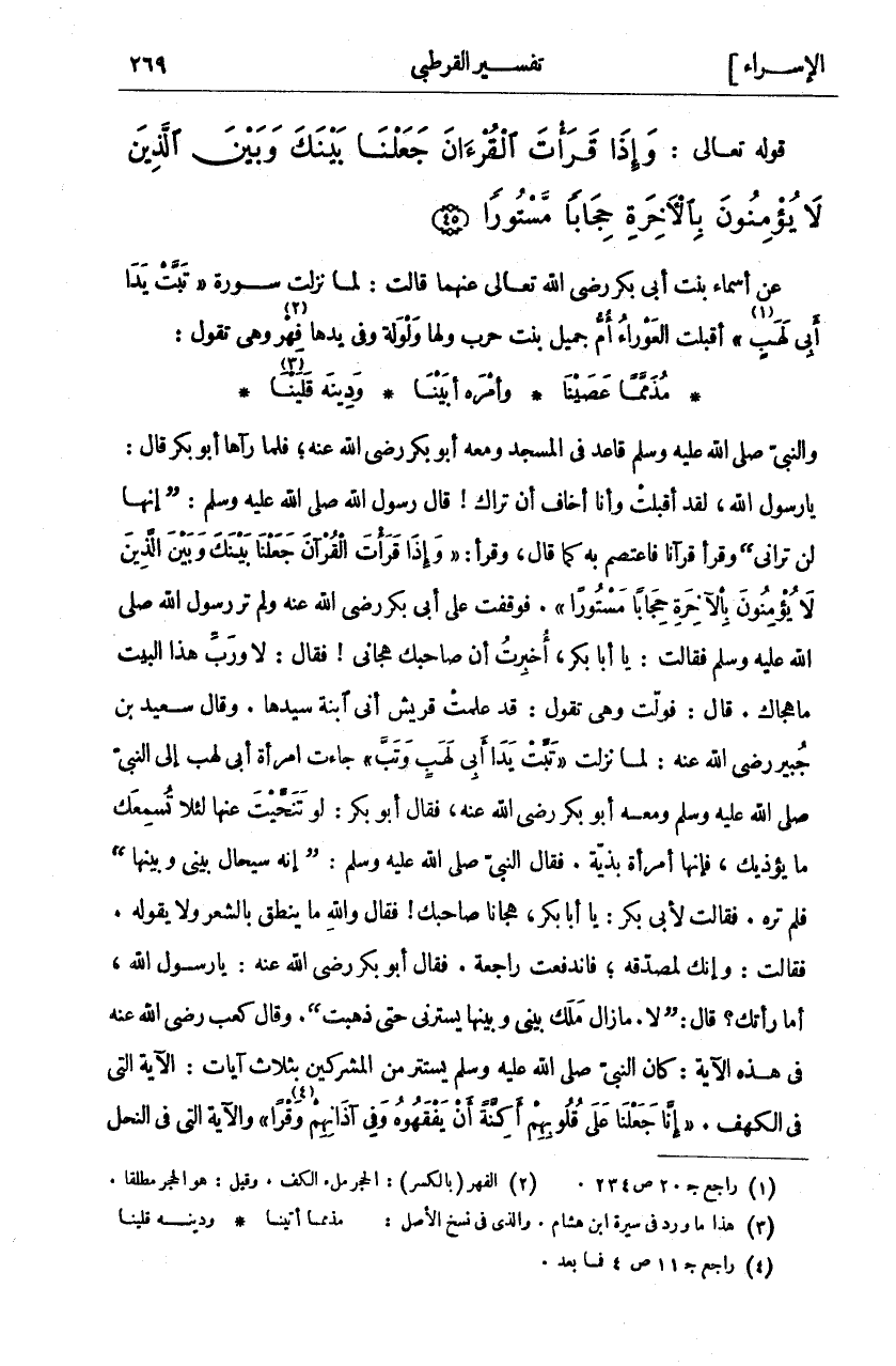 وَالنَّبِيُّ صَلَّى اللَّهُ عَلَيْهِ وَسَلَّمَ قَاعِدٌ فِي الْمَسْجِدِ وَمَعَهُ أَبُو بَكْرٍ رَضِيَ اللَّهُ عَنْهُ، فَلَمَّا رَآهَا أَبُو بَكْرٍ قَالَ: يَا رَسُولَ اللَّهِ، لَقَدْ أَقْبَلَتْ وَأَنَا أَخَافُ أَنْ تَرَاكَ! قَالَ رَسُولُ اللَّهِ صَلَّى اللَّهُ عَلَيْهِ وَسَلَّمَ:" إِنَّهَا لَنْ تَرَانِي" وَقَرَأَ قُرْآنًا فَاعْتَصَمَ بِهِ كَمَا قَالَ. وَقَرَأَ" وَإِذا قَرَأْتَ الْقُرْآنَ جَعَلْنا بَيْنَكَ وَبَيْنَ الَّذِينَ لَا يُؤْمِنُونَ بِالْآخِرَةِ حِجاباً مَسْتُوراً". فَوَقَفَتْ عَلَى أَبِي بَكْرٍ رَضِيَ اللَّهُ عَنْهُ وَلَمْ تَرَ رَسُولَ اللَّهِ صَلَّى اللَّهُ عَلَيْهِ وَسَلَّمَ فَقَالَتْ: يَا أَبَا بَكْرٍ، أُخْبِرْتُ أَنَّ صَاحِبَكَ هَجَانِي! فَقَالَ: لَا وَرَبِّ هَذَا الْبَيْتِ مَا هَجَاكِ. قَالَ: فَوَلَّتْ وَهِيَ تَقُولُ: قَدْ عَلِمَتْ قُرَيْشُ أَنِّي ابْنَةُ سَيِّدِهَا. وَقَالَ سَعِيدُ بْنُ جُبَيْرٍ رَضِيَ اللَّهُ عَنْهُ: لَمَّا نَزَلَتْ" تَبَّتْ يَدا أَبِي لَهَبٍ وَتَبَّ" جَاءَتِ امْرَأَةُ أَبِي لَهَبٍ إِلَى النَّبِيِّ صَلَّى اللَّهُ عَلَيْهِ وَسَلَّمَ وَمَعَهُ أَبُو بَكْرٍ رَضِيَ اللَّهُ عَنْهُ، فَقَالَ أَبُو بَكْرٍ: لَوْ تَنَحَّيْتَ عَنْهَا لِئَلَّا تُسْمِعَكَ مَا يُؤْذِيكَ، فَإِنَّهَا امْرَأَةٌ بَذِيَّةٌ. فَقَالَ النَّبِيُّ صَلَّى اللَّهُ عَلَيْهِ وَسَلَّمَ:" إِنَّهُ سَيُحَالُ بَيْنِي وَبَيْنَهَا" فَلَمْ تَرَهُ. فَقَالَتْ لِأَبِي بَكْرٍ: يَا أَبَا بَكْرٍ، هَجَانَا صَاحِبُكَ! فَقَالَ: وَاللَّهِ ما ينطق بالشعر ولا يقوله. فقالت: وإنك لَمُصَدِّقَةٌ، فَانْدَفَعَتْ رَاجِعَةً. فَقَالَ أَبُو بَكْرٍ رَضِيَ اللَّهُ عَنْهُ: يَا رَسُولَ اللَّهِ، أَمَا رَأَتْكَ؟ قَالَ:" لَا. مَا زَالَ مَلَكٌ بَيْنِي وَبَيْنَهَا يَسْتُرُنِي حَتَّى ذَهَبَتْ". وَقَالَ كَعْبٌ رَضِيَ اللَّهُ عَنْهُ فِي هَذِهِ الْآيَةِ: كَانَ النَّبِيُّ صَلَّى اللَّهُ عَلَيْهِ وَسَلَّمَ يَسْتَتِرُ مِنَ الْمُشْرِكِينَ بِثَلَاثِ آيَاتٍ: الْآيَةِ الَّتِي فِي الْكَهْفِ" إِنَّا جَعَلْنا عَلى قُلُوبِهِمْ أَكِنَّةً أَنْ يَفْقَهُوهُ وَفِي آذانِهِمْ وَقْراً «٤» "، والآية التي في النحل