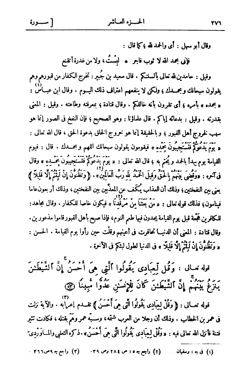 وقيل: حامد تَعَالَى بِأَلْسِنَتِكُمْ. قَالَ سَعِيدُ بْنُ جُبَيْرٍ: تَخْرُجُ الْكُفَّارُ مِنْ قُبُورِهِمْ وَهُمْ يَقُولُونَ سُبْحَانَكَ وَبِحَمْدِكَ، وَلَكِنْ لَا يَنْفَعُهُمُ اعْتِرَافُ ذَلِكَ الْيَوْمِ. وَقَالَ ابْنُ عَبَّاسٍ «١»:" بِحَمْدِهِ" بِأَمْرِهِ، أَيْ تُقِرُّونَ بِأَنَّهُ خَالِقُكُمْ. وَقَالَ قَتَادَةُ: بِمَعْرِفَتِهِ وَطَاعَتِهِ. وَقِيلَ: الْمَعْنَى بِقُدْرَتِهِ. وَقِيلَ: بِدُعَائِهِ إِيَّاكُمْ. قَالَ عُلَمَاؤُنَا: وَهُوَ الصَّحِيحُ، فَإِنَّ النَّفْخَ فِي الصُّوَرِ إِنَّمَا هُوَ سَبَبٌ لِخُرُوجِ أَهْلِ الْقُبُورِ، بِالْحَقِيقَةِ إِنَّمَا هُوَ خُرُوجُ الْخَلْقِ بِدَعْوَةِ الْحَقِّ، قَالَ اللَّهُ تَعَالَى:" يَوْمَ يَدْعُوكُمْ فَتَسْتَجِيبُونَ بِحَمْدِهِ" فَيَقُومُونَ يَقُولُونَ سُبْحَانَكَ اللَّهُمَّ وَبِحَمْدِكَ. قَالَ: فَيَوْمُ الْقِيَامَةِ يَوْمٌ يُبْدَأُ بِالْحَمْدِ وَيُخْتَمُ بِهِ، قَالَ اللَّهُ تَعَالَى:" يَوْمَ يَدْعُوكُمْ فَتَسْتَجِيبُونَ بِحَمْدِهِ" وَقَالَ فِي آخَرَ" وَقُضِيَ بَيْنَهُمْ بِالْحَقِّ وَقِيلَ الْحَمْدُ لِلَّهِ رَبِّ الْعالَمِينَ «٢» ". (وَتَظُنُّونَ إِنْ لَبِثْتُمْ إِلَّا قَلِيلًا) يَعْنِي بَيْنَ النَّفْخَتَيْنِ، وَذَلِكَ أَنَّ الْعَذَابَ يُكَفُّ عَنِ الْمُعَذَّبِينَ بَيْنَ النَّفْخَتَيْنِ، وَذَلِكَ أَرْبَعُونَ عَامًا فَيَنَامُونَ، فَذَلِكَ قَوْلُهُ تَعَالَى:" مَنْ بَعَثَنا مِنْ مَرْقَدِنا «٣» " فَيَكُونُ خَاصًّا لِلْكُفَّارِ. وَقَالَ مُجَاهِدٌ: لِلْكَافِرِينَ هَجْعَةٌ قَبْلَ يَوْمِ الْقِيَامَةِ يَجِدُونَ فِيهَا طَعْمَ النَّوْمِ، فَإِذَا صِيحَ بِأَهْلِ الْقُبُورِ قَامُوا مَذْعُورِينَ. وَقَالَ قَتَادَةُ: الْمَعْنَى أَنَّ الدُّنْيَا تَحَاقَرَتْ فِي أَعْيُنِهِمْ وَقَلَّتْ حِينَ رَأَوْا يَوْمَ الْقِيَامَةِ. الْحَسَنُ:" وَتَظُنُّونَ إِنْ لَبِثْتُمْ إِلَّا قَلِيلًا" فِي الدُّنْيَا لِطُولِ لُبْثكُمْ في الآخرة.