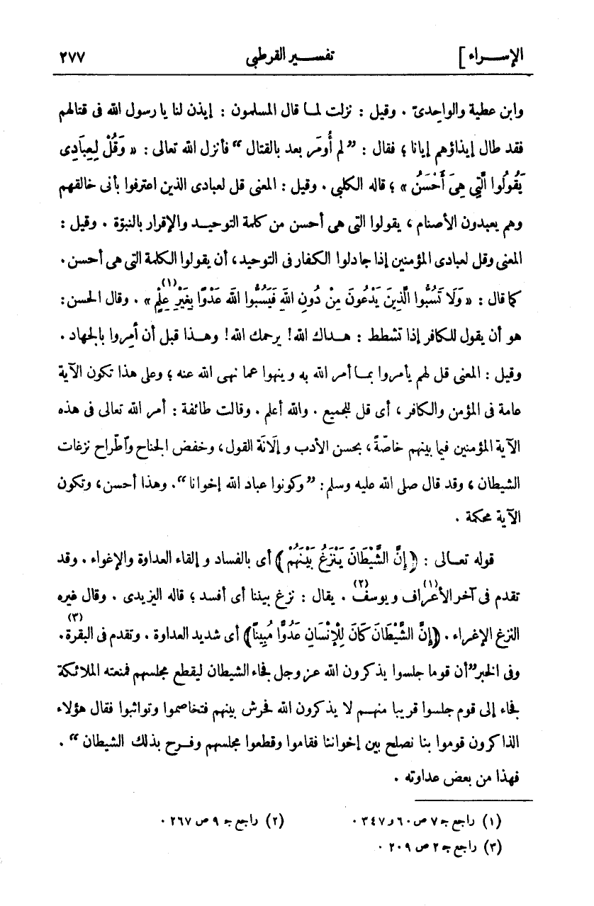 وَابْنُ عَطِيَّةَ وَالْوَاحِدِيُّ. وَقِيلَ: نَزَلَتْ لَمَّا قَالَ المسلمون: ائذن لَنَا يَا رَسُولَ اللَّهِ فِي قِتَالِهِمْ فَقَدْ طَالَ إِيذَاؤُهُمْ إِيَّانَا، فَقَالَ:" لَمْ أُومَرْ بَعْدُ بِالْقِتَالِ" فَأَنْزَلَ اللَّهُ تَعَالَى:" وَقُلْ لِعِبادِي يَقُولُوا الَّتِي هِيَ أَحْسَنُ"، قَالَهُ الْكَلْبِيُّ. وَقِيلَ: الْمَعْنَى قُلْ لِعِبَادِي الَّذِينَ اعْتَرَفُوا بِأَنِّي خَالِقُهُمْ وَهُمْ يَعْبُدُونَ الْأَصْنَامَ، يَقُولُوا الَّتِي هِيَ أَحْسَنُ مِنْ كَلِمَةِ التَّوْحِيدِ وَالْإِقْرَارِ بِالنُّبُوَّةِ. وَقِيلَ: الْمَعْنَى وَقُلْ لِعِبَادِي الْمُؤْمِنِينَ إِذَا جَادَلُوا الْكُفَّارَ فِي التَّوْحِيدِ، أَنْ يَقُولُوا الْكَلِمَةَ الَّتِي هِيَ أَحْسَنُ. كَمَا قَالَ:" وَلا تَسُبُّوا الَّذِينَ يَدْعُونَ مِنْ دُونِ اللَّهِ فَيَسُبُّوا اللَّهَ عَدْواً بِغَيْرِ عِلْمٍ «١» ". وَقَالَ الْحَسَنُ: هُوَ أَنْ يَقُولَ لِلْكَافِرِ إِذَا تَشَطَّطَ: هَدَاكَ اللَّهُ! يَرْحَمُكَ اللَّهُ! وَهَذَا قَبْلَ أَنْ أُمِرُوا بِالْجِهَادِ. وَقِيلَ: الْمَعْنَى قُلْ لَهُمْ يَأْمُرُوا بِمَا أَمَرَ اللَّهُ بِهِ وَيَنْهَوْا عَمَّا نَهَى اللَّهُ عَنْهُ، وَعَلَى هَذَا تَكُونُ الْآيَةُ عَامَّةً فِي الْمُؤْمِنِ وَالْكَافِرِ، أَيْ قُلْ لِلْجَمِيعِ. وَاللَّهُ أَعْلَمُ. وَقَالَتْ طَائِفَةٌ: أَمَرَ اللَّهُ تَعَالَى فِي هَذِهِ الْآيَةِ الْمُؤْمِنِينَ فِيمَا بَيْنَهُمْ خَاصَّةً، بِحُسْنِ الْأَدَبِ وَإِلَانَةِ الْقَوْلِ، وَخَفْضِ الْجَنَاحِ وَإِطْرَاحِ نَزَغَاتِ الشَّيْطَانِ، وَقَدْ قَالَ صَلَّى اللَّهُ عَلَيْهِ وَسَلَّمَ:" وَكُونُوا عِبَادَ اللَّهِ إِخْوَانًا". وَهَذَا أَحْسَنُ، وَتَكُونُ الآية محكمة. قوله تعالى:" (إِنَّ الشَّيْطانَ يَنْزَغُ بَيْنَهُمْ) " أَيْ بِالْفَسَادِ وَإِلْقَاءِ الْعَدَاوَةِ وَالْإِغْوَاءِ. وَقَدْ تَقَدَّمَ فِي آخِرِ الْأَعْرَافِ «٢» وَيُوسُفَ «٣». يُقَالُ: نَزَغَ بَيْنَنَا أَيْ أَفْسَدَ، قَالَهُ الْيَزِيدِيُّ. وَقَالَ غَيْرُهُ النَّزْغُ الْإِغْرَاءُ. (إِنَّ الشَّيْطانَ كانَ لِلْإِنْسانِ عَدُوًّا مُبِيناً) أَيْ شَدِيدَ الْعَدَاوَةِ. وَقَدْ تَقَدَّمَ فِي الْبَقَرَةِ «٤». وَفِي الْخَبَرِ" أَنَّ قَوْمًا جَلَسُوا يَذْكُرُونَ اللَّهَ، عَزَّ وَجَلَّ فَجَاءَ الشَّيْطَانُ لِيَقْطَعَ مَجْلِسَهُمْ فَمَنَعَتْهُ الْمَلَائِكَةُ فَجَاءَ إِلَى قَوْمٍ جَلَسُوا قَرِيبًا مِنْهُمْ لَا يَذْكُرُونَ اللَّهَ فَحَرَّشَ بَيْنَهُمْ فَتَخَاصَمُوا وَتَوَاثَبُوا فَقَالَ هَؤُلَاءِ الذَّاكِرُونَ قُومُوا بِنَا نُصْلِحُ بَيْنَ إِخْوَانِنَا فَقَامُوا وَقَطَعُوا مَجْلِسَهُمْ وَفَرِحَ بِذَلِكَ الشَّيْطَانُ". فَهَذَا مِنْ بَعْضِ عداوته.