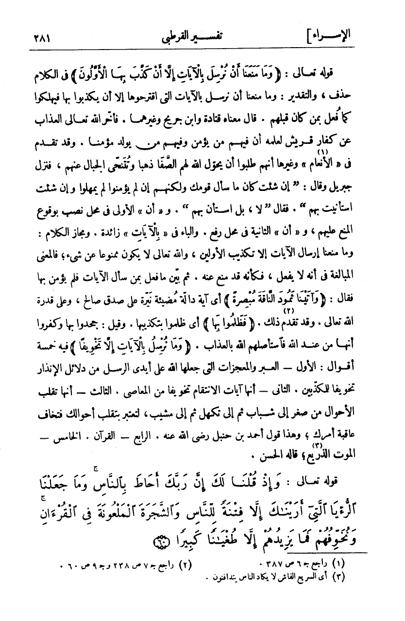 قَوْلُهُ تَعَالَى: (وَما مَنَعَنا أَنْ نُرْسِلَ بِالْآياتِ إِلَّا أَنْ كَذَّبَ بِهَا الْأَوَّلُونَ) فِي الْكَلَامِ حَذْفٌ، وَالتَّقْدِيرُ: وَمَا مَنَعَنَا أَنْ نُرْسِلَ بِالْآيَاتِ الَّتِي اقْتَرَحُوهَا إِلَّا أَنْ يُكَذِّبُوا بِهَا فَيَهْلِكُوا كَمَا فُعِلَ بِمَنْ كَانَ قَبْلَهُمْ. قَالَ مَعْنَاهُ قَتَادَةُ وَابْنُ جُرَيْجٍ وَغَيْرُهُمَا. فَأَخَّرَ اللَّهُ تَعَالَى الْعَذَابَ عَنْ كُفَّارِ قُرَيْشٍ لِعِلْمِهِ أَنَّ فِيهِمْ مَنْ يُؤْمِنُ وَفِيهِمْ مَنْ يُولَدُ مُؤْمِنًا. وَقَدْ تَقَدَّمَ فِي" الْأَنْعَامِ «١» " وَغَيْرِهَا أَنَّهُمْ طَلَبُوا أَنْ يُحَوِّلَ اللَّهُ لَهُمُ الصَّفَا ذَهَبًا وَتَتَنَحَّى الْجِبَالُ عَنْهُمْ، فَنَزَلَ جِبْرِيلُ وَقَالَ:" إِنْ شِئْتَ كَانَ مَا سَأَلَ قَوْمُكَ وَلَكِنَّهُمْ إِنْ لَمْ يُؤْمِنُوا لَمْ يُمْهَلُوا وَإِنْ شِئْتَ اسْتَأْنَيْتُ بِهِمْ". فَقَالَ:" لا بل استأن بهم". و" أَنْ" الْأُولَى فِي مَحَلِّ نَصْبٍ بِوُقُوعِ الْمَنْعِ عَلَيْهِمْ، و" أَنْ" الثَّانِيَةُ فِي مَحَلِّ رَفْعٍ. وَالْبَاءُ فِي" بِالْآياتِ" زَائِدَةٌ. وَمَجَازُ الْكَلَامِ: وَمَا مَنَعَنَا إِرْسَالَ الْآيَاتِ إِلَّا تَكْذِيبُ الْأَوَّلِينَ، وَاللَّهُ تَعَالَى لَا يَكُونُ ممنوعا عن شي، فَالْمَعْنَى الْمُبَالَغَةُ فِي أَنَّهُ لَا يَفْعَلُ، فَكَأَنَّهُ قَدْ مُنِعَ عَنْهُ. ثُمَّ بَيَّنَ مَا فَعَلَ بِمَنْ سَأَلَ الْآيَاتِ فَلَمْ يُؤْمِنْ بِهَا فَقَالَ: (وَآتَيْنا ثَمُودَ النَّاقَةَ مُبْصِرَةً) أَيْ آيَةً دَالَّةً مُضِيئَةً نَيِّرَةً عَلَى صِدْقِ صَالِحٍ، وَعَلَى قُدْرَةِ اللَّهِ تَعَالَى. وَقَدْ تَقَدَّمَ «٢» ذَلِكَ. (فَظَلَمُوا بِها) أَيْ ظَلَمُوا بِتَكْذِيبِهَا. وَقِيلَ: جَحَدُوا بِهَا وَكَفَرُوا أَنَّهَا مِنْ عِنْدِ اللَّهِ فَاسْتَأْصَلَهُمُ اللَّهُ بِالْعَذَابِ. (وَما نُرْسِلُ بِالْآياتِ إِلَّا تَخْوِيفاً) فِيهِ خَمْسَةُ أَقْوَالٍ: الْأَوَّلُ- الْعِبَرُ وَالْمُعْجِزَاتُ الَّتِي جَعَلَهَا اللَّهُ عَلَى أَيْدِي الرُّسُلِ مِنْ دَلَائِلِ الْإِنْذَارِ تَخْوِيفًا لِلْمُكَذِّبِينَ. الثَّانِي- أَنَّهَا آيَاتُ الِانْتِقَامِ تَخْوِيفًا مِنَ الْمَعَاصِي. الثَّالِثُ- أَنَّهَا تَقَلُّبُ الْأَحْوَالِ مِنْ صِغَرٍ إِلَى شَبَابٍ ثُمَّ إِلَى تَكَهُّلٍ ثُمَّ إِلَى مَشِيبٍ، لِتَعْتَبِرَ بِتَقَلُّبِ أَحْوَالِكَ فَتَخَافَ عَاقِبَةَ أَمْرِكَ، وَهَذَا قَوْلُ أَحْمَدَ بْنِ حَنْبَلٍ رَضِيَ اللَّهُ عنه. الرابع- القرآن. الخامس- الموت الذريع «٣»، قال الحسن.