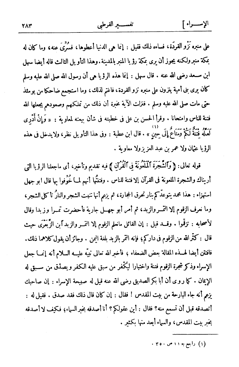 عَلَى مِنْبَرِهِ نَزْوَ الْقِرَدَةِ، فَسَاءَهُ ذَلِكَ فَقِيلَ: إِنَّمَا هِيَ الدُّنْيَا أُعْطُوهَا، فَسُرِّيَ عَنْهُ، وَمَا كَانَ لَهُ بِمَكَّةَ مِنْبَرٌ وَلَكِنَّهُ يَجُوزُ أَنْ يَرَى بِمَكَّةَ رُؤْيَا الْمِنْبَرِ بِالْمَدِينَةِ. وَهَذَا التَّأْوِيلُ الثَّالِثُ قَالَهُ أَيْضًا سَهْلُ بْنُ سَعْدٍ رَضِيَ اللَّهُ عَنْهُ. قَالَ سَهْلٌ إِنَّمَا هَذِهِ الرُّؤْيَا هِيَ أَنَّ رَسُولَ اللَّهِ صَلَّى اللَّهُ عَلَيْهِ وَسَلَّمَ كَانَ يَرَى بَنِي أُمَيَّةَ يَنْزُونَ عَلَى مِنْبَرِهِ نَزْوَ الْقِرَدَةِ، فَاغْتَمَّ لِذَلِكَ، وَمَا اسْتَجْمَعَ ضَاحِكًا مِنْ يَوْمئِذٍ حَتَّى مَاتَ صَلَّى اللَّهُ عَلَيْهِ وَسَلَّمَ. فَنَزَلَتِ الْآيَةُ مُخْبِرَةً أَنَّ ذَلِكَ مِنْ تَمَلُّكِهِمْ وَصُعُودِهِمْ يَجْعَلُهَا اللَّهُ فِتْنَةً لِلنَّاسِ وَامْتِحَانًا. وَقَرَأَ الْحَسَنُ بْنُ عَلِيٍّ فِي خُطْبَتِهِ فِي شَأْنِ بَيْعَتِهِ لِمُعَاوِيَةَ:" وَإِنْ أَدْرِي لَعَلَّهُ فِتْنَةٌ لَكُمْ وَمَتاعٌ إِلى حِينٍ «١» ". قَالَ ابْنُ عَطِيَّةَ: وَفِي هَذَا التَّأْوِيلِ نَظَرٌ، وَلَا يَدْخُلُ فِي هَذِهِ الرُّؤْيَا عُثْمَانُ وَلَا عُمَرُ بْنُ عَبْدِ الْعَزِيزِ وَلَا مُعَاوِيَةُ. قَوْلُهُ تَعَالَى: (وَالشَّجَرَةَ الْمَلْعُونَةَ فِي الْقُرْآنِ) فِيهِ تَقْدِيمٌ وَتَأْخِيرٌ، أَيْ مَا جَعَلْنَا الرُّؤْيَا الَّتِي أَرَيْنَاكَ وَالشَّجَرَةَ الْمَلْعُونَةَ فِي الْقُرْآنِ إِلَّا فِتْنَةً لِلنَّاسِ. وَفِتْنَتُهَا أَنَّهُمْ لَمَّا خُوِّفُوا بِهَا قَالَ أَبُو جَهْلٍ اسْتِهْزَاءً: هَذَا مُحَمَّدٌ يَتَوَعَّدُكُمْ بِنَارٍ تُحْرِقُ الْحِجَارَةَ، ثُمَّ يَزْعُمُ أَنَّهَا تُنْبِتُ الشَّجَرَ وَالنَّارُ تَأْكُلُ الشَّجَرَ، وَمَا نَعْرِفُ الزَّقُّومَ إِلَّا التَّمْرَ وَالزُّبْدَ، ثُمَّ أَمَرَ أَبُو جَهْلٍ جَارِيَةً فَأَحْضَرَتْ تَمْرًا وَزُبْدًا وَقَالَ لِأَصْحَابِهِ: تَزَقَّمُوا. وَقَدْ قِيلَ: إِنَّ الْقَائِلَ مَا نَعْلَمُ الزَّقُّومَ إِلَّا التَّمْرَ وَالزُّبْدَ ابْنُ الزِّبَعْرَى حَيْثُ قَالَ: كَثَّرَ اللَّهُ مِنَ الزَّقُّومِ فِي دَارِكُمْ، فَإِنَّهُ التَّمْرُ بِالزُّبْدِ بِلُغَةِ الْيَمَنِ. وَجَائِزٌ أَنْ يَقُولَ كِلَاهُمَا ذَلِكَ. فَافْتُتِنَ أَيْضًا لِهَذِهِ الْمَقَالَةِ بَعْضُ الضُّعَفَاءِ، فَأَخْبَرَ اللَّهُ تَعَالَى نَبِيَّهُ عَلَيْهِ السَّلَامُ أَنَّهُ إِنَّمَا جَعَلَ الْإِسْرَاءَ وَذِكْرَ شَجَرَةِ الزَّقُّومِ فِتْنَةً وَاخْتِبَارًا لِيَكْفُرَ مَنْ سَبَقَ عَلَيْهِ الْكُفْرُ وَيُصَدِّقَ مَنْ سَبَقَ لَهُ الْإِيمَانُ. كَمَا رُوِيَ أَنَّ أَبَا بَكْرٍ الصِّدِّيقَ رَضِيَ اللَّهُ عَنْهُ قِيلَ لَهُ صَبِيحَةَ الْإِسْرَاءِ: إِنَّ صَاحِبَكَ يَزْعُمُ أَنَّهُ جَاءَ الْبَارِحَةَ مِنْ بَيْتِ الْمَقْدِسِ فَقَالَ: إِنْ كَانَ قَالَ ذَلِكَ فَلَقَدْ صَدَقَ. فَقِيلَ لَهُ: أَتُصَدِّقُهُ قَبْلَ أَنْ تسمع منه؟ فقال: أبن عُقُولُكُمْ؟ أَنَا أُصَدِّقُهُ بِخَبَرِ السَّمَاءِ، فَكَيْفَ لَا أُصَدِّقُهُ بِخَبَرِ بَيْتِ الْمَقْدِسِ، وَالسَّمَاءُ أَبْعَدُ مِنْهَا بكثير.