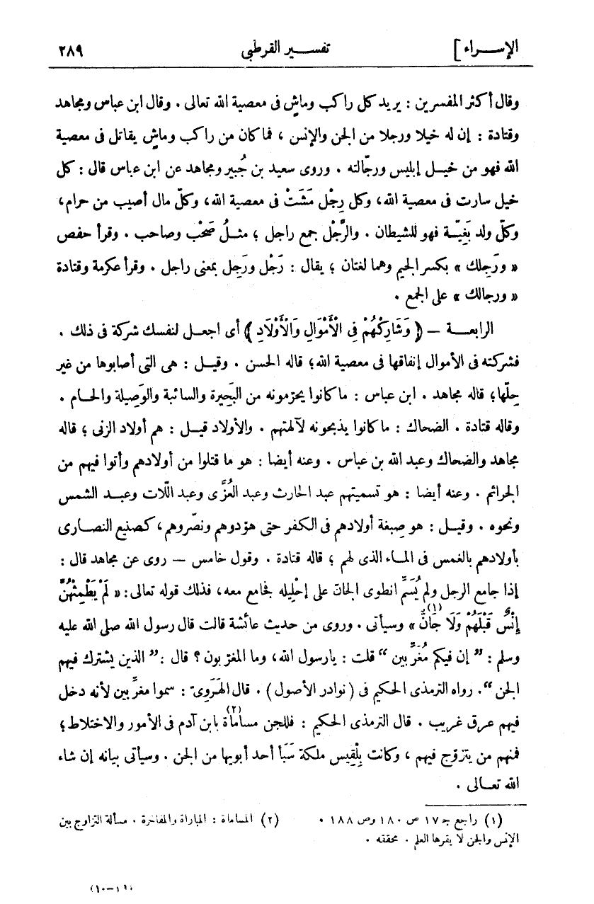 وَقَالَ أَكْثَرُ الْمُفَسِّرِينَ: يُرِيدُ كُلَّ رَاكِبٍ وَمَاشٍ فِي مَعْصِيَةِ اللَّهِ تَعَالَى. وَقَالَ ابْنُ عَبَّاسٍ وَمُجَاهِدٌ وَقَتَادَةُ: إِنَّ لَهُ خَيْلًا وَرَجِلًا مِنَ الْجِنِّ وَالْإِنْسِ. فَمَا كَانَ مِنْ رَاكِبٍ وَمَاشٍ يُقَاتِلُ فِي مَعْصِيَةِ اللَّهِ فَهُوَ مِنْ خَيْلِ إِبْلِيسٍ وَرِجَالَتِهِ. وَرَوَى سَعِيدُ بْنُ جُبَيْرٍ وَمُجَاهِدٌ عَنِ ابْنِ عَبَّاسٍ قَالَ: كُلُّ خَيْلٍ سَارَتْ في معصية الله، وكل رجل مشى فِي مَعْصِيَةِ اللَّهِ، وَكُلُّ مَالٍ أُصِيبَ مِنْ حَرَامٍ، وَكُلُّ وَلَدِ بَغِيَّةٍ فَهُوَ لِلشَّيْطَانِ. وَالرَّجْلُ جَمْعُ رَاجِلٍ، مِثْلُ صَحْبٍ وَصَاحِبٍ. وَقَرَأَ حَفْصٌ" وَرَجِلِكَ" بِكَسْرِ الْجِيمِ وَهُمَا لُغَتَانِ، يُقَالُ: رَجِلٌ وَرَجْلٌ بِمَعْنَى رَاجِلٍ. وَقَرَأَ عِكْرِمَةُ وَقَتَادَةُ" وَرِجِالِكَ" عَلَى الْجَمْعِ. الرَّابِعَةُ- (وَشارِكْهُمْ فِي الْأَمْوالِ وَالْأَوْلادِ) أَيِ اجْعَلْ لِنَفْسِكَ شَرِكَةً فِي ذَلِكَ. فَشَرِكَتُهُ فِي الْأَمْوَالِ إِنْفَاقُهَا فِي مَعْصِيَةِ اللَّهِ، قَالَهُ الْحَسَنُ. وَقِيلَ: هِيَ الَّتِي أَصَابُوهَا مِنْ غَيْرِ حِلِّهَا، قَالَهُ مُجَاهِدٌ. ابْنُ عَبَّاسٍ: مَا كَانُوا يُحَرِّمُونَهُ مِنَ الْبَحِيرَةِ وَالسَّائِبَةِ وَالْوَصِيلَةِ وَالْحَامِ. وَقَالَهُ قَتَادَةُ. الضَّحَّاكُ: مَا كَانُوا يَذْبَحُونَهُ لِآلِهَتِهِمْ. وَالْأَوْلَادُ قيل: هم أولاد الزنى، قَالَهُ مُجَاهِدٌ وَالضَّحَّاكُ وَعَبْدُ اللَّهِ بْنُ عَبَّاسٍ. وَعَنْهُ أَيْضًا: هُوَ مَا قَتَلُوا مِنْ أَوْلَادِهِمْ وَأَتَوْا فِيهِمْ مِنَ الْجَرَائِمِ. وَعَنْهُ أَيْضًا: هُوَ تَسْمِيَتُهُمْ عَبْدَ الْحَارِثِ وَعَبْدَ الْعُزَّى وَعَبْدَ اللَّاتِ وَعَبْدَ الشَّمْسِ وَنَحْوَهُ. وَقِيلَ: هُوَ صِبْغَةُ أَوْلَادِهِمْ فِي الْكُفْرِ حَتَّى هَوَّدُوهُمْ وَنَصَّرُوهُمْ، كَصُنْعِ النَّصَارَى بِأَوْلَادِهِمْ بِالْغَمْسِ فِي الْمَاءِ الَّذِي لَهُمْ، قَالَ قَتَادَةُ. وَقَوْلٌ خَامِسٌ- رُوِيَ عَنْ مُجَاهِدٍ قَالَ: إِذَا جَامَعَ الرَّجُلُ وَلَمْ يُسَمِّ انْطَوَى الْجَانُّ عَلَى إِحْلِيلِهِ فَجَامَعَ مَعَهُ، فَذَلِكَ قَوْلُهُ تَعَالَى:" لَمْ يَطْمِثْهُنَّ إِنْسٌ قَبْلَهُمْ وَلا جَانٌّ «١» " وَسَيَأْتِي. وَرَوَى مِنْ حَدِيثِ عَائِشَةَ قَالَتْ قَالَ رَسُولُ اللَّهِ صَلَّى اللَّهُ عَلَيْهِ وَسَلَّمَ:" إِنَّ فِيكُمْ مُغَرِّبِينَ" قُلْتُ: يَا رَسُولَ اللَّهِ، وَمَا الْمُغَرِّبُونَ؟ قَالَ:" الَّذِينَ يَشْتَرِكُ فِيهِمُ الْجِنُّ". رَوَاهُ التِّرْمِذِيُّ الْحَكِيمُ فِي (نَوَادِرِ الْأُصُولِ). قَالَ الْهَرَوِيُّ: سُمُّوا مُغَرِّبِينَ لِأَنَّهُ دَخَلَ فِيهِمْ عِرْقٌ غَرِيبٌ. قَالَ التِّرْمِذِيُّ الْحَكِيمُ: فَلِلْجِنِّ مُسَامَاةٌ «٢» بِابْنِ آدَمَ فِي الْأُمُورِ وَالِاخْتِلَاطِ، فَمِنْهُمْ مَنْ يَتَزَوَّجُ فِيهِمْ، وَكَانَتْ بِلْقِيسُ مَلِكَةُ سَبَأٍ أَحَدُ أَبَوَيْهَا مِنَ الْجِنِّ. وسيأتي بيانه إن شاء الله تعالى.