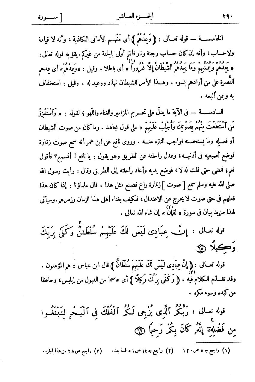 الْخَامِسَةُ- قَوْلُهُ تَعَالَى: (وَعِدْهُمْ) أَيْ مَنِّهِمُ الْأَمَانِيَّ الْكَاذِبَةَ، وَأَنَّهُ لَا قِيَامَةَ وَلَا حِسَابَ، وَأَنَّهُ إِنْ كَانَ حِسَابٌ وَجَنَّةٌ وَنَارٌ فَأَنْتُمْ أَوْلَى بِالْجَنَّةِ مِنْ غَيْرِكُمْ. يُقَوِّيهِ قَوْلُهُ تَعَالَى:" يَعِدُهُمْ وَيُمَنِّيهِمْ وَما يَعِدُهُمُ الشَّيْطانُ إِلَّا غُرُوراً «١» " أَيْ باطلا. وقبل" وَعِدْهُمْ" أي عدهم النصر عَلَى مَنْ أَرَادَهُمْ بِسُوءٍ. وَهَذَا الْأَمْرُ لِلشَّيْطَانِ تَهَدُّدٌ وَوَعِيدٌ لَهُ. وَقِيلَ: اسْتِخْفَافٌ بِهِ وَبِمَنِ اتبعه. السادسة- في فِي الْآيَةِ مَا يَدُلُّ عَلَى تَحْرِيمِ الْمَزَامِيرِ وَالْغِنَاءِ وَاللَّهْوِ، لِقَوْلِهِ:" وَاسْتَفْزِزْ مَنِ اسْتَطَعْتَ مِنْهُمْ بِصَوْتِكَ وَأَجْلِبْ عَلَيْهِمْ" عَلَى قَوْلِ مُجَاهِدٍ وَمَا كَانَ مِنْ صَوْتِ الشَّيْطَانِ أَوْ فِعْلِهِ وَمَا يتحسنه فَوَاجِبٌ التَّنَزُّهِ عَنْهُ. وَرَوَى نَافِعٌ عَنِ ابْنِ عُمَرَ أَنَّهُ سَمِعَ صَوْتَ زَمَّارَةٍ فَوَضَعَ أُصْبُعَيْهِ في أذنيه، وعدل راحته عَنِ الطَّرِيقِ وَهُوَ يَقُولُ: يَا نَافِعُ! أَتَسْمَعُ؟ فَأَقُولُ نَعَمْ، فَمَضَى حَتَّى قُلْتُ لَهُ لَا، فَوَضَعَ يَدَيْهِ وَأَعَادَ رَاحِلَتَهُ إِلَى الطَّرِيقِ وَقَالَ: رَأَيْتُ رَسُولَ اللَّهِ صَلَّى اللَّهُ عَلَيْهِ وَسَلَّمَ سَمِعَ [صَوْتَ] زَمَّارَةِ رَاعٍ فَصَنَعَ مِثْلَ هَذَا. وقال عُلَمَاؤُنَا: إِذَا كَانَ هَذَا فِعْلُهُمْ فِي حَقِّ صَوْتٍ لَا يَخْرُجُ عَنْ الِاعْتِدَالِ، فَكَيْفَ بِغِنَاءِ أَهْلِ هَذَا الزَّمَانِ وَزَمْرِهِمْ. وَسَيَأْتِي لِهَذَا مَزِيدُ بَيَانٍ فِي سُورَةِ" لُقْمَانَ «٢» " إِنْ شَاءَ اللَّهُ تعالى.