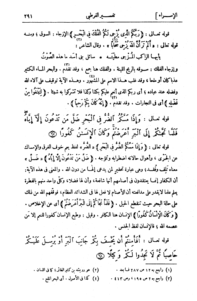 وَإِزْجَاءُ الْفُلْكِ: سَوْقُهُ بِالرِّيحِ اللَّيِّنَةِ. وَالْفُلْكُ هُنَا جَمْعٌ، وَقَدْ تَقَدَّمَ «٣». وَالْبَحْرُ الْمَاءُ الْكَثِيرُ عَذْبًا كَانَ أَوْ ملحا، وقد غلب هذا الاسم على المشهور «٤» وَهَذِهِ الْآيَةُ تَوْقِيفٌ عَلَى آلَاءِ اللَّهِ وَفَضْلِهِ عِنْدَ عِبَادِهِ، أَيْ رَبُّكُمُ الَّذِي أَنْعَمَ عَلَيْكُمْ بِكَذَا وَكَذَا فَلَا تُشْرِكُوا بِهِ شَيْئًا. (لِتَبْتَغُوا مِنْ فَضْلِهِ) أَيْ فِي التِّجَارَاتِ. وَقَدْ تَقَدَّمَ «٥». (إِنَّهُ كانَ بِكُمْ رَحِيماً).