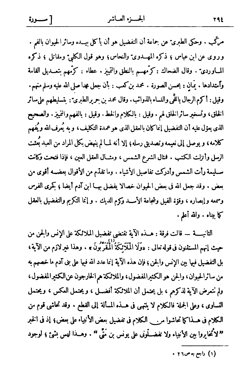 «١» وَهَذَا غَيْرُ لَازِمٍ مِنَ الْآيَةِ، بَلِ التَّفْضِيلُ فِيهَا بَيْنَ الْإِنْسِ وَالْجِنِّ، فَإِنَّ هَذِهِ الْآيَةَ إِنَّمَا عَدَّدَ اللَّهُ فِيهَا عَلَى بَنِي آدَمَ مَا خَصَّهُمْ بِهِ مِنْ سَائِرِ الْحَيَوَانِ، وَالْجِنِّ هُوَ الْكَثِيرُ الْمَفْضُولُ، وَالْمَلَائِكَةُ هُمُ الْخَارِجُونَ عَنِ الْكَثِيرِ الْمَفْضُولِ، وَلَمْ تَتَعَرَّضِ الْآيَةُ لَذِكْرِهِمْ، بَلْ يَحْتَمِلُ أَنَّ الْمَلَائِكَةَ أَفْضَلُ، وَيَحْتَمِلُ الْعَكْسَ، وَيَحْتَمِلُ التَّسَاوِيَ، وَعَلَى الْجُمْلَةِ فَالْكَلَامُ لَا يَنْتَهِي فِي هَذِهِ الْمَسْأَلَةِ إِلَى الْقَطْعِ. وَقَدْ تَحَاشَى قَوْمٌ مِنَ الْكَلَامِ فِي هَذَا كَمَا تَحَاشَوْا مِنَ الْكَلَامِ فِي تَفْضِيلِ بَعْضِ الْأَنْبِيَاءِ عَلَى بَعْضٍ، إِذْ فِي الْخَبَرِ" لَا تُخَايِرُوا بَيْنَ الْأَنْبِيَاءِ وَلَا تُفَضِّلُونِي عَلَى يُونُسَ بْنِ متى". وهذا ليس بشيء، لوجود