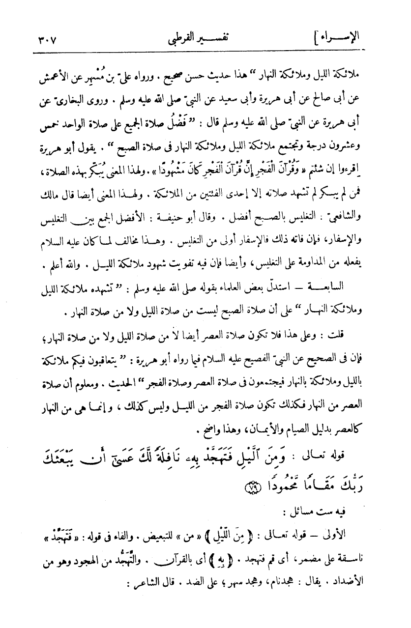 مَلَائِكَةُ اللَّيْلِ وَمَلَائِكَةُ النَّهَارِ" هَذَا حَدِيثٌ حَسَنٌ صَحِيحٌ. وَرَوَاهُ عَلِيُّ بْنُ مُسْهِرٍ عَنِ الْأَعْمَشِ عَنْ أَبِي صَالِحٍ عَنْ أَبِي هُرَيْرَةَ وَأَبِي سَعِيدٍ عَنِ النَّبِيِّ صَلَّى اللَّهُ عَلَيْهِ وَسَلَّمَ. وَرَوَى الْبُخَارِيِّ عَنْ أَبِي هُرَيْرَةَ عَنِ النَّبِيِّ صَلَّى اللَّهُ عَلَيْهِ وَسَلَّمَ قَالَ:" فَضْلُ صَلَاةِ الْجَمِيعِ عَلَى صَلَاةِ الْوَاحِدِ خَمْسٌ وَعِشْرُونَ دَرَجَةً وَتَجْتَمِعُ مَلَائِكَةُ اللَّيْلِ وَمَلَائِكَةُ النَّهَارِ فِي صَلَاةِ الصُّبْحِ". يَقُولُ أَبُو هُرَيْرَةَ: اقْرَءُوا إِنْ شِئْتُمْ" وَقُرْآنَ الْفَجْرِ إِنَّ قُرْآنَ الْفَجْرِ كانَ مَشْهُوداً". وَلِهَذَا الْمَعْنَى أَيْضًا قَالَ مَالِكٌ وَالشَّافِعِيُّ: التَّغْلِيسُ بِالصُّبْحِ أَفْضَلُ. وَقَالَ أَبُو حَنِيفَةَ: الْأَفْضَلُ الْجَمْعُ بين التغليس والاسقار، فَإِنْ فَاتَهُ ذَلِكَ فَالْإِسْفَارُ أَوْلَى مِنَ التَّغْلِيسِ. وَهَذَا مُخَالِفٌ لِمَا كَانَ عَلَيْهِ السَّلَامُ يَفْعَلُهُ مِنَ الْمُدَاوَمَةِ عَلَى التَّغْلِيسِ، وَأَيْضًا فَإِنَّ فِيهِ تَفْوِيتُ شُهُودِ مَلَائِكَةِ اللَّيْلِ. وَاللَّهُ أَعْلَمُ. السَّابِعَةُ- اسْتَدَلَّ بَعْضُ الْعُلَمَاءِ بِقَوْلِهِ صَلَّى اللَّهُ عَلَيْهِ وَسَلَّمَ:" تَشْهَدُهُ مَلَائِكَةُ اللَّيْلِ وَمَلَائِكَةُ النَّهَارِ" عَلَى أَنَّ صَلَاةَ الصُّبْحِ لَيْسَتْ مِنْ صَلَاةِ اللَّيْلِ وَلَا مِنْ صَلَاةِ النَّهَارِ. قُلْتُ: وَعَلَى هَذَا فَلَا تَكُونُ صَلَاةُ الْعَصْرِ أَيْضًا لَا مِنْ صَلَاةِ اللَّيْلِ وَلَا مِنْ صَلَاةِ النَّهَارِ، فَإِنَّ فِي الصَّحِيحِ عَنِ النَّبِيِّ صَلَّى اللَّهُ عَلَيْهِ وَسَلَّمَ الْفَصِيحِ عَلَيْهِ السَّلَامُ فِيمَا رَوَاهُ أَبُو هُرَيْرَةَ:" يَتَعَاقَبُونَ فِيكُمْ مَلَائِكَةٌ بِاللَّيْلِ وَمَلَائِكَةٌ بِالنَّهَارِ فَيَجْتَمِعُونَ فِي صَلَاةِ الْعَصْرِ وَصَلَاةِ الْفَجْرِ" الْحَدِيثَ. وَمَعْلُومٌ أَنَّ صَلَاةَ الْعَصْرِ مِنَ النَّهَارِ فَكَذَلِكَ تَكُونُ صَلَاةُ الْفَجْرِ مِنَ اللَّيْلِ وَلَيْسَ كَذَلِكَ، وَإِنَّمَا هِيَ مِنَ النَّهَارِ كَالْعَصْرِ بِدَلِيلِ الصِّيَامِ وَالْإِيمَانِ، وهذا واضح.