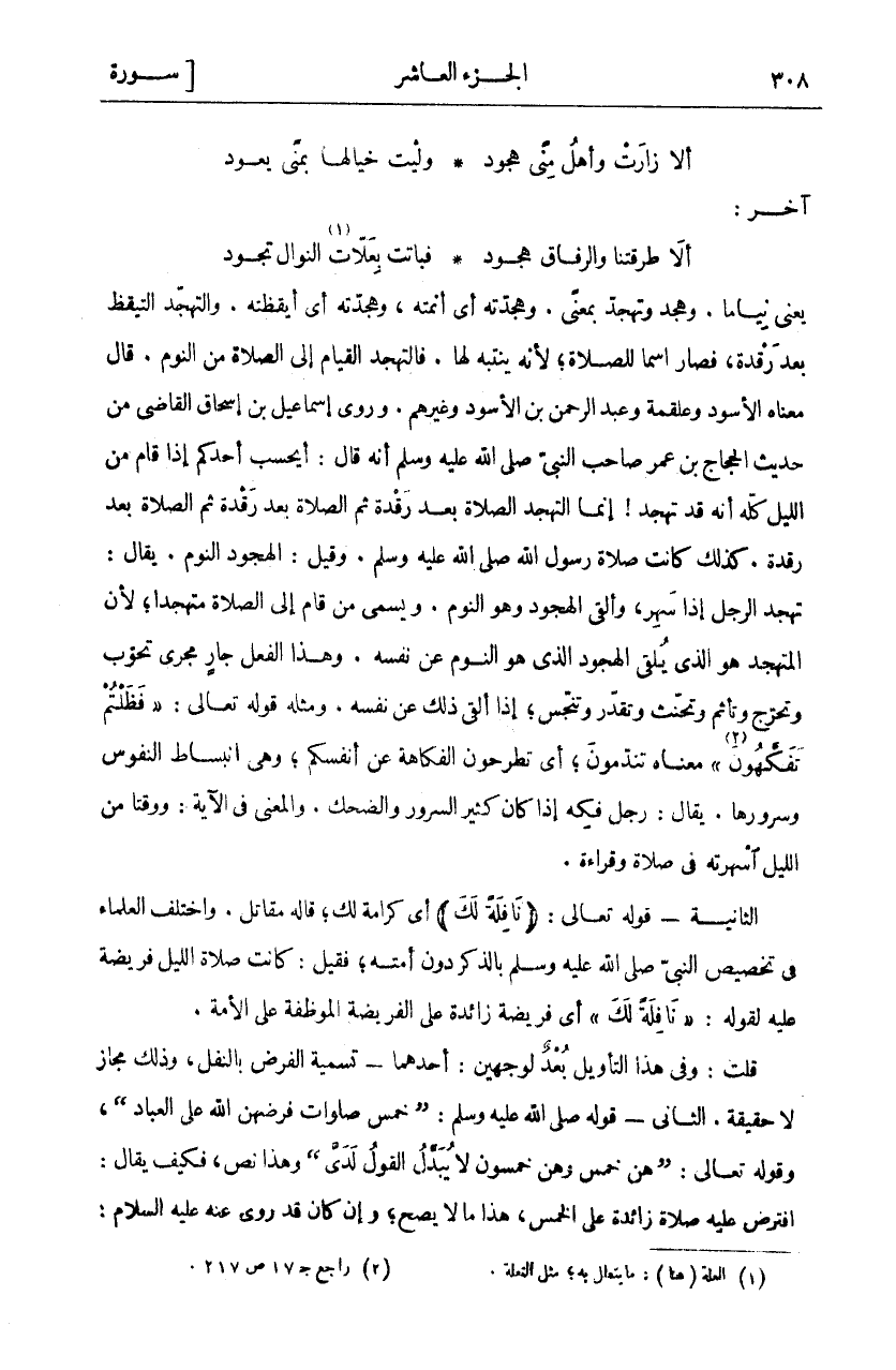 يَعْنِي نِيَامًا. وَهَجَدَ وَتَهَجَّدَ بِمَعْنًى. وَهَجَّدْتُهُ أَيْ أَنَمْتُهُ، وَهَجَّدْتُهُ أَيْ أَيْقَظْتُهُ. وَالتَّهَجُّدُ التَّيَقُّظُ بَعْدَ رَقْدَةٍ، فَصَارَ اسْمًا لِلصَّلَاةِ، لِأَنَّهُ يَنْتَبِهُ لَهَا. فَالتَّهَجُّدُ الْقِيَامُ إِلَى الصَّلَاةِ مِنَ النَّوْمِ. قَالَ مَعْنَاهُ الْأَسْوَدُ وَعَلْقَمَةُ وَعَبْدُ الرَّحْمَنِ بْنُ الْأَسْوَدِ وَغَيْرُهُمْ. وَرَوَى إِسْمَاعِيلُ بْنُ إِسْحَاقَ الْقَاضِي مِنْ حَدِيثِ الْحَجَّاجِ بْنِ عُمَرَ صَاحِبِ النَّبِيِّ صَلَّى اللَّهُ عَلَيْهِ وَسَلَّمَ أَنَّهُ قَالَ: أَيَحْسِبُ أَحَدُكُمْ إِذَا قَامَ مِنَ اللَّيْلِ كُلِّهِ أَنَّهُ قَدْ تَهَجَّدَ! إِنَّمَا التَّهَجُّدُ الصَّلَاةُ بَعْدَ رَقْدَةٍ ثُمَّ الصَّلَاةُ بَعْدَ رَقْدَةٍ ثُمَّ الصَّلَاةُ بَعْدَ رَقْدَةٍ. كَذَلِكَ كَانَتْ صَلَاةِ رَسُولِ اللَّهِ صَلَّى اللَّهُ عَلَيْهِ وَسَلَّمَ. وَقِيلَ: الْهُجُودُ النَّوْمُ. يُقَالُ: تَهَجَّدَ الرَّجُلُ إِذَا سَهِرَ، وَأَلْقَى الْهُجُودَ وَهُوَ النَّوْمُ. وَيُسَمَّى مَنْ قَامَ إِلَى الصَّلَاةِ مُتَهَجِّدًا، لِأَنَّ الْمُتَهَجِّدَ هُوَ الَّذِي يُلْقِي الْهُجُودَ الَّذِي هُوَ النَّوْمُ عَنْ نَفْسِهِ. وَهَذَا الْفِعْلُ جَارٍ مَجْرَى تَحَوَّبَ وَتَحَرَّجَ وَتَأَثَّمَ وَتَحَنَّثَ وَتَقَذَّرَ وَتَنَجَّسَ، إِذَا أَلْقَى ذَلِكَ عَنْ نَفْسِهِ. وَمِثْلُهُ قَوْلُهُ تَعَالَى:" فَظَلْتُمْ تَفَكَّهُونَ «٢» " مَعْنَاهُ تَنْدَمُونَ، أَيْ تَطْرَحُونَ الْفُكَاهَةَ عَنْ أَنْفُسِكُمْ، وَهِيَ انْبِسَاطُ النُّفُوسِ وَسُرُورُهَا. يُقَالُ: رَجُلٌ فَكِهٌ إِذَا كَانَ كَثِيرَ السُّرُورِ وَالضَّحِكِ. وَالْمَعْنَى فِي الْآيَةِ: وَوَقْتًا مِنَ اللَّيْلِ اسْهَرْ بِهِ فِي صَلَاةٍ وَقِرَاءَةٍ. الثَّانِيَةُ- قَوْلُهُ تَعَالَى: (نافِلَةً لَكَ) أَيْ كَرَامَةً لَكَ، قَالَهُ مُقَاتِلٌ. وَاخْتَلَفَ الْعُلَمَاءُ فِي تَخْصِيصِ النَّبِيِّ صَلَّى اللَّهُ عَلَيْهِ وَسَلَّمَ بِالذِّكْرِ دُونَ أُمَّتِهِ، فَقِيلَ: كَانَتْ صَلَاةُ اللَّيْلِ فَرِيضَةٌ عَلَيْهِ لِقَوْلِهِ:" نافِلَةً لَكَ" أَيْ فَرِيضَةً زَائِدَةً عَلَى الْفَرِيضَةِ الْمُوَظَّفَةِ عَلَى الْأُمَّةِ. قُلْتُ: وَفِي هَذَا التَّأْوِيلِ بُعْدٌ لِوَجْهَيْنِ: أَحَدُهُمَا- تَسْمِيَةُ الْفَرْضِ بِالنَّفْلِ، وَذَلِكَ مَجَازٌ لَا حَقِيقَةٌ. الثَّانِي- قَوْلُهُ صَلَّى اللَّهُ عَلَيْهِ وَسَلَّمَ:" خَمْسُ صَلَوَاتٍ فَرَضَهُنَّ اللَّهُ عَلَى الْعِبَادِ"، وقوله تعالى: هن خمس وهن خمسون" ما يُبَدَّلُ الْقَوْلُ لَدَيَّ" وَهَذَا نَصٌّ، فَكَيْفَ يُقَالُ: افترض عليه صلاة زائدة على خمس، هَذَا مَا لَا يَصِحُّ، وَإِنْ كَانَ قَدْ روى عنه عليه السلام:"