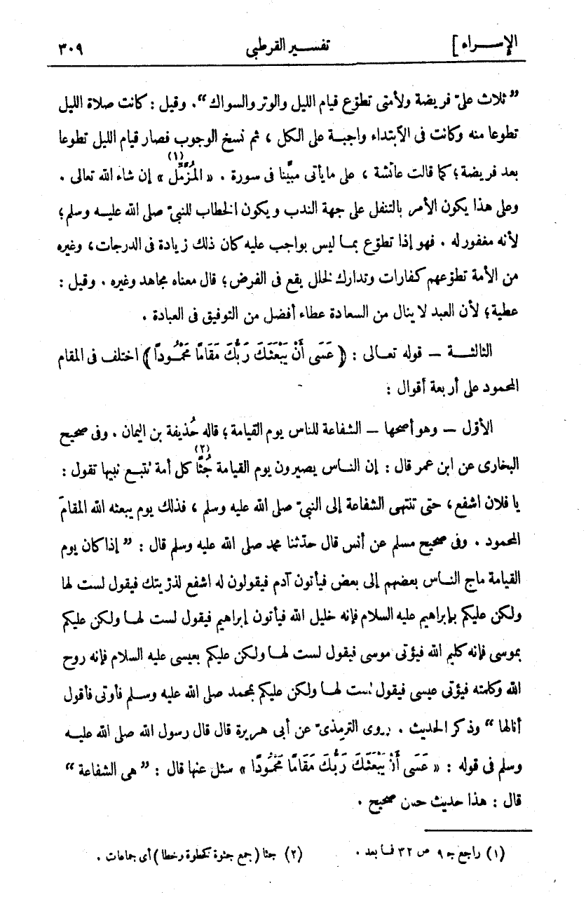 " ثَلَاثٌ عَلَيَّ فَرِيضَةً وَلِأُمَّتِي تَطَوُّعٌ قِيَامُ اللَّيْلِ وَالْوِتْرُ وَالسِّوَاكُ". وَقِيلَ: كَانَتْ صَلَاةُ اللَّيْلِ تَطَوُّعًا مِنْهُ وَكَانَتْ فِي الِابْتِدَاءِ وَاجِبَةً عَلَى الْكُلِّ، ثُمَّ نُسِخَ الْوُجُوبُ فَصَارَ قِيَامُ اللَّيْلِ تَطَوُّعًا بَعْدَ فَرِيضَةٍ، كَمَا قَالَتْ عَائِشَةُ، عَلَى مَا يَأْتِي مُبَيَّنًا فِي سُورَةِ" الْمُزَّمِّلِ «١» إِنْ شَاءَ اللَّهُ تَعَالَى. وَعَلَى هَذَا يَكُونُ الْأَمْرُ بِالتَّنَفُّلِ عَلَى جِهَةِ النَّدْبِ وَيَكُونُ الْخِطَابُ لِلنَّبِيِّ صَلَّى اللَّهُ عَلَيْهِ وَسَلَّمَ، لِأَنَّهُ مَغْفُورٌ لَهُ. فَهُوَ إِذَا تَطَوَّعَ بِمَا لَيْسَ بِوَاجِبٍ عَلَيْهِ كَانَ ذَلِكَ زِيَادَةٌ فِي الدَّرَجَاتِ. وَغَيْرُهُ مِنَ الْأُمَّةِ تَطَوُّعُهُمْ كَفَّارَاتٌ وَتَدَارُكٌ لِخَلَلٍ يَقَعُ فِي الْفَرْضِ، قَالَ مَعْنَاهُ مُجَاهِدٌ وَغَيْرُهُ. وَقِيلَ: عَطِيَّةٌ، لِأَنَّ الْعَبْدَ لَا يَنَالُ مِنَ السَّعَادَةِ عَطَاءٌ أَفْضَلَ مِنَ التَّوْفِيقِ فِي الْعِبَادَةِ. الثَّالِثَةُ- قَوْلُهُ تَعَالَى: (عَسى أَنْ يَبْعَثَكَ رَبُّكَ مَقاماً مَحْمُوداً) اخْتُلِفَ فِي الْمَقَامِ الْمَحْمُودِ عَلَى أَرْبَعَةِ أَقْوَالٍ: الْأَوَّلُ- وَهُوَ أَصَحُّهَا- الشَّفَاعَةُ لِلنَّاسِ يَوْمَ الْقِيَامَةِ، قَالَهُ حُذَيْفَةُ بْنُ الْيَمَانِ. وَفِي صَحِيحِ الْبُخَارِيِّ عَنِ ابْنِ عُمَرَ قَالَ: إِنَّ النَّاسَ يَصِيرُونَ يَوْمَ الْقِيَامَةِ جُثًا «٢» كُلُّ أُمَّةٍ تَتْبَعُ نَبِيَّهَا تَقُولُ: يَا فُلَانُ اشْفَعْ، حَتَّى تَنْتَهِيَ الشَّفَاعَةُ إِلَى النَّبِيِّ صَلَّى اللَّهُ عَلَيْهِ وَسَلَّمَ، فَذَلِكَ يَوْمُ يَبْعَثُهُ اللَّهُ الْمَقَامَ الْمَحْمُودَ. وَفِي صَحِيحِ مُسْلِمٍ عَنْ أَنَسٍ قَالَ حَدَّثَنَا مُحَمَّدٌ صَلَّى اللَّهُ عَلَيْهِ وَسَلَّمَ قَالَ:" إِذَا كَانَ يَوْمُ الْقِيَامَةِ مَاجَ النَّاسُ بَعْضُهُمْ إِلَى بَعْضٍ فَيَأْتُونَ آدَمَ فَيَقُولُونَ لَهُ اشْفَعْ لِذُرِّيَّتِكَ فَيَقُولُ لَسْتُ لَهَا وَلَكِنْ عَلَيْكُمْ بِإِبْرَاهِيمَ عَلَيْهِ السَّلَامُ فَإِنَّهُ خَلِيلُ اللَّهِ فَيَأْتُونَ إِبْرَاهِيمَ فَيَقُولُ لَسْتُ لَهَا وَلَكِنْ عَلَيْكُمْ بِمُوسَى فَإِنَّهُ كَلِيمُ اللَّهِ فَيُؤْتَى مُوسَى فَيَقُولُ لَسْتُ لَهَا وَلَكِنْ عَلَيْكُمْ بِعِيسَى عَلَيْهِ السَّلَامُ فَإِنَّهُ رُوحُ اللَّهِ وَكَلِمَتُهُ فَيُؤْتَى عِيسَى فَيَقُولُ لَسْتُ لَهَا وَلَكِنْ عَلَيْكُمْ بِمُحَمَّدٍ صَلَّى اللَّهُ عَلَيْهِ وَسَلَّمَ فَأُوتَى فَأَقُولُ أَنَا لَهَا" وَذَكَرَ الْحَدِيثَ. وَرَوَى التِّرْمِذِيُّ عَنْ أَبِي هُرَيْرَةَ قَالَ قَالَ رَسُولُ اللَّهِ صلى الله عليه فِي قَوْلِهِ:" عَسى أَنْ يَبْعَثَكَ رَبُّكَ مَقاماً مَحْمُوداً" سُئِلَ عَنْهَا قَالَ:" هِيَ الشَّفَاعَةُ" قَالَ: هذا حديث حسن صحيح.