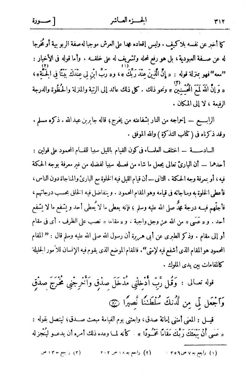 كَمَا أَخْبَرَ عَنْ نَفْسِهِ بِلَا كَيْفٍ. وَلَيْسَ إِقْعَادُهُ مُحَمَّدًا عَلَى الْعَرْشِ مُوجِبًا لَهُ صِفَةَ الرُّبُوبِيَّةِ أَوْ مُخْرِجًا لَهُ عَنْ صِفَةِ الْعُبُودِيَّةِ، بَلْ هُوَ رَفْعٌ لِمَحَلِّهِ وَتَشْرِيفٌ لَهُ عَلَى خَلْقِهِ. وَأَمَّا قَوْلُهُ فِي الْإِخْبَارِ:" مَعَهُ" فَهُوَ بِمَنْزِلَةِ قَوْلِهِ:" إِنَّ الَّذِينَ عِنْدَ رَبِّكَ «١» "، وَ" رَبِّ ابْنِ لِي عِنْدَكَ بَيْتاً فِي الْجَنَّةِ «٢» "." وَإِنَّ اللَّهَ لَمَعَ الْمُحْسِنِينَ «٣» " وَنَحْوِ ذَلِكَ. كُلُّ ذَلِكَ عَائِدٌ إِلَى الرُّتْبَةِ وَالْمَنْزِلَةِ وَالْحُظْوَةِ وَالدَّرَجَةِ الرَّفِيعَةِ، لَا إِلَى الْمَكَانِ. الرَّابِعُ- إِخْرَاجُهُ مِنَ النَّارِ بِشَفَاعَتِهِ مَنْ يَخْرُجُ، قَالَهُ جَابِرُ بْنُ عَبْدِ اللَّهِ. ذَكَرَهُ مُسْلِمٌ. وَقَدْ ذَكَرْنَاهُ فِي (كِتَابِ التَّذْكِرَةِ) وَاللَّهُ الْمُوَفِّقُ. السَّادِسَةُ- اخْتَلَفَ الْعُلَمَاءُ فِي كَوْنِ الْقِيَامِ بِاللَّيْلِ سَبَبًا لِلْمَقَامِ الْمَحْمُودِ عَلَى قَوْلَيْنِ: أَحَدُهُمَا: أَنَّ الْبَارِئَ تَعَالَى يَجْعَلُ مَا شَاءَ مِنْ فِعْلِهِ سَبَبًا لِفَضْلِهِ مِنْ غَيْرِ مَعْرِفَةٍ بِوَجْهِ الْحِكْمَةِ فِيهِ، أَوْ بِمَعْرِفَةِ وَجْهِ الْحِكْمَةِ. الثَّانِي: أَنَّ قِيَامَ اللَّيْلِ فِيهِ الْخَلْوَةُ مَعَ الْبَارِئِ وَالْمُنَاجَاةُ دُونَ النَّاسِ، فَأُعْطِيَ الْخَلْوَةَ بِهِ وَمُنَاجَاتَهُ فِي قِيَامِهِ وَهُوَ الْمَقَامُ الْمَحْمُودُ. وَيَتَفَاضَلُ فِيهِ الْخَلْقُ بِحَسَبِ دَرَجَاتِهِمْ، فَأَجَلُّهُمْ فِيهِ دَرَجَةً مُحَمَّدٌ صَلَّى اللَّهُ عَلَيْهِ وَسَلَّمَ، فَإِنَّهُ يُعْطَى مَا لَا يُعْطَى أَحَدٌ وَيَشْفَعُ ما لا يشفع أحد. و" عَسى " من الله عز وجل واجبة. و" مَقاماً" نُصِبَ عَلَى الظَّرْفِ. أَيْ فِي مَقَامٍ أَوْ إِلَى مَقَامٍ. وَذَكَرَ الطَّبَرِيُّ عَنْ أَبِي هُرَيْرَةَ أَنَّ رَسُولَ اللَّهِ صَلَّى اللَّهُ عَلَيْهِ وَسَلَّمَ قَالَ:" الْمَقَامُ الْمَحْمُودُ هُوَ الْمَقَامُ الَّذِي أَشْفَعُ فِيهِ لِأُمَّتِي". فَالْمَقَامُ الْمَوْضِعُ الَّذِي يَقُومُ فِيهِ الْإِنْسَانُ لِلْأُمُورِ الْجَلِيلَةِ كَالْمَقَامَاتِ بَيْنَ يَدَيِ الْمُلُوكِ.