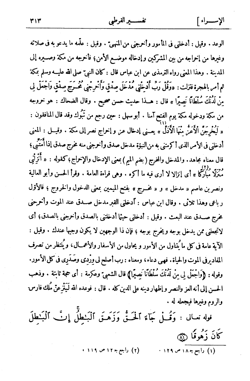 الْوَعْدَ. وَقِيلَ: أَدْخِلْنِي فِي الْمَأْمُورِ وَأَخْرِجْنِي مِنَ الْمَنْهِيِّ. وَقِيلَ: عَلَّمَهُ مَا يَدْعُو بِهِ فِي صَلَاتِهِ وَغَيْرِهَا مِنْ إِخْرَاجِهِ مِنْ بَيْنِ الْمُشْرِكِينَ وَإِدْخَالِهِ مَوْضِعَ الْأَمْنِ، فَأَخْرَجَهُ مِنْ مَكَّةَ وَصَيَّرَهُ إِلَى الْمَدِينَةِ. وَهَذَا الْمَعْنَى رَوَاهُ التِّرْمِذِيُّ عَنِ ابْنِ عَبَّاسٍ قَالَ: كَانَ النَّبِيُّ صَلَّى اللَّهُ عَلَيْهِ وَسَلَّمَ بِمَكَّةَ ثُمَّ أُمِرَ بِالْهِجْرَةِ فَنَزَلَتْ" وَقُلْ رَبِّ أَدْخِلْنِي مُدْخَلَ صِدْقٍ وَأَخْرِجْنِي مُخْرَجَ صِدْقٍ وَاجْعَلْ لِي مِنْ لَدُنْكَ سُلْطاناً نَصِيراً" قَالَ: هَذَا حَدِيثٌ حَسَنٌ صَحِيحٌ. وَقَالَ الضَّحَّاكُ: هُوَ خُرُوجُهُ مِنْ مَكَّةَ وَدُخُولُهُ مَكَّةَ يَوْمَ الْفَتْحِ آمِنًا. أَبُو سَهْلٍ: حِينَ رَجَعَ مِنْ تَبُوكَ وَقَدْ قَالَ الْمُنَافِقُونَ:" لَيُخْرِجَنَّ الْأَعَزُّ مِنْهَا الْأَذَلَّ «١» " يَعْنِي إِدْخَالَ عِزٍّ وَإِخْرَاجَ نَصْرٍ إِلَى مَكَّةَ. وَقِيلَ: الْمَعْنَى أَدْخِلْنِي فِي الْأَمْرِ الَّذِي أَكْرَمْتَنِي بِهِ مِنَ النُّبُوَّةِ مُدْخَلَ صِدْقٍ وَأَخْرِجْنِي مِنْهُ مُخْرَجَ صِدْقٍ إِذَا أَمَتَّنِي، قَالَ مَعْنَاهُ مُجَاهِدٌ. وَالْمُدْخَلُ وَالْمُخْرَجُ (بِضَمِّ الْمِيمِ) بِمَعْنَى الْإِدْخَالِ وَالْإِخْرَاجِ، كَقَوْلِهِ:" أَنْزِلْنِي مُنْزَلًا مُبارَكاً «٢» " أَيْ إِنْزَالًا لَا أَرَى فِيهِ مَا أَكْرَهُ. وَهِيَ قِرَاءَةُ الْعَامَّةِ. وَقَرَأَ الْحَسَنُ وَأَبُو الْعَالِيَةِ وَنَصْرُ بْنُ عَاصِمٍ" مدخل" و" مخرج". بِفَتْحِ الْمِيمَيْنِ بِمَعْنَى الدُّخُولِ وَالْخُرُوجِ، فَالْأَوَّلُ رُبَاعِيٌّ وَهَذَا ثَلَاثِيٌّ. وَقَالَ ابْنُ عَبَّاسٍ: أَدْخِلْنِي الْقَبْرَ مُدْخَلَ صِدْقٍ عِنْدَ الْمَوْتِ وَأَخْرِجْنِي مُخْرَجَ صِدْقٍ عِنْدَ الْبَعْثِ. وَقِيلَ: أَدْخِلْنِي حَيْثُمَا أَدْخَلْتَنِي بِالصِّدْقِ وَأَخْرِجْنِي بِالصِّدْقِ، أَيْ لَا تَجْعَلُنِي مِمَّنْ يَدْخُلُ بِوَجْهٍ وَيَخْرُجُ بِوَجْهٍ، فَإِنَّ ذَا الْوَجْهَيْنِ لَا يَكُونُ وَجِيهًا عِنْدَكَ. وَقِيلَ: الْآيَةُ عَامَّةٌ فِي كُلِّ مَا يُتَنَاوَلُ مِنَ الْأُمُورِ وَيُحَاوَلُ مِنَ الْأَسْفَارِ وَالْأَعْمَالِ، وَيُنْتَظَرُ مِنْ تَصَرُّفِ الْمَقَادِيرِ فِي الْمَوْتِ وَالْحَيَاةِ. فَهِيَ دُعَاءٌ، وَمَعْنَاهُ: رَبِّ أَصْلِحْ لي وردي في كل الأمور وقوله: (وَاجْعَلْ لِي مِنْ لَدُنْكَ سُلْطاناً نَصِيراً) قَالَ الشَّعْبِيُّ وَعِكْرِمَةُ: أَيْ حُجَّةً ثَابِتَةً. وَذَهَبَ الْحَسَنُ إِلَى أَنَّهُ الْعِزُّ وَالنَّصْرُ وَإِظْهَارُ دِينِهِ عَلَى الدِّينِ كُلِّهِ. قَالَ: فَوَعَدَهُ اللَّهُ لَيَنْزِعَنَّ مُلْكَ فارس والروم وغيرها فيجعله له.
