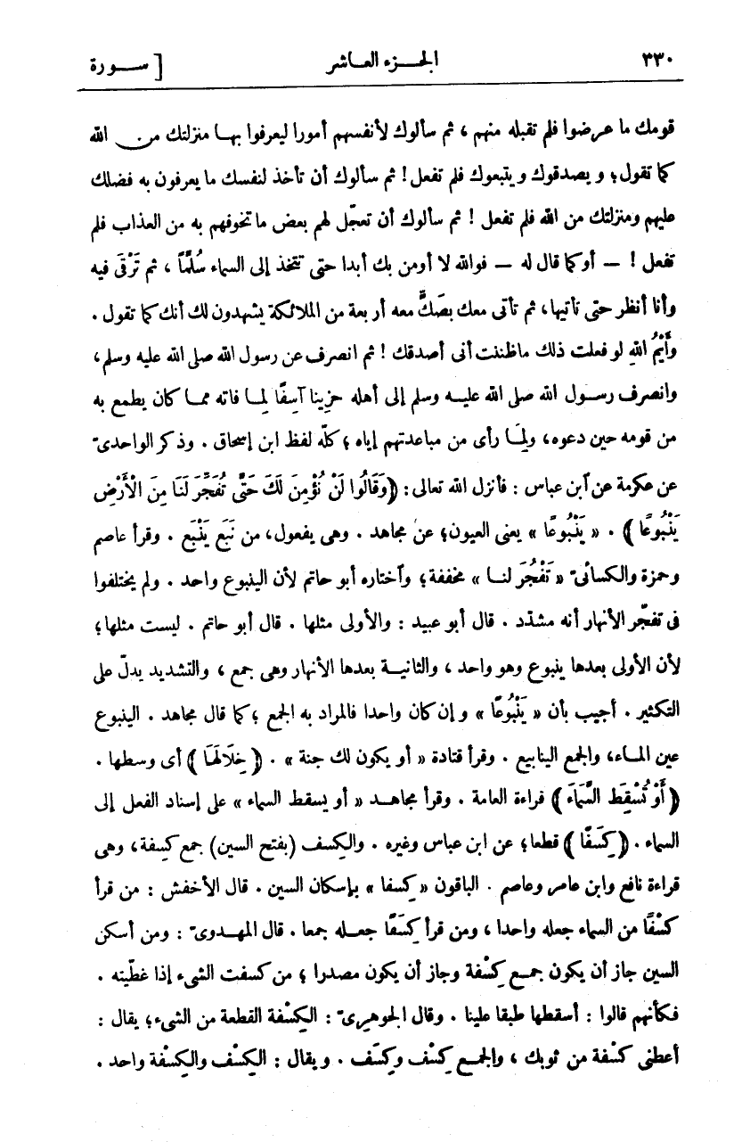 قَوْمُكَ مَا عَرَضُوا فَلَمْ تَقْبَلْهُ مِنْهُمْ، ثُمَّ سَأَلُوكَ لِأَنْفُسِهِمْ أُمُورًا لِيَعْرِفُوا بِهَا مَنْزِلَتَكَ مِنَ اللَّهِ كَمَا تَقُولُ، وَيُصَدِّقُوكَ وَيَتَّبِعُوكَ فَلَمْ تَفْعَلْ ثُمَّ سَأَلُوكَ أَنْ تَأْخُذَ لِنَفْسِكَ مَا يَعْرِفُونَ بِهِ فَضْلَكَ عَلَيْهِمْ وَمَنْزِلَتَكَ مِنَ اللَّهِ فَلَمْ تَفْعَلْ ثُمَّ سَأَلُوكَ أَنْ تُعَجِّلَ لَهُمْ بَعْضَ مَا تُخَوِّفُهُمْ بِهِ مِنَ الْعَذَابِ فَلَمْ تَفْعَلْ- أو كما قال له- فوالله لا أؤمن بِكَ أَبَدًا حَتَّى تَتَّخِذَ إِلَى السَّمَاءِ سُلَّمًا، ثُمَّ تَرْقَى فِيهِ وَأَنَا أَنْظُرُ حَتَّى تَأْتِيَهَا، ثُمَّ تَأْتِي مَعَكَ بِصَكٍّ مَعَهُ أَرْبَعَةٌ مِنَ الْمَلَائِكَةِ يَشْهَدُونَ لَكَ أَنَّكَ كَمَا تَقُولُ. وَايْمُ اللَّهِ لَوْ فَعَلْتَ ذَلِكَ مَا ظَنَنْتُ أَنِّي أُصَدِّقُكَ ثُمَّ انْصَرَفَ عَنْ رَسُولِ اللَّهِ صَلَّى اللَّهُ عَلَيْهِ وَسَلَّمَ، وَانْصَرَفَ رَسُولُ اللَّهِ صَلَّى اللَّهُ عَلَيْهِ وَسَلَّمَ إِلَى أَهْلِهِ حَزِينًا آسِفًا لِمَا فَاتَهُ مِمَّا كَانَ يَطْمَعُ بِهِ مِنْ قَوْمِهِ حِينَ دَعَوْهُ، وَلِمَا رَأَى مِنْ مُبَاعَدَتِهِمْ إِيَّاهُ، كُلُّهُ لَفْظُ ابْنِ إِسْحَاقَ. وَذَكَرَ الْوَاحِدِيُّ عَنْ عِكْرِمَةَ عَنِ ابْنِ عَبَّاسٍ: فَأَنْزَلَ اللَّهُ تَعَالَى: (وَقالُوا لَنْ نُؤْمِنَ لَكَ حَتَّى تَفْجُرَ لَنا مِنَ الْأَرْضِ يَنْبُوعاً) "." يَنْبُوعاً" يَعْنِي الْعُيُونَ، عَنْ مُجَاهِدٍ. وَهِيَ يَفْعُولٌ، مِنْ نَبَعَ يَنْبَعُ. وَقَرَأَ عَاصِمٌ وَحَمْزَةُ وَالْكِسَائِيُّ" تَفْجُرَ لَنَا" مُخَفَّفَةً، وَاخْتَارَهُ أَبُو حَاتِمٍ لِأَنَّ الْيَنْبُوعَ وَاحِدٌ. وَلَمْ يَخْتَلِفُوا فِي تَفَجُّرِ الْأَنْهَارَ أَنَّهُ مُشَدَّدٌ. قَالَ أَبُو عُبَيْدٍ: وَالْأُولَى مِثْلُهَا. قَالَ أَبُو حَاتِمٍ. لَيْسَتْ مِثْلَهَا، لِأَنَّ الْأُولَى بَعْدَهَا يَنْبُوعٌ وَهُوَ وَاحِدٌ، وَالثَّانِيَةُ بَعْدَهَا الْأَنْهَارُ وَهِيَ جَمْعٌ، وَالتَّشْدِيدُ يَدُلُّ عَلَى التَّكْثِيرِ. أُجِيبَ بِأَنَّ" يَنْبُوعاً" وَإِنْ كَانَ وَاحِدًا فَالْمُرَادُ بِهِ الْجَمْعُ، كَمَا قَالَ مُجَاهِدٌ. الْيَنْبُوعُ عَيْنُ الْمَاءِ، وَالْجَمْعُ الْيَنَابِيعُ. وَقَرَأَ قتادة" أَوْ تَكُونَ لَكَ جَنَّةٌ". (خِلالَها) أَيْ وَسَطَهَا. (أَوْ تُسْقِطَ السَّماءَ) قِرَاءَةُ الْعَامَّةِ. وَقَرَأَ مُجَاهِدٌ" أَوْ يَسْقُطَ السَّمَاءُ" عَلَى إِسْنَادِ الْفِعْلِ إِلَى السَّمَاءِ. (كِسَفاً) قِطَعًا، عَنِ ابْنِ عَبَّاسٍ وَغَيْرِهِ. وَالْكِسَفُ (بِفَتْحِ السِّينِ) جَمْعُ كِسْفَةٍ، وَهِيَ قِرَاءَةُ نَافِعٍ وَابْنِ عَامِرٍ وَعَاصِمٍ. الْبَاقُونَ" كِسَفاً" بِإِسْكَانِ السِّينِ. قَالَ الْأَخْفَشُ: مَنْ قَرَأَ كِسْفًا مِنَ السَّمَاءِ جَعَلَهُ وَاحِدًا، وَمَنْ قَرَأَ كِسَفًا جَعَلَهُ جَمْعًا. قَالَ الْمَهْدَوِيُّ: وَمَنْ أَسْكَنَ السِّينَ جَازَ أَنْ يَكُونَ جَمْعُ كِسْفَةٍ وَجَازَ أَنْ يَكُونَ مَصْدَرًا، مِنْ كَسَفْتُ الشَّيْءَ إِذَا غَطَّيْتُهُ. فَكَأَنَّهُمْ قَالُوا: أَسْقِطْهَا طَبَقًا عَلَيْنَا. وَقَالَ الْجَوْهَرِيُّ. الْكِسْفَةُ الْقِطْعَةُ مِنَ الشَّيْءِ، يُقَالُ: أَعْطِنِي كِسْفَةً مِنْ ثَوْبِكَ، وَالْجَمْعُ كِسَفٌ وَكِسْفٌ. وَيُقَالُ: الْكِسْفَةُ وَاحِدٌ.