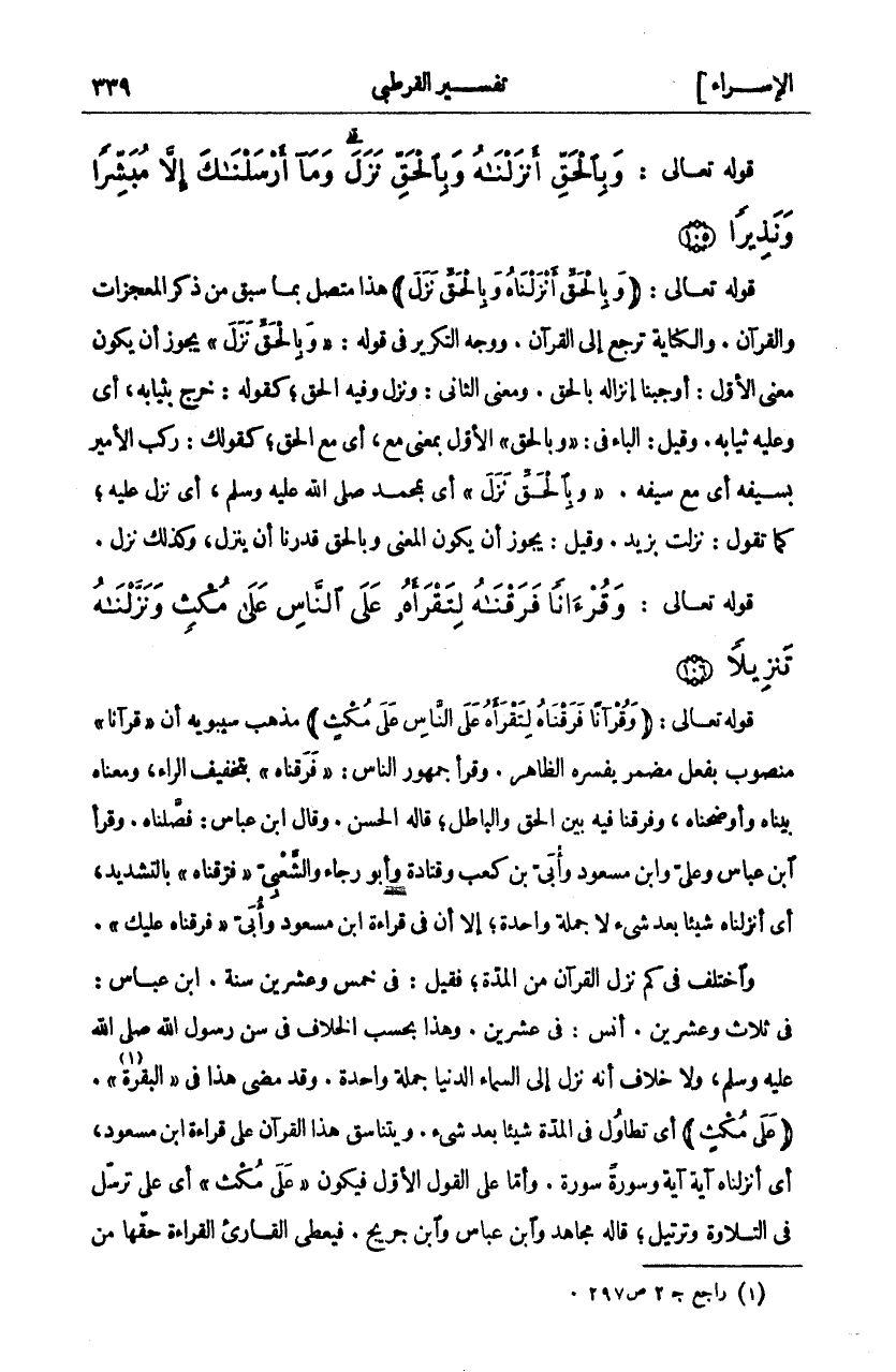 قَوْلُهُ تَعَالَى: (وَبِالْحَقِّ أَنْزَلْناهُ وَبِالْحَقِّ نَزَلَ) هَذَا مُتَّصِلٌ بِمَا سَبَقَ مِنْ ذِكْرِ الْمُعْجِزَاتِ وَالْقُرْآنِ. وَالْكِنَايَةُ تَرْجِعُ إِلَى الْقُرْآنِ. وَوَجْهُ التَّكْرِيرِ فِي قَوْلِهِ" وَبِالْحَقِّ نَزَلَ" يَجُوزُ أَنْ يَكُونَ مَعْنَى الْأَوَّلِ: أَوْجَبْنَا إِنْزَالَهُ بِالْحَقِّ. وَمَعْنَى الثَّانِي: وَنَزَلَ وَفِيهِ الْحَقُّ، كَقَوْلِهِ خَرَجَ بِثِيَابِهِ، أَيْ وَعَلَيْهِ ثِيَابُهُ. وَقِيلَ الْبَاءُ فِي" وَبِالْحَقِّ" الْأَوَّلُ بِمَعْنَى مَعَ، أَيْ مَعَ الْحَقِّ، كَقَوْلِكَ رَكِبَ الْأَمِيرُ بِسَيْفِهِ أَيْ مَعَ سَيْفِهِ." وَبِالْحَقِّ نَزَلَ" أَيْ بِمُحَمَّدٍ صَلَّى اللَّهُ عَلَيْهِ وَسَلَّمَ، أَيْ نَزَلَ عَلَيْهِ، كَمَا تَقُولُ نَزَلْتُ بِزَيْدٍ. وَقِيلَ: يَجُوزُ أَنْ يَكُونَ الْمَعْنَى وَبِالْحَقِّ قَدَّرْنَا أن ينزل، وكذلك نزل.