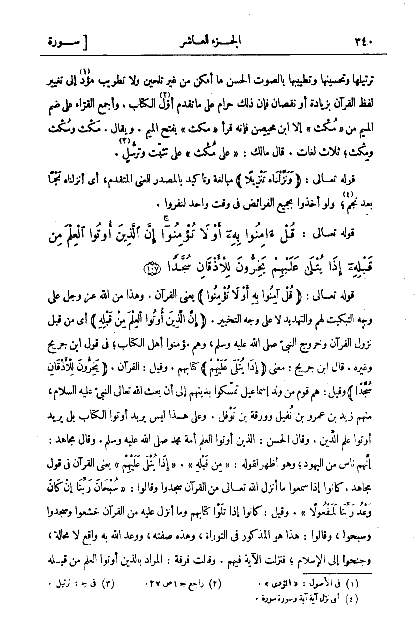 قُلْ آمِنُوا بِهِ أَوْ لَا تُؤْمِنُوا إِنَّ الَّذِينَ أُوتُوا الْعِلْمَ مِنْ قَبْلِهِ إِذا يُتْلى عَلَيْهِمْ يَخِرُّونَ لِلْأَذْقانِ سُجَّداً (١٠٧)