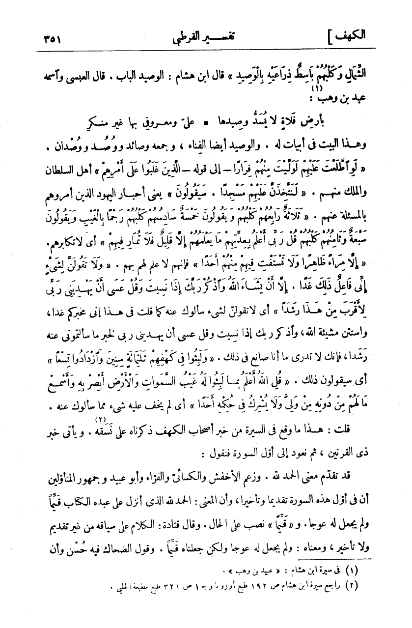 وَهَذَا الْبَيْتُ فِي أَبْيَاتٍ لَهُ. وَالْوَصِيدُ أَيْضًا الْفِنَاءُ، وَجَمْعُهُ وَصَائِدُ وَوُصُدٌ وَوُصْدَانٌ. لَوِ اطَّلَعْتَ عَلَيْهِمْ لَوَلَّيْتَ مِنْهُمْ فِراراً- إِلَى قَوْلِهِ- الَّذِينَ غَلَبُوا عَلى أَمْرِهِمْ أَهْلُ السُّلْطَانِ وَالْمُلْكِ مِنْهُمْ." لَنَتَّخِذَنَّ عَلَيْهِمْ مَسْجِداً. سَيَقُولُونَ" يَعْنِي أَحْبَارَ الْيَهُودِ الَّذِينَ أَمَرُوهُمْ بِالْمَسْأَلَةِ عَنْهُمْ." ثَلاثَةٌ رابِعُهُمْ كَلْبُهُمْ وَيَقُولُونَ خَمْسَةٌ سادِسُهُمْ كَلْبُهُمْ رَجْماً بِالْغَيْبِ وَيَقُولُونَ سَبْعَةٌ وَثامِنُهُمْ كَلْبُهُمْ قُلْ رَبِّي أَعْلَمُ بِعِدَّتِهِمْ مَا يَعْلَمُهُمْ إِلَّا قَلِيلٌ فَلا تُمارِ فِيهِمْ" أَيْ لَا تُكَابِرْهُمْ." إِلَّا مِراءً ظاهِراً وَلا تَسْتَفْتِ فِيهِمْ مِنْهُمْ أَحَداً" فَإِنَّهُمْ لَا عِلْمَ لَهُمْ بِهِمْ." وَلا تَقُولَنَّ لِشَيْءٍ إِنِّي فاعِلٌ ذلِكَ غَداً. إِلَّا أَنْ يَشاءَ اللَّهُ وَاذْكُرْ رَبَّكَ إِذا نَسِيتَ وَقُلْ عَسى أَنْ يَهْدِيَنِ رَبِّي لِأَقْرَبَ مِنْ هَذَا رَشَداً" أَيْ لَا تَقُولَنَّ لِشَيْءٍ سَأَلُوكَ عَنْهُ كَمَا قُلْتَ فِي هَذَا إِنِّي مُخْبِرُكُمْ غَدًا، وَاسْتَثْنِ مَشِيئَةَ اللَّهِ، واذكر ربك إذا نسيت وقل عسى أن يَهْدِيَنِي رَبِّي لِخَبَرِ مَا سَأَلْتُمُونِي عَنْهُ رَشَدًا، فَإِنَّكَ لَا تَدْرِي مَا أَنَا صَانِعٌ فِي ذَلِكَ." وَلَبِثُوا فِي كَهْفِهِمْ ثَلاثَ مِائَةٍ سِنِينَ وَازْدَادُوا تِسْعاً" أَيْ سَيَقُولُونَ ذَلِكَ." قُلِ اللَّهُ أَعْلَمُ بِما لَبِثُوا لَهُ غَيْبُ السَّماواتِ وَالْأَرْضِ أَبْصِرْ بِهِ وَأَسْمِعْ مَا لَهُمْ مِنْ دُونِهِ مِنْ وَلِيٍّ وَلا يُشْرِكُ فِي حُكْمِهِ أَحَداً" أي لم يخف عليه شي ما سَأَلُوكَ عَنْهُ. قُلْتُ: هَذَا مَا وَقَعَ فِي السِّيرَةِ مِنْ خَبَرِ أَصْحَابِ الْكَهْفِ ذَكَرْنَاهُ عَلَى نَسَقِهِ «٢». وَيَأْتِي خَبَرُ ذِي الْقَرْنَيْنِ، ثُمَّ نَعُودُ إِلَى أَوَّلِ السُّورَةِ فَنَقُولُ: قَدْ تَقَدَّمَ مَعْنَى الْحَمْدُ لِلَّهِ. وَزَعَمَ الْأَخْفَشُ وَالْكِسَائِيُّ وَالْفَرَّاءُ وَأَبُو عُبَيْدٍ وَجُمْهُورُ الْمُتَأَوِّلِينَ أَنَّ فِي أَوَّلِ هَذِهِ السُّورَةِ تَقْدِيمًا وَتَأْخِيرًا، وَأَنَّ الْمَعْنَى: الْحَمْدُ لِلَّهِ الَّذِي أَنْزَلَ عَلَى عَبْدِهِ الْكِتَابَ قَيِّمًا وَلَمْ يجعل له عوجا. و" قَيِّماً" نُصِبَ عَلَى الْحَالِ. وَقَالَ قَتَادَةُ: الْكَلَامُ عَلَى سِيَاقِهِ مِنْ غَيْرِ تَقْدِيمٍ وَلَا تَأْخِيرٍ، وَمَعْنَاهُ: وَلَمْ يَجْعَلْ لَهُ عِوَجًا وَلَكِنْ جَعَلْنَاهُ قيما. وقول الضحاك فيه حسن، وأن