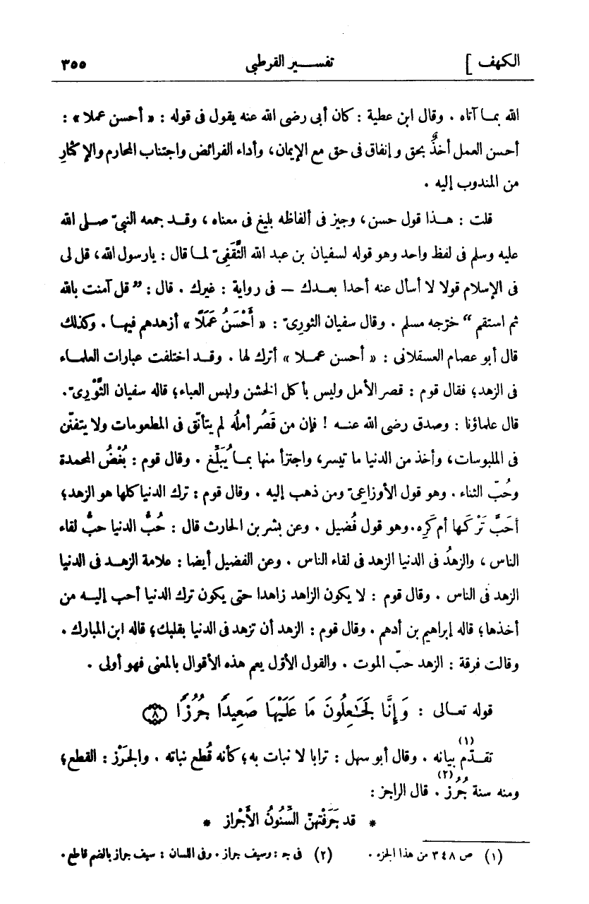 اللَّهُ بِمَا أَتَاهُ. وَقَالَ ابْنُ عَطِيَّةَ: كَانَ أَبِي رَضِيَ اللَّهُ عَنْهُ يَقُولُ فِي قَوْلِهِ" أَحْسَنُ عَمَلًا": أَحْسَنُ الْعَمَلِ أَخَذٌ بِحَقٍّ وَإِنْفَاقٌ فِي حَقٍّ مَعَ الْإِيمَانِ وَأَدَاءِ الْفَرَائِضِ وَاجْتِنَابِ الْمَحَارِمِ وَالْإِكْثَارِ مِنَ الْمَنْدُوبِ إِلَيْهِ. قُلْتُ: هَذَا قَوْلٌ حَسَنٌ، وَجِيزٌ فِي أَلْفَاظِهِ بَلِيغٌ فِي مَعْنَاهُ، وَقَدْ جَمَعَهُ النَّبِيُّ صَلَّى اللَّهُ عَلَيْهِ وَسَلَّمَ فِي لَفْظٍ وَاحِدٍ وَهُوَ قَوْلُهُ لِسُفْيَانَ بْنِ عَبْدِ اللَّهِ الثَّقَفِيِّ لَمَّا قَالَ: يَا رَسُولَ اللَّهِ، قُلْ لِي فِي الْإِسْلَامِ قَوْلًا لَا أَسْأَلُ عَنْهُ أَحَدًا بَعْدَكَ- فِي رِوَايَةٍ: غَيْرَكَ. قَالَ:" قُلْ آمَنْتُ بِاللَّهِ ثُمَّ اسْتَقِمْ" خَرَّجَهُ مُسْلِمٌ. وَقَالَ سُفْيَانُ الثَّوْرِيُّ:" أَحْسَنُ عَمَلًا" أَزْهَدُهُمْ فِيهَا. وَكَذَلِكَ قَالَ أَبُو عِصَامٍ الْعَسْقَلَانِيُّ:" أَحْسَنُ عَمَلًا" أَتْرَكُ لَهَا. وَقَدِ اخْتَلَفَتْ عِبَارَاتُ الْعُلَمَاءِ فِي الزُّهْدِ، فَقَالَ قَوْمٌ: قِصَرُ الْأَمَلِ وَلَيْسَ بِأَكْلِ الْخَشِنِ وَلُبْسِ الْعَبَاءِ، قَالَهُ سُفْيَانُ الثَّوْرِيُّ. قَالَ عُلَمَاؤُنَا: وَصَدَقَ رَضِيَ اللَّهُ عَنْهُ لان مَنْ قَصُرَ أَمَلُهُ لَمْ يَتَأَنَّقْ فِي الْمَطْعُومَاتِ وَلَا يَتَفَنَّنْ فِي الْمَلْبُوسَاتِ، وَأَخَذَ مِنَ الدُّنْيَا مَا تَيَسَّرَ، وَاجْتَزَأَ مِنْهَا بِمَا يُبَلِّغُ. وَقَالَ قَوْمٌ: بُغْضُ الْمَحْمَدَةِ وَحُبُّ الثَّنَاءِ. وَهُوَ قَوْلُ الْأَوْزَاعِيِّ وَمَنْ ذَهَبَ إِلَيْهِ. وَقَالَ قَوْمٌ: تَرْكُ الدُّنْيَا كُلِّهَا هُوَ الزُّهْدُ، أَحَبَّ تَرْكَهَا أَمْ كَرِهَ. وَهُوَ قَوْلُ فُضَيْلٍ. وَعَنْ بِشْرِ بْنِ الْحَارِثِ قَالَ: حُبُّ الدُّنْيَا حُبُّ لِقَاءِ النَّاسِ، وَالزُّهْدُ فِي الدُّنْيَا الزُّهْدُ فِي لِقَاءِ النَّاسِ. وَعَنِ الْفُضَيْلِ أَيْضًا: عَلَامَةُ الزُّهْدِ فِي الدُّنْيَا الزُّهْدُ فِي النَّاسِ. وَقَالَ قَوْمٌ: لَا يَكُونُ الزَّاهِدُ زَاهِدًا حَتَّى يَكُونَ تَرْكُ الدُّنْيَا أَحَبَّ إليه من أخذها، قال إِبْرَاهِيمُ بْنُ أَدْهَمَ. وَقَالَ قَوْمٌ: الزُّهْدُ أَنْ تَزْهَدَ فِي الدُّنْيَا بِقَلْبِكَ، قَالَهُ ابْنُ الْمُبَارَكِ. وَقَالَتْ فِرْقَةٌ: الزُّهْدُ حُبُّ الْمَوْتِ. وَالْقَوْلُ الْأَوَّلُ يعم هذه الأقوال بالمعنى فهو أولى.