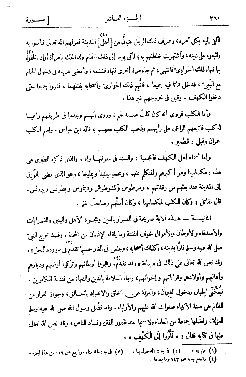 فَأَلْقَى إِلَيْهِ بِكُلِّ أَمْرِهِ، وَعَرَفَ ذَلِكَ الرَّجُلَ فتيان من [أهل] «١» الْمَدِينَةِ فَعَرَّفَهُمُ اللَّهَ تَعَالَى فَآمَنُوا بِهِ وَاتَّبَعُوهُ عَلَى دِينِهِ. وَاشْتَهَرَتْ خُلْطَتُهُمْ بِهِ، فَأَتَى يَوْمًا إِلَى ذَلِكَ الْحَمَّامِ وَلَدُ الْمَلِكِ بِامْرَأَةٍ أَرَادَ الْخَلْوَةَ «٢» بِهَا، فَنَهَاهُ ذَلِكَ الْحَوَارِيُّ فَانْتَهَى، ثُمَّ جَاءَ مَرَّةً أُخْرَى فَنَهَاهُ فَشَتَمَهُ، وَأَمْضَى عَزْمَهُ فِي دُخُولِ الْحَمَّامِ مَعَ الْبَغِيِّ، فَدَخَلَ فَمَاتَا فِيهِ جَمِيعًا، فَاتُّهِمَ ذَلِكَ الْحَوَارِيُّ وَأَصْحَابُهُ بِقَتْلِهِمَا، فَفَرُّوا جَمِيعًا حَتَّى دَخَلُوا الْكَهْفَ. وَقِيلَ فِي خُرُوجِهِمْ غَيْرُ هَذَا. وَأَمَّا الْكَلْبُ فَرُوِيَ أَنَّهُ كَانَ كَلْبَ صَيْدٍ لَهُمْ، وَرُوِيَ أَنَّهُمْ وَجَدُوا فِي طَرِيقِهِمْ رَاعِيًا لَهُ كَلْبٌ فَاتَّبَعَهُمُ الرَّاعِي على رأيهم وذهب الكلب معهم، قال ابْنُ عَبَّاسٍ. وَاسْمُ الْكَلْبِ حُمْرَانُ وَقِيلَ قِطْمِيرُ. وَأَمَّا أَسْمَاءُ أَهْلِ الْكَهْفِ فَأَعْجَمِيَّةٌ، وَالسَّنَدُ فِي مَعْرِفَتِهَا وَاهٍ. وَالَّذِي ذَكَرَهُ الطَّبَرِيُّ هِيَ هَذِهِ: مَكْسَلْمينا وَهُوَ أَكْبَرُهُمْ وَالْمُتَكَلِّمُ عَنْهُمْ، وَمحسيميلنينا وَيَمْليخَا، وَهُوَ الَّذِي مَضَى بِالْوَرِقِ إِلَى الْمَدِينَةِ عِنْدَ بَعْثِهِمْ مِنْ رَقَدْتِهِمْ، وَمَرْطوسُ وَكشوطوشُ وَدينموسُ وَيطونسُ وَبيرونسُ. قَالَ مُقَاتِلٌ: وَكَانَ الْكَلْبُ لِمَكْسَلْمينَا، وَكَانَ أَسَنَّهُمْ وَصَاحِبَ غَنَمٍ. الثَّانِيَةُ- هَذِهِ الْآيَةُ صَرِيحَةٌ فِي الْفِرَارِ بِالدِّينِ وَهِجْرَةِ الْأَهْلِ وَالْبَنِينَ وَالْقَرَابَاتِ وَالْأَصْدِقَاءِ وَالْأَوْطَانِ وَالْأَمْوَالِ خَوْفَ الْفِتْنَةِ وَمَا يَلْقَاهُ الْإِنْسَانُ مِنَ الْمِحْنَةِ. وَقَدْ خَرَجَ النَّبِيُّ صَلَّى اللَّهُ عَلَيْهِ وَسَلَّمَ فَارًّا بِدِينِهِ، وَكَذَلِكَ أَصْحَابُهُ، وَجَلَسَ فِي الْغَارِ حَسْبَمَا تَقَدَّمَ «٣» فِي سُورَةِ" النَّحْلِ". وَقَدْ نَصَّ اللَّهُ تَعَالَى عَلَى ذَلِكَ فِي" بَرَاءَةٌ" وَقَدْ تَقَدَّمَ «٤». وَهَجَرُوا أَوْطَانَهُمْ وَتَرَكُوا أَرْضَهُمْ وَدِيَارَهُمْ وَأَهَالِيَهُمْ وَأَوْلَادَهُمْ وَقَرَابَاتِهِمْ وَإِخْوَانَهُمْ، رَجَاءَ السَّلَامَةِ بِالدِّينِ وَالنَّجَاةِ مِنْ فِتْنَةِ الْكَافِرِينَ. فَسُكْنَى الْجِبَالِ وَدُخُولُ الْغِيرَانِ، وَالْعُزْلَةُ عَنِ الْخَلْقِ وَالِانْفِرَادُ بِالْخَالِقِ، وَجَوَازُ الْفِرَارِ مِنَ الظَّالِمِ هِيَ سُنَّةُ الْأَنْبِيَاءِ صَلَوَاتُ اللَّهِ عَلَيْهِمْ وَالْأَوْلِيَاءِ. وَقَدْ فَضَّلَ رَسُولُ اللَّهِ صَلَّى اللَّهُ عَلَيْهِ وَسَلَّمَ الْعُزْلَةَ، وَفَضَّلَهَا جَمَاعَةُ الْعُلَمَاءِ لَا سِيَّمَا عِنْدَ ظُهُورِ الْفِتَنِ وَفَسَادِ النَّاسِ، وَقَدْ نَصَّ اللَّهُ تَعَالَى عَلَيْهَا فِي كِتَابِهِ فَقَالَ:" فَأْوُوا إِلَى الْكَهْفِ".