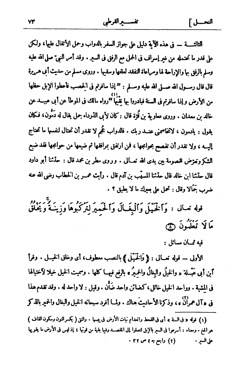 في الثَّالِثَةُ- فِي هَذِهِ الْآيَةِ دَلِيلٌ عَلَى جَوَازِ السَّفَرِ بِالدَّوَابِّ وَحَمْلِ الْأَثْقَالِ عَلَيْهَا. وَلَكِنْ عَلَى قَدْرِ مَا تَحْتَمِلُهُ مِنْ غَيْرِ إِسْرَافٍ فِي الْحَمْلِ مَعَ الرِّفْقِ فِي السَّيْرِ. وَقَدْ أَمَرَ النَّبِيُّ صَلَّى اللَّهُ عَلَيْهِ وَسَلَّمَ بِالرِّفْقِ بِهَا وَالْإِرَاحَةِ لَهَا وَمُرَاعَاةَ التَّفَقُّدِ لِعَلْفِهَا وَسَقْيِهَا. وَرَوَى مُسْلِمٍ مِنْ حَدِيثِ أَبِي هُرَيْرَةَ قَالَ قَالَ رَسُولَ اللَّهِ صَلَّى اللَّهُ عَلَيْهِ وَسَلَّمَ:" إِذَا سَافَرْتُمْ فِي الْخِصْبِ فَأَعْطُوا الْإِبِلَ حَظَّهَا مِنَ الْأَرْضِ وَإِذَا سَافَرْتُمْ فِي السَّنَةِ فَبَادِرُوا بِهَا نِقْيَهَا «١» " رَوَاهُ مَالِكٌ فِي الْمُوَطَّأِ عَنْ أَبِي عُبَيْدٍ عَنْ خَالِدِ بْنِ مَعْدَانَ. وَرَوَى مُعَاوِيَةُ بْنُ قُرَّةَ قَالَ كَانَ لِأَبِي الدَّرْدَاءِ جَمَلٌ يُقَالُ لَهُ دَمُّونُ، فَكَانَ يَقُولُ: يَا دَمُّونُ، لَا تُخَاصِمْنِي عِنْدَ رَبِّكَ. فَالدَّوَابُّ عُجْمٌ لَا تَقْدِرُ أَنْ تَحْتَالَ لِنَفْسِهَا مَا تَحْتَاجُ إِلَيْهِ، وَلَا تَقْدِرُ أَنْ تُفْصِحَ بِحَوَائِجِهَا، فَمَنِ ارْتَفَقَ بِمَرَافِقِهَا ثُمَّ ضَيَّعَهَا مِنْ حَوَائِجِهَا فَقَدْ ضَيَّعَ الشُّكْرَ وَتَعَرَّضَ لِلْخُصُومَةِ بَيْنَ يَدَيِ اللَّهِ تَعَالَى. وَرَوَى مَطَرُ بْنُ مُحَمَّدٍ قَالَ: حَدَّثَنَا أَبُو دَاوُدَ قَالَ حَدَّثَنَا ابْنُ خَالِدٍ قَالَ حَدَّثَنَا الْمُسَيَّبُ بْنُ آدَمَ قَالَ. رَأَيْتُ عُمَرَ بْنَ الْخَطَّابِ رَضِيَ اللَّهُ عَنْهُ ضَرَبَ جَمَّالًا وَقَالَ: تحمل على بعيرك ما لا يطيق؟.