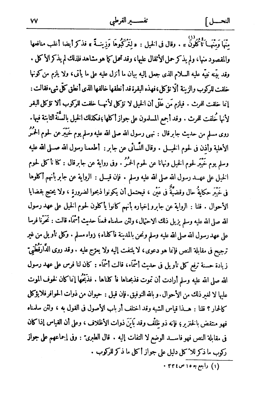 " الَّذِي جَعَلَ لَكُمُ الْأَنْعامَ لِتَرْكَبُوا مِنْها وَمِنْها تَأْكُلُونَ «١» ". وَقَالَ فِي الْخَيْلِ:" لِتَرْكَبُوها وَزِينَةً" فَذَكَرَ أَيْضًا أَغْلَبَ مَنَافِعِهَا وَالْمَقْصُودُ مِنْهَا، وَلَمْ يَذْكُرْ حَمْلَ الْأَثْقَالِ عَلَيْهَا، وَقَدْ تُحْمَلُ كَمَا هُوَ مُشَاهَدٌ فَلِذَلِكَ لَمْ يَذْكُرِ الْأَكْلَ. وَقَدْ بَيَّنَهُ عَلَيْهِ السَّلَامُ الَّذِي جَعَلَ إِلَيْهِ بَيَانَ مَا أَنْزَلَ عَلَيْهِ مَا يَأْتِي، وَلَا يَلْزَمُ مِنْ كَوْنِهَا خُلِقَتْ لِلرُّكُوبِ وَالزِّينَةِ أَلَّا تُؤْكَلَ، فَهَذِهِ الْبَقَرَةُ قَدْ أَنْطَقَهَا خَالِقُهَا الَّذِي أَنْطَقَ كُلَّ شي فَقَالَتْ: إِنَّمَا خُلِقَتْ لِلْحَرْثِ. فَيَلْزَمُ مِنْ عَلَّلَ أَنَّ الْخَيْلَ لَا تُؤْكَلُ لِأَنَّهَا خُلِقَتْ لِلرُّكُوبِ وألا تُؤْكَلَ الْبَقَرُ لِأَنَّهَا خُلِقَتْ لِلْحَرْثِ. وَقَدْ أَجْمَعَ الْمُسْلِمُونَ عَلَى جَوَازِ أَكْلِهَا، فَكَذَلِكَ الْخَيْلُ بِالسُّنَّةِ الثَّابِتَةِ فِيهَا. رَوَى مُسْلِمٌ مِنْ حَدِيثِ جَابِرٌ قَالَ: نَهَى رَسُولُ اللَّهِ صَلَّى اللَّهُ عَلَيْهِ وَسَلَّمَ يَوْمَ خَيْبَرَ عَنْ لُحُومِ الْحُمُرِ الْأَهْلِيَّةِ وَأَذِنَ فِي لُحُومِ الْخَيْلِ. وَقَالَ النَّسَائِيُّ عَنْ جَابِرٍ: أَطْعَمَنَا رَسُولُ اللَّهِ صَلَّى اللَّهُ عَلَيْهِ وَسَلَّمَ يَوْمَ خَيْبَرَ لُحُومَ الْخَيْلِ وَنَهَانَا عَنْ لُحُومِ الْحُمُرِ. وَفِي رِوَايَةٍ عَنْ جَابِرٍ قَالَ: كُنَّا نَأْكُلُ لُحُومَ الْخَيْلِ عَلَى عَهْدِ رَسُولِ اللَّهِ صَلَّى اللَّهُ عَلَيْهِ وَسَلَّمَ. فَإِنْ قِيلَ: الرِّوَايَةُ عَنْ جَابِرٍ بِأَنَّهُمْ أَكَلُوهَا فِي خَيْبَرَ حِكَايَةُ حَالٍ وَقَضِيَّةٌ فِي عَيْنٍ، فَيُحْتَمَلُ أَنْ يَكُونُوا ذَبَحُوا لِضَرُورَةٍ، وَلَا يُحْتَجُّ بِقَضَايَا الْأَحْوَالِ. قُلْنَا: الرِّوَايَةُ عَنْ جَابِرٍ وَإِخْبَارِهِ بِأَنَّهُمْ كَانُوا يَأْكُلُونَ لُحُومَ الْخَيْلِ عَلَى عَهْدِ رَسُولِ اللَّهِ صَلَّى اللَّهُ عَلَيْهِ وَسَلَّمَ يُزِيلُ ذَلِكَ الِاحْتِمَالَ، ولين سَلَّمْنَاهُ فَمَعَنَا حَدِيثُ أَسْمَاءَ قَالَتْ: نَحَرْنَا فَرَسًا عَلَى عَهْدِ رَسُولِ اللَّهِ صَلَّى اللَّهُ عَلَيْهِ وَسَلَّمَ وَنَحْنُ بِالْمَدِينَةِ فَأَكَلْنَاهُ، رَوَاهُ مُسْلِمٌ. وَكُلُّ تَأْوِيلٍ مِنْ غَيْرِ تَرْجِيحٍ فِي مُقَابَلَةِ النَّصِّ فَإِنَّمَا هُوَ دَعْوًى، لَا يُلْتَفَتُ إِلَيْهِ وَلَا يُعَرَّجُ عَلَيْهِ. وَقَدْ رَوَى الدَّارَقُطْنِيُّ زِيَادَةً حَسَنَةً تَرْفَعُ كُلَّ تَأْوِيلٍ فِي حَدِيثِ أَسْمَاءَ، قَالَتْ أَسْمَاءُ: كَانَ لَنَا فَرَسٌ عَلَى عَهْدِ رَسُولِ اللَّهِ صَلَّى اللَّهُ عَلَيْهِ وَسَلَّمَ أَرَادَتْ أَنْ تَمُوتَ فَذَبَحْنَاهَا فَأَكَلْنَاهَا. فَذَبْحُهَا إِنَّمَا كَانَ لِخَوْفِ الْمَوْتِ عَلَيْهَا لَا لِغَيْرِ ذَلِكَ مِنَ الْأَحْوَالِ. وَبِاللَّهِ التَّوْفِيقُ. فَإِنْ قِيلَ: حَيَوَانٌ مِنْ ذَوَاتِ الْحَوَافِرِ فَلَا يُؤْكَلُ كَالْحِمَارِ؟ قُلْنَا: هَذَا قِيَاسُ الشَّبَهِ وَقَدِ اخْتَلَفَ أَرْبَابُ الْأُصُولِ فِي الْقَوْلِ به، ولين سَلَّمْنَاهُ فَهُوَ مُنْتَقِضٌ بِالْخِنْزِيرِ، فَإِنَّهُ ذُو ظِلْفٍ وَقَدْ بَايَنَ ذَوَاتَ الْأَظْلَافِ، وَعَلَى أَنَّ الْقِيَاسَ إِذَا كَانَ فِي مُقَابَلَةِ النَّصِّ فَهُوَ فَاسِدُ الْوَضْعِ لَا الْتِفَاتَ إِلَيْهِ. قَالَ الطَّبَرِيُّ: وَفِي إِجْمَاعِهِمْ عَلَى جَوَازِ رُكُوبِ مَا ذُكِرَ لِلْأَكْلِ دَلِيلٌ عَلَى جَوَازِ أَكْلِ مَا ذُكِرَ لِلرُّكُوبِ.