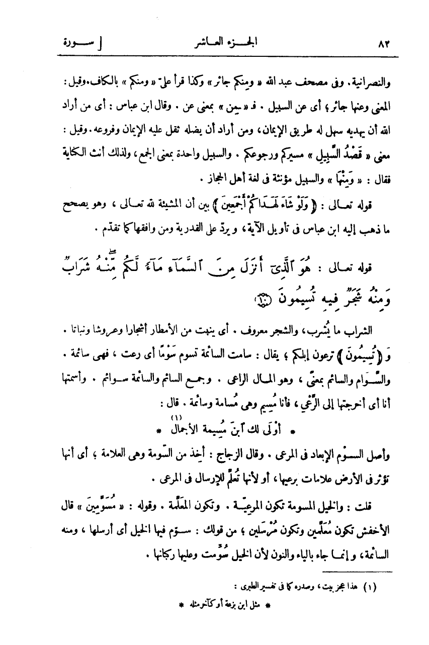 الشَّرَابُ مَا يُشْرَبُ، وَالشَّجَرُ مَعْرُوفٌ. أَيْ يُنْبِتُ مِنَ الأمطار أشجارا وعروشا ونباتا. و (تُسِيمُونَ) تَرْعَوْنَ إِبِلَكُمْ، يُقَالُ: سَامَتِ السَّائِمَةُ تَسُومُ سَوْمًا أَيْ رَعَتْ، فَهِيَ سَائِمَةٌ. وَالسَّوَامُ وَالسَّائِمُ بِمَعْنًى، وَهُوَ الْمَالُ الرَّاعِي. وَجَمْعُ السَّائِمِ وَالسَّائِمَةِ سَوَائِمُ. وَأَسَمْتُهَا أَنَا أَيْ أَخْرَجْتُهَا إِلَى الرَّعْيِ، فَأَنَا مُسِيمٌ وَهِيَ مُسَامَةٌ وَسَائِمَةٌ. قَالَ: