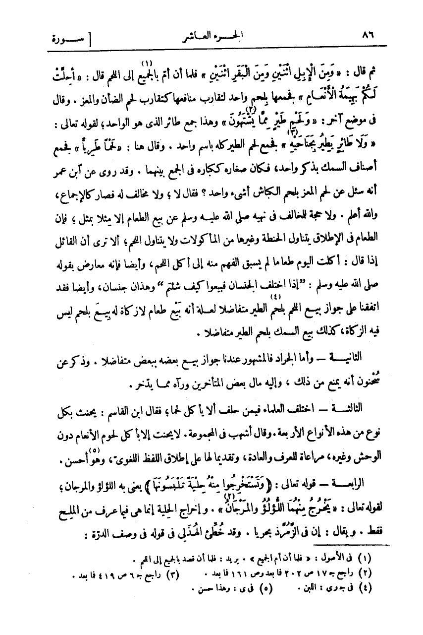 ثُمَّ قَالَ:" وَمِنَ الْإِبِلِ اثْنَيْنِ وَمِنَ الْبَقَرِ اثْنَيْنِ" فَلَمَّا أَنْ أَمَّ بِالْجَمِيعِ «١» إِلَى اللَّحْمِ قَالَ:" أُحِلَّتْ لَكُمْ بَهِيمَةُ الْأَنْعامِ" فَجَمَعَهَا بِلَحْمٍ وَاحِدٍ لِتَقَارُبِ مَنَافِعهَا كَتَقَارُبِ لَحْمِ الضَّأْنِ وَالْمَعْزِ. وَقَالَ فِي مَوْضِعٍ آخَرَ:" وَلَحْمِ طَيْرٍ مِمَّا يَشْتَهُونَ «٢» " وَهَذَا جَمْعُ طَائِرٍ الَّذِي هُوَ الْوَاحِدُ، لِقَوْلِهِ تَعَالَى:" وَلا طائِرٍ يَطِيرُ بِجَناحَيْهِ «٣» " فَجَمَعَ لَحْمَ الطَّيْرِ كُلَّهُ بِاسْمٍ وَاحِدٍ. وَقَالَ هُنَا:" لَحْماً طَرِيًّا" فَجَمَعَ أَصْنَافَ السَّمَكِ بِذِكْرٍ وَاحِدٍ، فَكَانَ صِغَارُهُ كَكِبَارِهِ فِي الْجَمْعِ بَيْنَهُمَا. وَقَدْ رُوِيَ عَنِ ابْنِ عُمَرَ أَنَّهُ سُئِلَ عَنْ لَحْمِ الْمَعْزِ بِلَحْمِ الْكِبَاشِ أَشَيْءٌ وَاحِدٌ؟ فَقَالَ لَا، وَلَا مُخَالِفَ لَهُ فَصَارَ كَالْإِجْمَاعِ، وَاللَّهُ أَعْلَمُ. وَلَا حُجَّةَ لِلْمُخَالِفِ فِي نَهْيِهِ صَلَّى اللَّهُ عَلَيْهِ وَسَلَّمَ عَنْ بَيْعِ الطَّعَامِ إِلَّا مِثْلًا بِمِثْلٍ، فَإِنَّ الطَّعَامَ فِي الْإِطْلَاقِ يَتَنَاوَلُ الْحِنْطَةَ وَغَيْرَهَا مِنَ الْمَأْكُولَاتِ وَلَا يَتَنَاوَلُ اللَّحْمَ، أَلَا تَرَى أَنَّ الْقَائِلَ إِذَا قَالَ: أَكَلْتُ الْيَوْمَ طَعَامًا لَمْ يَسْبِقِ الْفَهْمُ مِنْهُ إِلَى أَكْلِ اللَّحْمِ، وَأَيْضًا فَإِنَّهُ مُعَارَضٌ بِقَوْلِهِ صَلَّى اللَّهُ عَلَيْهِ وَسَلَّمَ:" إِذَا اخْتَلَفَ الْجِنْسَانِ فَبِيعُوا كَيْفَ شِئْتُمْ" وَهَذَانِ جِنْسَانِ، وَأَيْضًا فَقَدِ اتَّفَقْنَا عَلَى جَوَازِ بَيْعِ اللَّحْمِ بِلَحْمِ «٤» الطَّيْرِ مُتَفَاضِلًا لَا لِعِلَّةِ أَنَّهُ بَيْعُ طَعَامٍ لَا زَكَاةَ لَهُ بِيعَ بِلَحْمٍ لَيْسَ فِيهِ الزَّكَاةُ، وَكَذَلِكَ بَيْعُ السَّمَكِ بِلَحْمِ الطَّيْرِ مُتَفَاضِلًا. الثَّانِيَةُ- وَأَمَّا الْجَرَادُ فَالْمَشْهُورُ عِنْدَنَا جَوَازُ بَيْعِ بَعْضِهِ بِبَعْضٍ مُتَفَاضِلًا. وَذُكِرَ عَنْ سُحْنُونٍ أَنَّهُ يَمْنَعُ مِنْ ذَلِكَ، وَإِلَيْهِ مَالَ بَعْضَ الْمُتَأَخِّرِينَ وَرَآهُ مِمَّا يدخر. الثالثة- لاختلف الْعُلَمَاءُ فِيمَنْ حَلَفَ أَلَّا يَأْكُلَ لَحْمًا، فَقَالَ ابْنُ الْقَاسِمِ: يَحْنَثُ بِكُلِّ نَوْعٍ مِنْ هَذِهِ الأنواع الاربعة. وقال أشهب في المجموعة. يَحْنَثُ إِلَّا بِكُلِّ لُحُومِ الْأَنْعَامِ دُونَ الْوَحْشِ وَغَيْرِهِ، مُرَاعَاةً لِلْعُرْفِ وَالْعَادَةِ، وَتَقْدِيمًا لَهَا عَلَى إِطْلَاقِ اللَّفْظِ اللُّغَوِيِّ، وَهُوَ «٥» أَحْسَنُ. الرَّابِعَةُ- قَوْلُهُ تَعَالَى: وَتَسْتَخْرِجُوا مِنْهُ حِلْيَةً تَلْبَسُونَها يَعْنِي بِهِ اللُّؤْلُؤَ وَالْمَرْجَانَ، لِقَوْلِهِ تَعَالَى:" يَخْرُجُ مِنْهُمَا اللُّؤْلُؤُ وَالْمَرْجانُ «٦» ". وَإِخْرَاجُ الْحِلْيَةِ إِنَّمَا هِيَ فِيمَا عُرِفَ مِنَ الْمِلْحِ فَقَطْ. وَقَالَ: إِنَّ فِي الزُّمُرُّدِ بَحْرِيًّا. وَقَدْ خُطِّئَ الْهُذَلِيُّ فِي قَوْلِهِ فِي وصف الدرة: