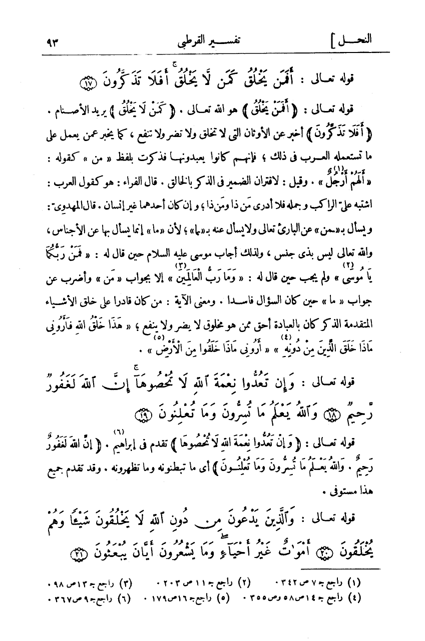 قَوْلُهُ تَعَالَى:" أَفَمَنْ يَخْلُقُ" هُوَ اللَّهُ تَعَالَى. (كَمَنْ لَا يَخْلُقُ) يُرِيدُ الْأَصْنَامَ. (أَفَلا تَذَكَّرُونَ) أَخْبَرَ عَنِ الْأَوْثَانِ الَّتِي لَا تَخْلُقُ وَلَا تضر ولا تنفع، كما يخبر عمن يعمل عَلَى مَا تَسْتَعْمِلُهُ الْعَرَبُ فِي ذَلِكَ، فَإِنَّهُمْ كَانُوا يَعْبُدُونَهَا فَذُكِرَتْ بِلَفْظِ" مَنْ" كَقَوْلِهِ:" أَلَهُمْ أَرْجُلٌ «١» ". وَقِيلَ: لِاقْتِرَانِ الضَّمِيرِ فِي الذِّكْرِ بِالْخَالِقِ. قَالَ الْفَرَّاءُ: هُوَ كَقَوْلِ الْعَرَبِ: اشْتَبَهَ عَلَيَّ الرَّاكِبُ وَجَمَلُهُ فَلَا أَدْرِي مَنْ ذَا وَمَنْ ذَا، وَإِنْ كَانَ أَحَدُهُمَا غَيْرُ إِنْسَانٍ. قَالَ الْمَهْدَوِيُّ: وَيُسْأَلُ بِ" مَنْ" عَنِ الْبَارِئِ تَعَالَى وَلَا يُسْأَلُ عَنْهُ بِ" مَا"، لِأَنَّ" مَا" إِنَّمَا يُسْأَلُ بِهَا عَنِ الْأَجْنَاسِ، وَاللَّهُ تَعَالَى لَيْسَ بِذِي جِنْسٍ، وَلِذَلِكَ أَجَابَ مُوسَى عَلَيْهِ السلام حين قال له:" فَمَنْ رَبُّكُما يا مُوسى «٢» " وَلَمْ يُجِبْ حِينَ قَالَ لَهُ:" وَما رَبُّ الْعالَمِينَ «٣» " إِلَّا بِجَوَابِ" مَنْ" وَأَضْرَبَ عَنْ جَوَابِ" مَا" حِينَ كَانَ السُّؤَالُ فَاسِدًا. وَمَعْنَى الْآيَةِ: مَنْ كَانَ قَادِرًا عَلَى خَلْقِ الْأَشْيَاءِ الْمُتَقَدِّمَةِ الذِّكْرِ كَانَ بِالْعِبَادَةِ أَحَقُّ مِمَّنْ هُوَ مَخْلُوقٌ لَا يَضُرُّ وَلَا يَنْفَعُ،" هَذَا خَلْقُ اللَّهِ فَأَرُونِي مَاذَا خَلَقَ الَّذِينَ مِنْ دُونِهِ «٤» "" أَرُونِي ماذا خَلَقُوا مِنَ الْأَرْضِ «٥» ".