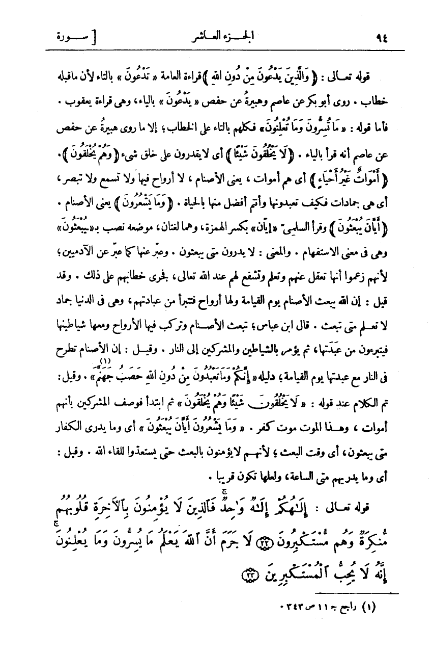 قَوْلُهُ تَعَالَى: (وَالَّذِينَ يَدْعُونَ مِنْ دُونِ اللَّهِ) قِرَاءَةُ الْعَامَّةِ" تَدْعُونَ" بِالتَّاءِ لِأَنَّ مَا قَبْلَهُ خِطَابٌ. رَوَى أَبُو بَكْرٍ عَنْ عَاصِمٍ وَهُبَيْرَةَ عَنْ حَفْصٍ" يَدْعُونَ" بِالْيَاءِ، وَهِيَ قِرَاءَةُ يَعْقُوبَ. فَأَمَّا قَوْلُهُ:" مَا تُسِرُّونَ وَما تُعْلِنُونَ" فَكُلُّهُمْ بِالتَّاءِ عَلَى الْخِطَابِ، إِلَّا مَا رَوَى هُبَيْرَةُ عَنْ حَفْصٍ عَنْ عَاصِمٍ أَنَّهُ قَرَأَ بِالْيَاءِ. (لَا يَخْلُقُونَ شَيْئاً) أَيْ لَا يَقْدِرُونَ عَلَى خلق شي (وَهُمْ يُخْلَقُونَ). (أَمْواتٌ غَيْرُ أَحْياءٍ) أَيْ هُمْ أَمْوَاتٌ، يَعْنِي الْأَصْنَامَ، لَا أَرْوَاحَ فِيهَا وَلَا تَسْمَعُ وَلَا تُبْصِرُ، أَيْ هِيَ جَمَادَاتٌ فَكَيْفَ تَعْبُدُونَهَا وَأَنْتُمْ أَفْضَلُ مِنْهَا بِالْحَيَاةِ. (وَما يَشْعُرُونَ) يَعْنِي الْأَصْنَامَ. (أَيَّانَ يُبْعَثُونَ) وَقَرَأَ السُّلَمِيُّ،" إِيَّانَ" بِكَسْرِ الْهَمْزَةِ، وَهُمَا لُغَتَانِ، مَوْضِعُهُ نُصِبَ بِ" يُبْعَثُونَ" وَهِيَ فِي مَعْنَى الِاسْتِفْهَامِ. وَالْمَعْنَى: لَا يَدْرُونَ مَتَى يُبْعَثُونَ. وَعَبَّرَ عَنْهَا كَمَا عَبَّرَ عَنِ الْآدَمِيِّينَ، لِأَنَّهُمْ زَعَمُوا أَنَّهَا تَعْقِلُ عَنْهُمْ وَتَعْلَمُ وَتَشْفَعُ لَهُمْ عِنْدَ اللَّهِ تَعَالَى، فَجَرَى خِطَابُهُمْ عَلَى ذَلِكَ. وَقَدْ قِيلَ: إِنَّ اللَّهَ يَبْعَثُ الْأَصْنَامَ يَوْمَ الْقِيَامَةِ وَلَهَا أَرْوَاحٌ فَتَتَبَرَّأُ مِنْ عِبَادَتِهِمْ، وَهِيَ فِي الدُّنْيَا جَمَادٌ لَا تَعْلَمُ مَتَى تُبْعَثُ. قَالَ ابْنُ عَبَّاسٍ، تُبْعَثُ الْأَصْنَامُ وَتُرَكَّبُ فِيهَا الْأَرْوَاحُ وَمَعَهَا شَيَاطِينُهَا فَيَتَبَرَّءُونَ مِنْ عَبَدَتِهَا، ثُمَّ يُؤْمَرُ بِالشَّيَاطِينِ وَالْمُشْرِكِينَ إِلَى النَّارِ. وَقِيلَ: إِنَّ الْأَصْنَامَ تُطْرَحُ فِي النَّارِ مَعَ عَبَدَتِهَا يَوْمَ الْقِيَامَةِ، دَلِيلُهُ" إِنَّكُمْ وَما تَعْبُدُونَ مِنْ دُونِ اللَّهِ حَصَبُ جَهَنَّمَ «١» ". وَقِيلَ: تَمَّ الْكَلَامُ عِنْدَ قَوْلِهِ:" لَا يَخْلُقُونَ شَيْئاً وَهُمْ يُخْلَقُونَ" ثُمَّ ابْتَدَأَ فَوَصَفَ الْمُشْرِكِينَ بِأَنَّهُمْ أَمْوَاتٌ، وَهَذَا الْمَوْتُ مَوْتُ كُفْرٍ." وَما يَشْعُرُونَ أَيَّانَ يُبْعَثُونَ" أَيْ وَمَا يَدْرِي الْكُفَّارُ مَتَى يُبْعَثُونَ، أَيْ وَقْتَ الْبَعْثِ، لِأَنَّهُمْ لَا يُؤْمِنُونَ بِالْبَعْثِ حَثَى يَسْتَعِدُّوا لِلِقَاءِ اللَّهِ. وَقِيلَ: أَيْ وَمَا يُدْرِيهِمْ مَتَى السَّاعَةُ، وَلَعَلَّهَا تَكُونُ قَرِيبًا.