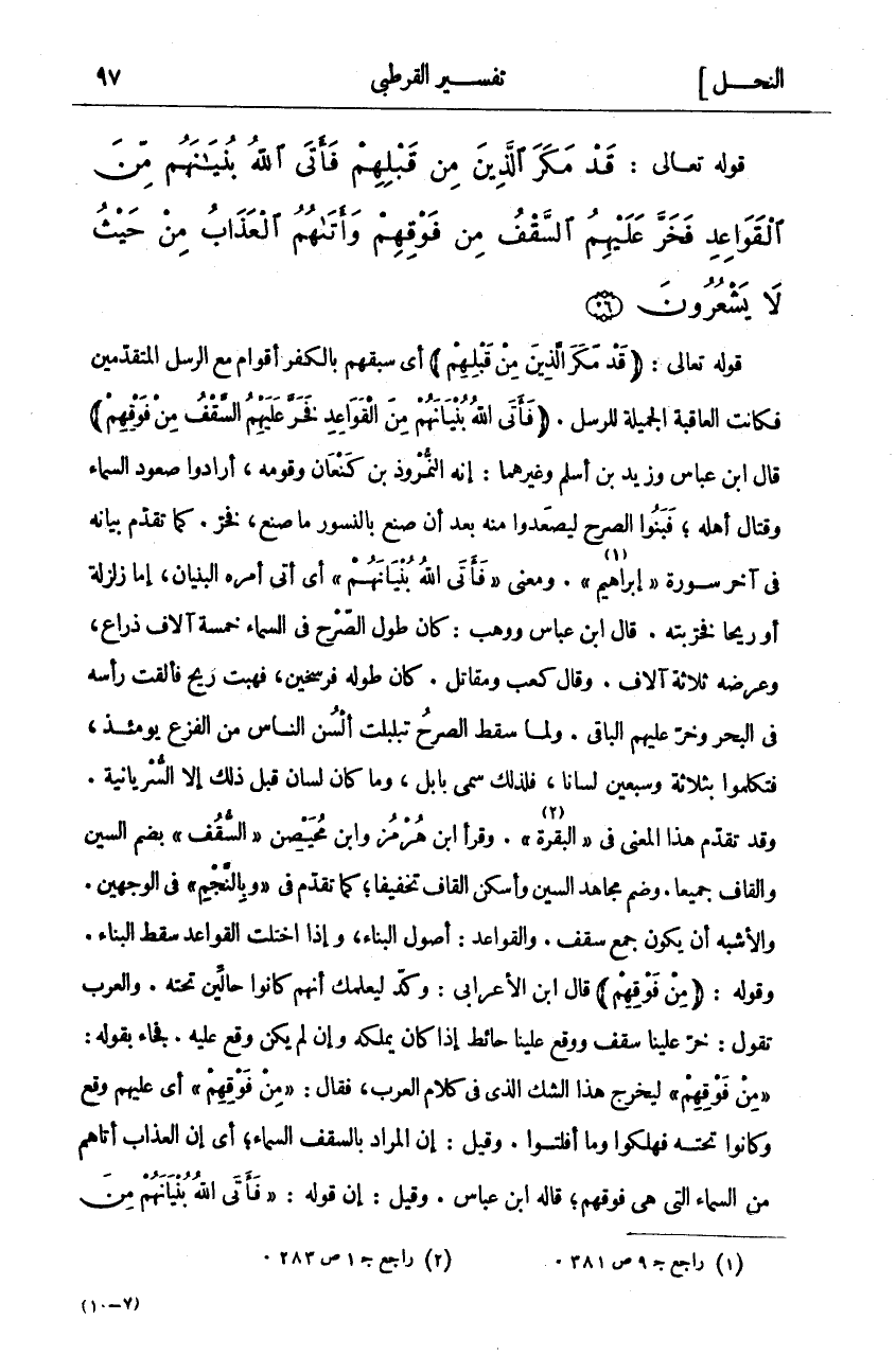 قَوْلُهُ تَعَالَى: (قَدْ مَكَرَ الَّذِينَ مِنْ قَبْلِهِمْ) أَيْ سَبَقَهُمْ بِالْكُفْرِ أَقْوَامٌ مَعَ الرُّسُلِ الْمُتَقَدِّمِينَ فَكَانَتِ الْعَاقِبَةُ الْجَمِيلَةُ لِلرُّسُلِ. (فَأَتَى اللَّهُ بُنْيانَهُمْ مِنَ الْقَواعِدِ فَخَرَّ عَلَيْهِمُ السَّقْفُ مِنْ فَوْقِهِمْ) قَالَ ابْنُ عَبَّاسٍ وَزَيْدُ بْنُ أَسْلَمَ وَغَيْرُهُمَا: إنه النمروذ بْنُ كَنْعَانَ وَقَوْمُهُ، أَرَادُوا صُعُودَ السَّمَاءِ وَقِتَالَ أَهْلِهِ، فَبَنَوُا الصَّرْحَ لِيَصْعَدُوا مِنْهُ بَعْدَ أَنْ صَنَعَ بِالنُّسُورِ مَا صَنَعَ، فَخَرَّ. كَمَا تَقَدَّمَ بيانه في آخر سورة" إِبْرَاهِيمَ «١» ". وَمَعْنَى" فَأَتَى اللَّهُ بُنْيانَهُمْ" أَيْ أَتَى أَمْرُهُ الْبُنْيَانَ، إِمَّا زَلْزَلَةً أَوْ رِيحًا فَخَرَّبَتْهُ. قَالَ ابْنُ عَبَّاسٍ وَوَهْبٌ: كَانَ طُولُ الصَّرْحِ فِي السَّمَاءِ خَمْسَةُ آلَافِ ذِرَاعٍ، وَعَرْضُهُ ثَلَاثَةُ آلَافٍ. وَقَالَ كَعْبٌ وَمُقَاتِلٌ: كَانَ طُولَ فَرْسَخَيْنِ، فَهَبَّتْ رِيحٌ فَأَلْقَتْ رَأْسَهُ فِي الْبَحْرِ وَخَرَّ عَلَيْهِمُ الْبَاقِي. وَلَمَّا سَقَطَ الصَّرْحُ تَبَلْبَلَتْ أَلْسُنُ النَّاسِ مِنَ الْفَزَعِ يَوْمئِذٍ، فَتَكَلَّمُوا بِثَلَاثَةٍ وَسَبْعِينَ لِسَانًا، فَلِذَلِكَ سُمِّيَ بَابِلَ، وَمَا كَانَ لِسَانٌ قَبْلَ ذَلِكَ إِلَّا السُّرْيَانِيَّةُ. وَقَدْ تَقَدَّمَ هَذَا الْمَعْنَى فِي" الْبَقَرَةِ «٢» " وَقَرَأَ ابْنُ هُرْمُزَ وَابْنُ مُحَيْصِنٍ" السُّقُفُ" بِضَمِّ السِّينِ وَالْقَافِ جَمِيعًا. وَضَمَّ مُجَاهِدٌ السِّينَ وَأَسْكَنَ الْقَافَ تَخْفِيفًا، كَمَا تَقَدَّمَ فِي" وَبِالنَّجْمِ" فِي الْوَجْهَيْنِ. وَالْأَشْبَهُ أَنْ يَكُونَ جَمْعَ سَقْفٍ. وَالْقَوَاعِدُ: أُصُولُ الْبِنَاءِ، وَإِذَا اخْتَلَّتِ الْقَوَاعِدُ سَقَطَ الْبِنَاءُ. وَقَوْلُهُ: (مِنْ فَوْقِهِمْ) قَالَ ابْنُ الْأَعْرَابِيِّ: وَكَّدَ لِيُعْلِمَكَ أَنَّهُمْ كَانُوا حَالِّينَ تَحْتَهُ. وَالْعَرَبُ تَقُولُ: خَرَّ عَلَيْنَا سَقْفٌ وَوَقَعَ عَلَيْنَا حَائِطٌ إِذَا كَانَ يَمْلِكُهُ وَإِنْ لَمْ يَكُنْ وَقَعَ عَلَيْهِ. فَجَاءَ بِقَوْلِهِ:" مِنْ فَوْقِهِمْ" لِيُخْرِجَ هَذَا الشَّكَّ الَّذِي فِي كَلَامِ الْعَرَبِ فَقَالَ:" مِنْ فَوْقِهِمْ" أَيْ عَلَيْهِمْ وَقَعَ وَكَانُوا تَحْتَهُ فَهَلَكُوا وَمَا أُفْلِتُوا. وَقِيلَ: إِنَّ الْمُرَادَ بِالسَّقْفِ السَّمَاءُ، أَيْ إِنَّ الْعَذَابَ أَتَاهُمْ مِنَ السَّمَاءِ الَّتِي هِيَ فَوْقَهُمْ، قَالَ ابْنُ عَبَّاسٍ. وَقِيلَ: إِنَّ قَوْلَهُ:" فَأَتَى اللَّهُ بُنْيانَهُمْ مِنَ الْقَواعِدِ"