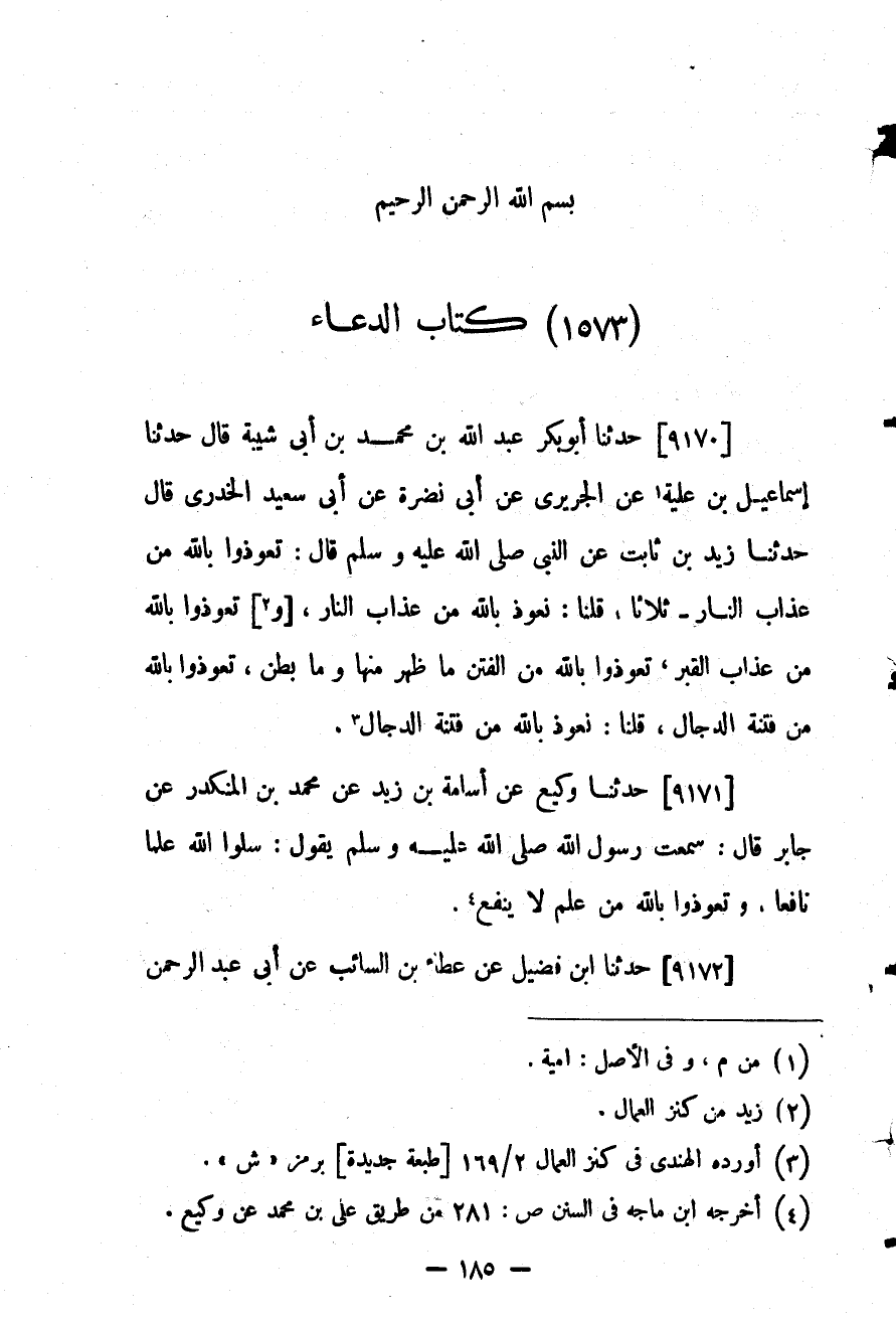 29731- حدَّثَنَا إسْمَاعِيلُ ابْنُ عُلَيَّةَ ، عَنِ الْجُرَيْرِيِّ ، عَنْ أَبِي نَضْرَةَ ، عَنْ أَبِي سَعِيدٍ الْخُدْرِيِّ قَالَ : حَدَّثَنَا زَيْدُ بْنُ ثَابِتٍ ، عَنِ النَّبِيِّ صلى الله عليه وسلم قَالَ : تَعَوَّذُوا بِاللهِ مِنْ عَذَابِ النَّارِ ثَلاثًا ، قُلْنَا : نَعُوذُ بِاللهِ مِنْ عَذَابِ النَّارِ ، فقال : تَعَوَّذُوا بِاللهِ مِنْ عَذَابِ الْقَبْرِ ، قلنا نَعُوذُ بِاللهِ مِنْ عَذَابِ الْقَبْرِ , قَالَ : تَعَوَّذُوا بِاللهِ مِنَ الْفِتَنِ مَا ظَهَرَ مِنْهَا ، وَمَا بَطَنَ ، قلنا نَعُوذُ بِاللهِ مِنَ الْفِتَنِ مَا ظَهَرَ مِنْهَا , قَالَ : تَعَوَّذُوا بِاللهِ مِنْ فِتْنَةِ الدَّجَّالِ ، قُلْنَا : نَعُوذُ بِاللهِ مِنْ فِتْنَةِ الدَّجَّالِ.
