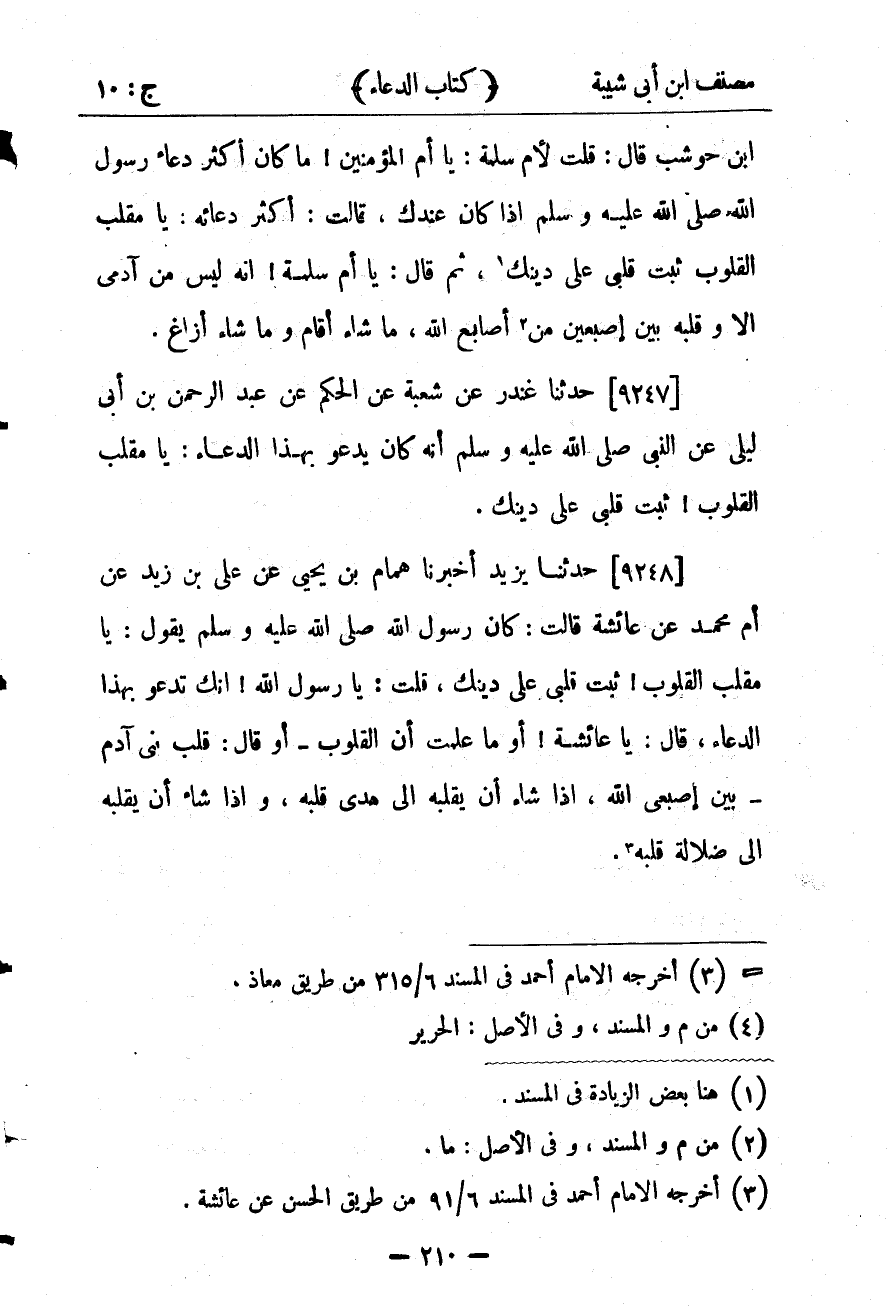 29809- حَدَّثَنَا يَزِيدُ , أَخْبَرَنَا هَمَّامُ بْنُ يَحْيَى ، عَنْ عَلِيِّ بْنِ زَيْدٍ ، عَن أُمِّ مُحَمَّدٍ ، عَنْ عَائِشَةَ قَالَتْ : كَانَ رَسُولُ اللهِ صلى الله عليه وسلم يَقُولُ يَا مُقَلِّبَ الْقُلُوبِ ، ثَبِّتْ قَلْبِي عَلَى دِينِكَ ، قُلْتُ : يَا رَسُولَ اللهِ ، إنَّك تَدْعُو بِهَذَا الدُّعَاءِ ، قَالَ : يَا عَائِشَةُ ، أَو مَا عَلِمْتِ أَنَّ الْقُلُوبَ ، أَوْ قَالَ : قَلْبَ ابْنِ آدَمَ بَيْنَ إصْبَعَي اللهِ ، إذَا شَاءَ أَنْ يُقَلِّبَهُ إِلَى هُدَى قَلَبَهُ ، وَإِذَا شَاءَ أَنْ يُقَلِّبَهُ إِلَى ضَلالَةِ قَلَبَهُ .