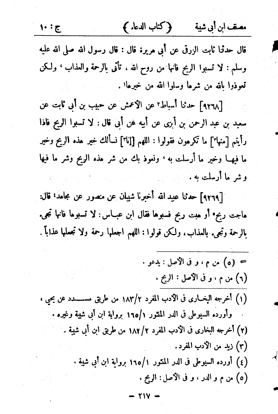 29829- حَدَّثَنَا أَسْبَاطٌ ، عَنِ الأَعْمَشِ ، عَن حَبِيبِ بْنِ أَبِي ثَابِتٍ ، عَن سَعِيدِ بْنِ عَبْدِ الرَّحْمَنِ بْنِ أَبْزَى ، عَنْ أَبِيهِ ، عَن أُبَيٍّ قَالَ : لاَ تَسُبُّوا الرِّيحَ فَإِذَا رَأَيْتُمْ مَا تَكْرَهُونَ فَقُولُوا : اللَّهُمَّ إنَّا نَسْأَلُك خَيْرَ هَذِهِ الرِّيحِ وَخَيْرَ مَا فِيهَا وَخَيْرَ مَا أُرْسِلَتْ بِهِ ، وَنَعُوذُ بِكَ مِنْ شَرِّ هَذِهِ الرِّيحِ وَشَرِّ مَا فِيهَا وَشَرِّ مَا أُرْسِلَتْ بِهِ.