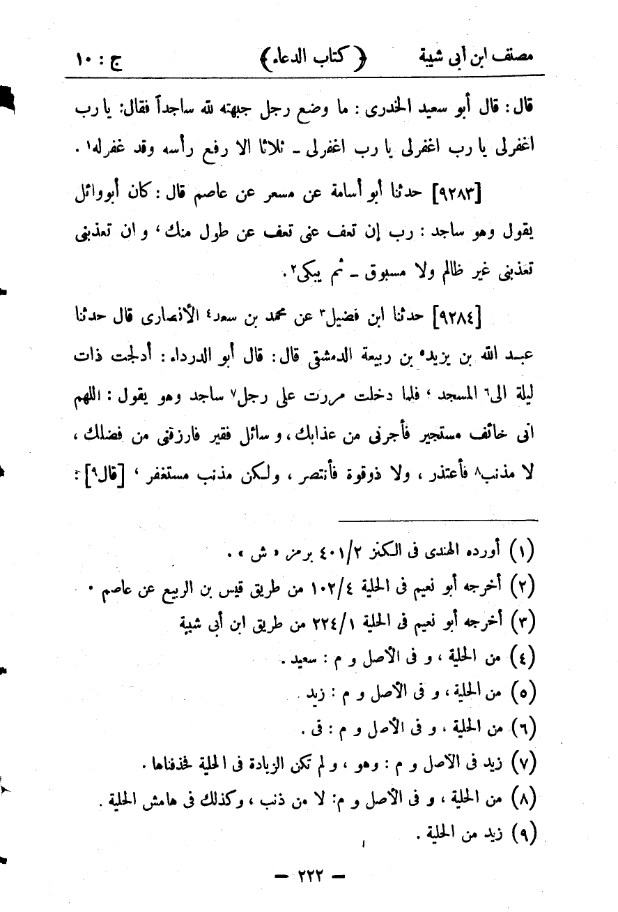 29845- حَدَّثَنَا ابْنُ فُضَيْلٍ ، عَن مُحَمَّدِ بْنِ سَعْدٍ الأَنْصَارِيِّ قَالَ : حدَّثَنَا عَبْدُ اللهِ بْنُ يزِيد بْنِ رَبِيعَةَ الدِّمَشْقِيُّ قَالَ : قَالَ أَبُو الدَّرْدَاءِ : أَدْلَجْت ذَاتَ لَيْلَةٍ إِلَى الْمَسْجِدِ ، فَلَمَّا دَخَلْت مَرَرْت عَلَى رَجُلٍ سَاجِدٍ وَهُوَ يَقُولُ : اللَّهُمَّ إنِّي خَائِفٌ مُسْتَجِيرٌ فَأَجِرْنِي مِنْ عَذَابِكَ ، وَسَائِلٌ فَقِيرٌ فَارْزُقْنِي مِنْ فَضْلِكَ ، لاَ بَرِيءَ مِنْ ذَنْبٍ فَأَعْتَذِرَ ، وَلا ذُو قُوَّةٍ فَأَنْتَصِرَ ، وَلَكِنْ مُذْنِبٌ مُسْتَغْفِرٌ , فَأَصْبَحَ أَبُو الدَّرْدَاءِ يُعَلِّمُهُنَّ أَصْحَابَهُ إعْجَابًا بِهِا.