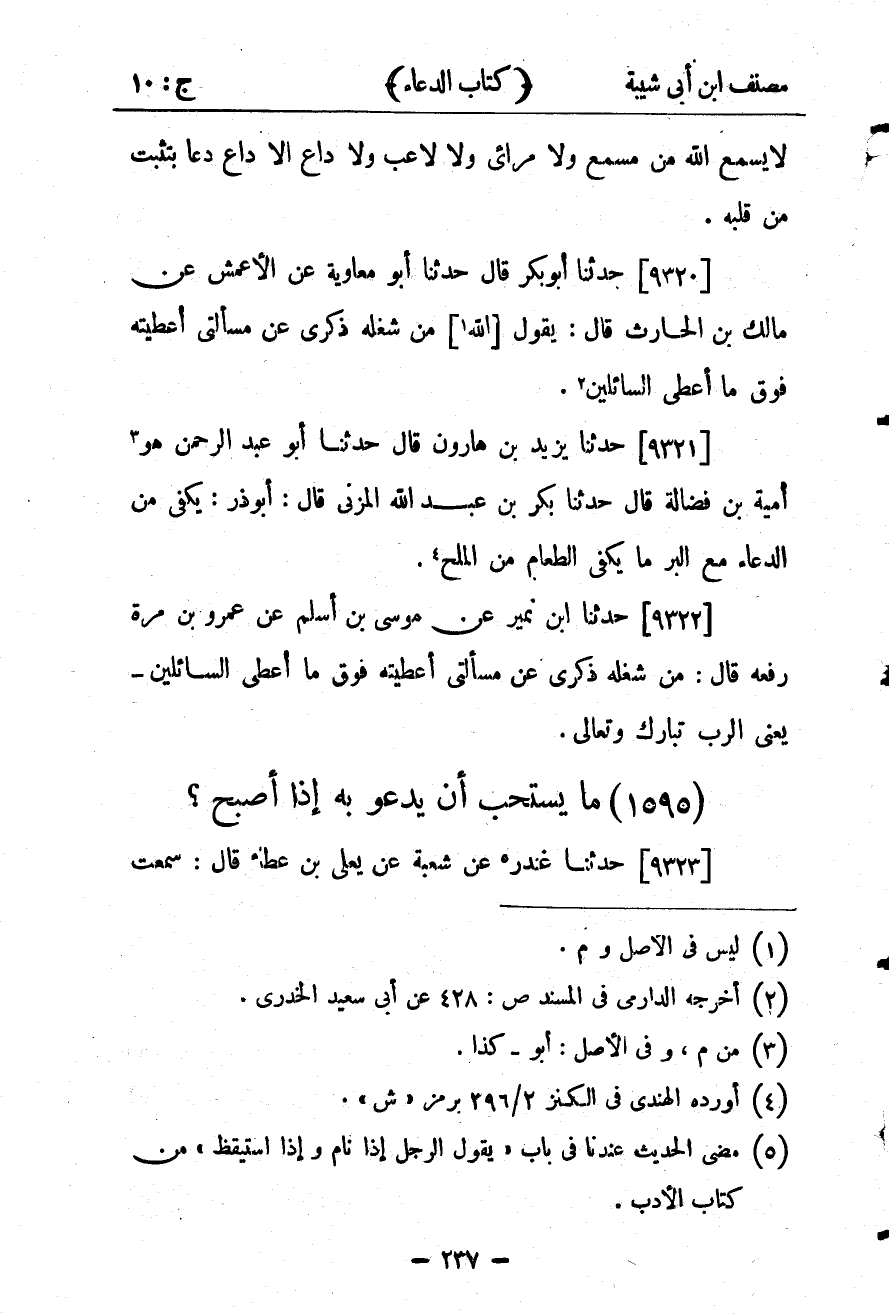 29881- حَدَّثَنَا أَبُو مُعَاوِيَةَ ، عَنِ الأَعْمَشِ ، عَن مَالِكِ بْنِ الْحَارِثِ قَالَ : يَقُولُ اللَّهُ مَنْ شَغَلَهُ ذِكْرِي ، عَن مَسْأَلَتِي أَعْطَيْته فَوْقَ مَا أُعْطِي السَّائِلِينَ.