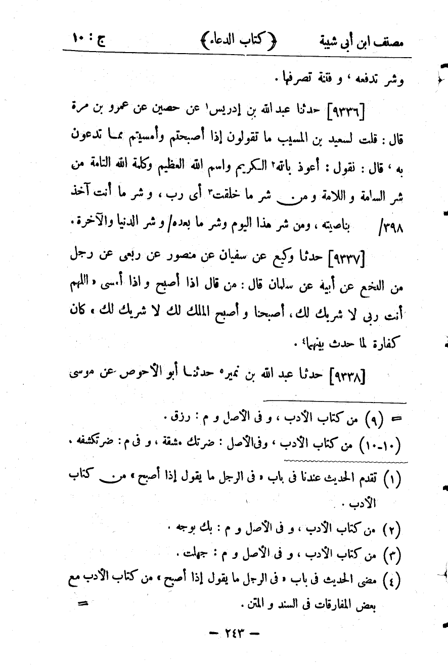 29898- حَدَّثَنَا عَبْدُ اللهِ بْنُ إدْرِيسَ ، عَن حُصَيْنٍ ، عَنْ عَمْرِو بْنِ مُرَّةَ قَالَ : قُلْتُ لِسَعِيدِ بْنِ الْمُسَيَّبِ مَا تَقُولُونَ إذَا أَصْبَحْتُمْ وَأَمْسَيْتُمْ مِمَّا تَدْعُونَ بِهِ ، قَالَ : نَقُولُ : أَعُوذُ بِوَجْهِ اللهِ الْكَرِيمِ وَاسْمِ اللهِ الْعَظِيمِ وَكَلِمَةِ اللهِ التَّامَّةِ مِنْ شَرِّ السَّامَّةِ وَاللاَّمَّةِ وَمِنْ شَرِّ مَا جَهِلت أَيْ رَبِ ، وَشَرِّ مَا أَنْتَ آخِذٌ بِنَاصِيَتِهِ ، وَمِنْ شَرِّ هَذَا الْيَوْمِ وَشَرِّ مَا بَعْدَهُ , وَشَرِّ الدُّنْيَا وَالآخِرَةِ.