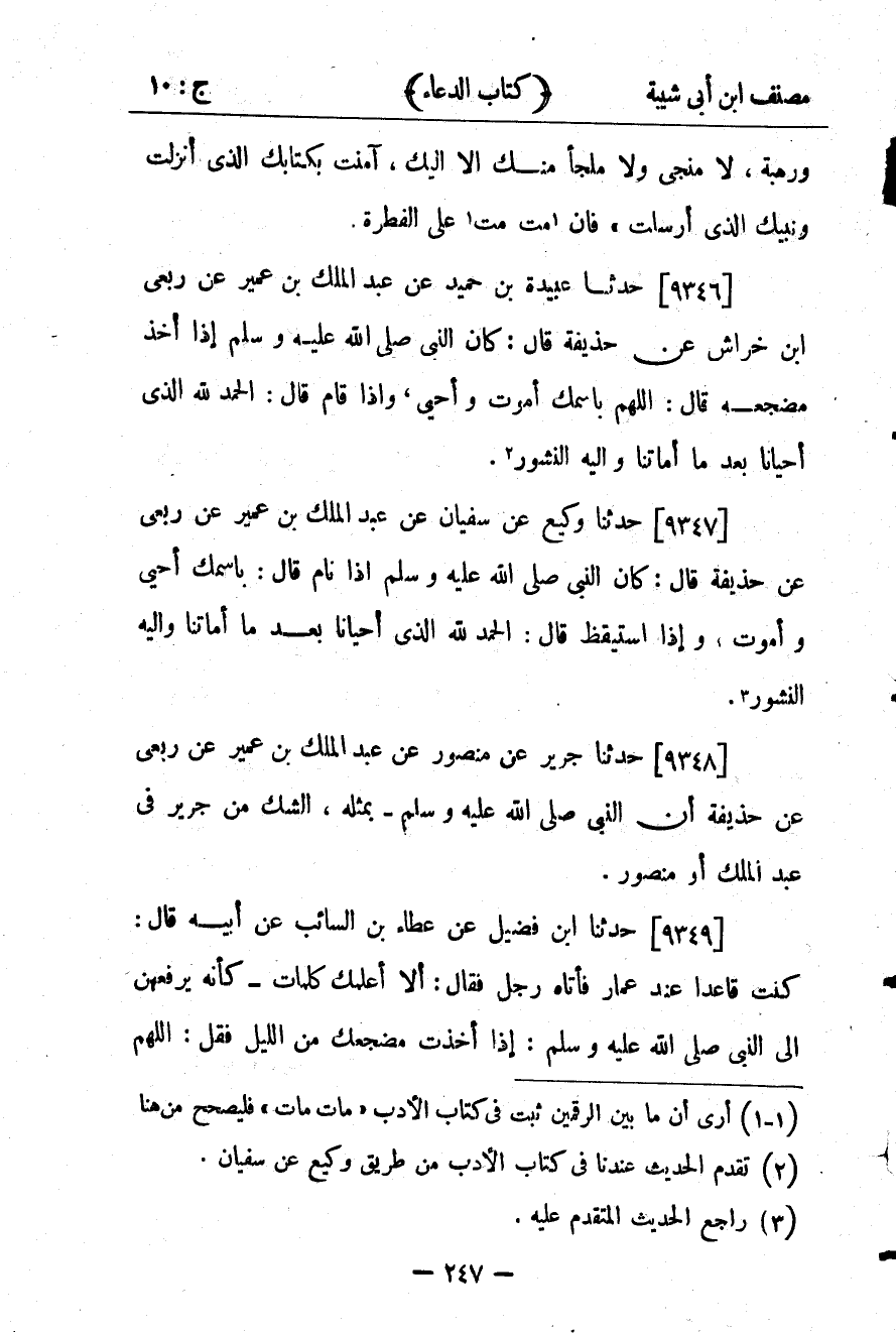 29910- حَدَّثَنَا وَكِيعٌ ، عَن سُفْيَانَ ، عَنْ عَبْدِ الْمَلِكِ بْنِ عُمَيْرٍ ، عَن رِبْعِيٍّ ، عَن حُذَيْفَةَ قَالَ : كَانَ النَّبِيُّ صلى الله عليه وسلم إذَا نَامَ قَالَ : بِاسْمِكَ أَحْيَا وَأَمُوتُ ، وَإِذَا اسْتَيْقَظَ قَالَ : الْحَمْدُ لِلَّهِ الَّذِي أَحْيَانَا بَعْدَ مَا أَمَاتَنَا وَإِلَيْهِ النُّشُورُ.