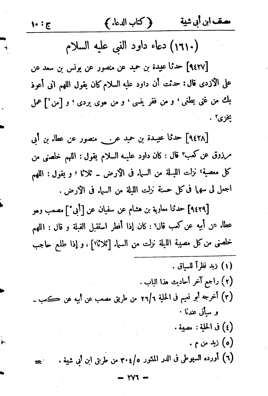 29992- حَدَّثَنَا عَبِيْدَةُ بْنُ حُمَيْدٍ ، عَن مَنْصُورٍ ، عَنْ عَطَاءِ بْنِ أَبِي مَرْزُوقٍ ، عَن كَعْبٍ قَالَ : كَانَ دَاوُد عَلَيْهِ السَّلامُ يَقُولُ : اللَّهُمَّ خَلِّصْنِي مِنْ كُلِّ مُصِيبَةٍ نَزَلَت اللَّيْلَةَ مِنَ السَّمَاءِ فِي الأَرْضِ ثَلاثًا ، وَيَقُولُ : اللَّهُمَّ اجْعَلْ لِي سَهْمًا فِي كُلِّ حَسَنَةٍ نَزَلَتِ اللَّيْلَةَ مِنَ السَّمَاءِ فِي الأَرْضِ.