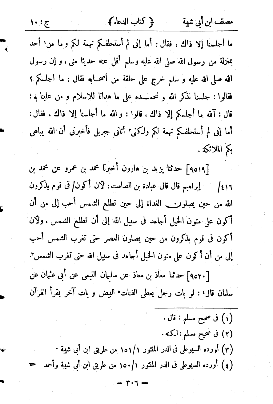 30084- حَدَّثَنَا يَزِيدُ بْنُ هَارُونَ , أَخْبَرَنَا مُحَمَّدُ بْنُ عَمْرٍو ، عَن مُحَمَّدِ بْنِ إبْرَاهِيمَ ، قَالَ : قَالَ عبَادَةُ بْنُ الصَّامِتِ : لأَنْ أَكُونَ فِي قَوْمٍ يَذْكُرُونَ اللَّهَ مِنْ حِينَ يُصَلُّونَ الْغَدَاةَ إِلَى حِينِ تَطْلُعُ الشَّمْسُ أَحَبُّ إلَيَّ مِنْ أَنْ أَكُونَ عَلَى مُتُونِ الْخَيْلِ أُجَاهِدُ فِي سَبِيلِ اللهِ إِلَى أَنْ تَطْلُعَ الشَّمْسُ ، وَلأَنْ أَكُونَ فِي قَوْمٍ يَذْكُرُونَ مِنْ حِينِ يُصَلُّونَ الْعَصْرَ حَتَّى تَغْرُبَ الشَّمْسُ أَحَبُّ إلَيَّ مِنْ أَنْ أَكُونَ عَلَى مُتُونِ الْخَيْلِ أُجَاهِدُ فِي سَبِيلِ اللهِ حَتَّى تَغْرُبَ الشَّمْسُ.