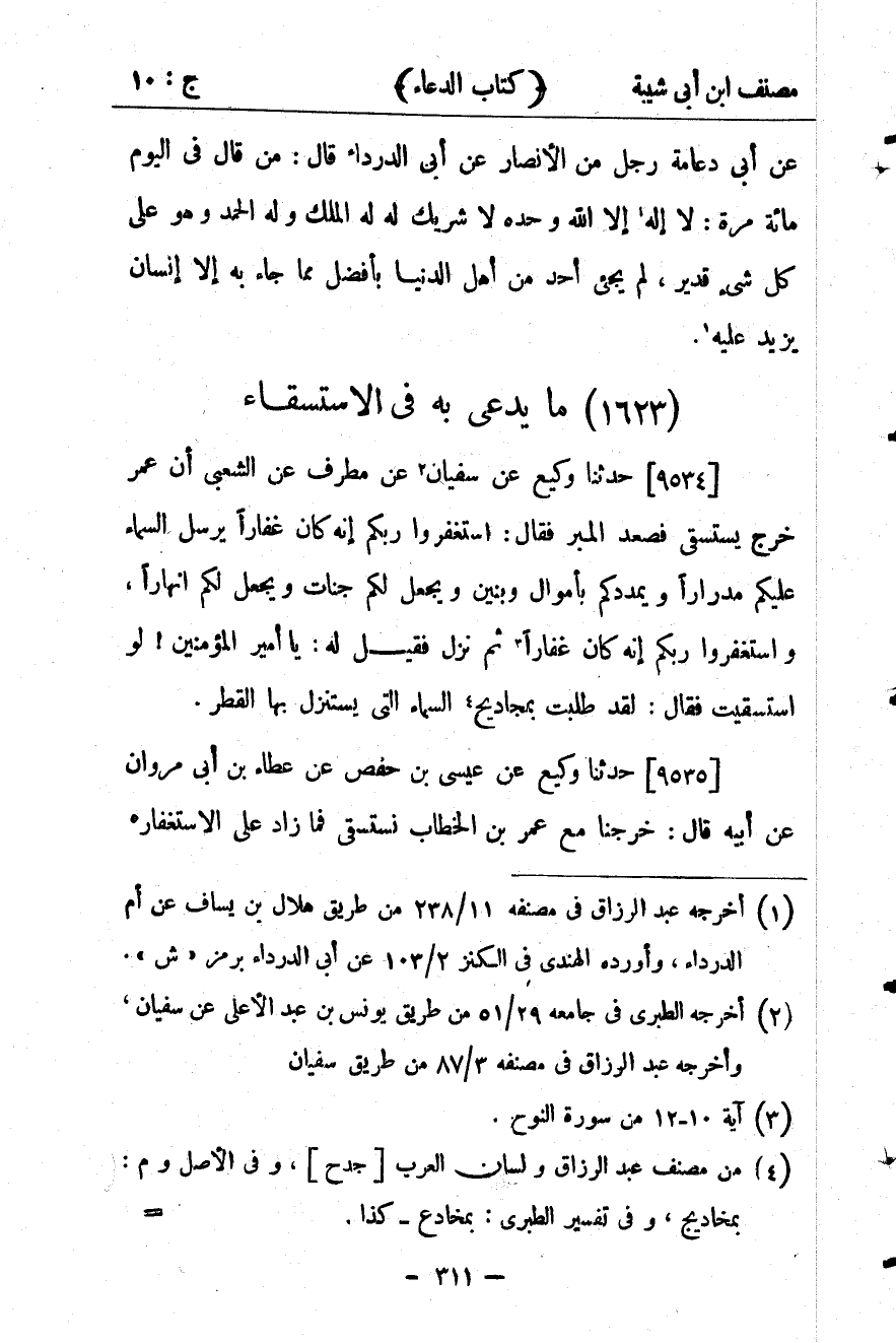 30099- حَدَّثَنَا وَكِيعٌ ، عَن سُفْيَانَ ، عَن مُطَرِّفٍ ، عَنِ الشَّعْبِيِّ ، أَنَّ عُمَرَ خَرَجَ يَسْتَسْقِي فَصَعِدَ الْمِنْبَرَ فَقَالَ : {اسْتَغْفِرُوا رَبَّكُمْ إِنَّهُ كَانَ غَفَّارًا يُرْسِلِ السَّمَاءَ عَلَيْكُمْ مِدْرَارًا وَيُمْدِدْكُمْ بِأَمْوَالٍ وَبَنِينَ وَيَجْعَلْ لَكُمْ جَنَّاتٍ وَيَجْعَلْ لَكُمْ أَنْهَارًا} وَ {اسْتَغْفِرُوا رَبَّكُمْ إِنَّهُ كَانَ غَفَّارًا} ثُمَّ نَزَلَ فَقِيلَ لَهُ : يَا أَمِيرَ الْمُؤْمِنِينَ ، لَوِ اسْتَسْقَيْت فَقَالَ : لَقَدْ طَلَبْت بِمَجَادِيحِ السَّمَاءِ الَّتِي يُسْتَنْزَلُ بِهَا الْقَطْرُ.
