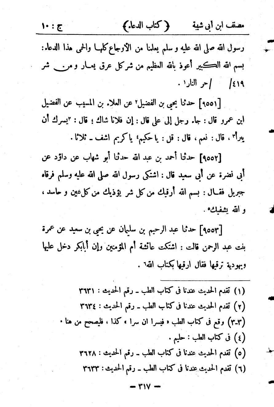 30117- حَدَّثَنَا أَحْمَدُ بْنُ عَبْدِ اللهِ حَدَّثَنَا أَبُو شِهَابٍ ، عَن دَاوُد ، عَنْ أَبِي نَضْرَةَ ، عَنْ أَبِي سَعِيدٍ ، قَالَ : اشْتَكَى رَسُولُ اللهِ صلى الله عليه وسلم فَرَقَاهُ جِبْرِيلُ فَقَالَ : بِسْمِ اللهِ أَرْقِيك مِنْ كُلِّ شَيْءٍ يُؤْذِيك مِنْ كُلِّ حَاسِدٍ وَعَيْنٍ ، وَاللَّهُ يَشْفِيك.