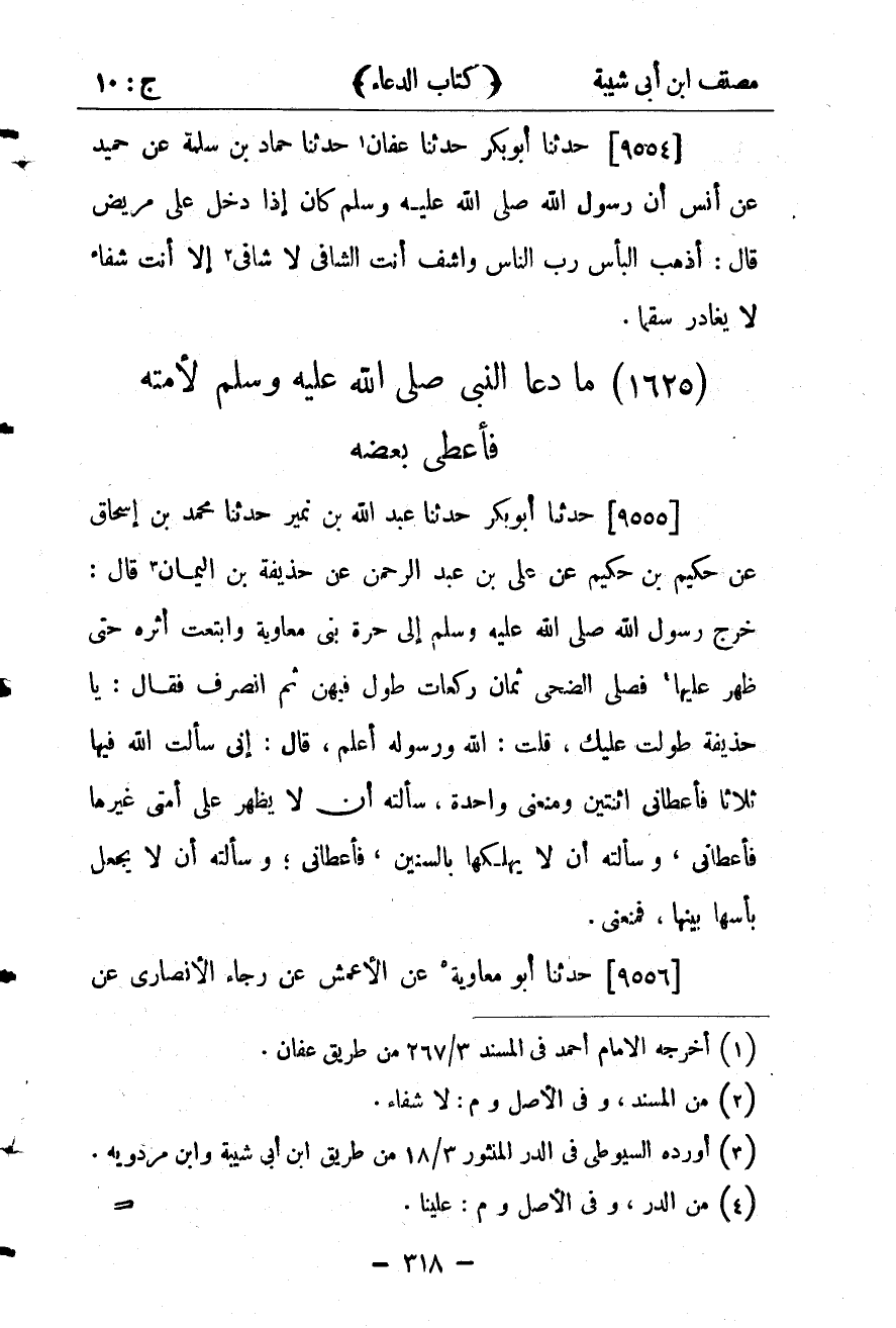 30120- حَدَّثَنَا عَبْدُ اللهِ بْنُ نُمَيْرٍ حَدَّثَنَا مُحَمَّدُ بْنُ إِسْحَاقَ ، عَن حَكِيمِ بْنِ حَكِيمٍ ، عَنْ عَلِيِّ بْنِ عَبْدِ الرَّحْمَنِ ، عَن حُذَيْفَةَ بْنِ الْيَمَانِ ، قَالَ : خَرَجَ رَسُولُ اللهِ صلى الله عليه وسلم إِلَى حَرَّةِ بَنِي مُعَاوِيَةَ واتَّبَعْت أَثَرَهُ حَتَّى ظَهَرَ عَلَيْهَا فَصَلَّى الضُّحَى ، ثَمَانِ رَكَعَاتٍ طَوَّلَ فِيهِنَّ ، ثُمَّ انْصَرَفَ فَقَالَ : يَا حُذَيْفَةُ طَوَّلْت عَلَيْك ، قُلْتُ : اللَّهُ وَرَسُولُهُ أَعْلَمُ ، قَالَ : إنِّي سَأَلْت اللَّهَ فِيهَا ثَلاثًا فَأَعْطَانِي اثْنَتَيْنِ وَمَنَعَنِي وَاحِدَةً ، سَأَلْتُهُ أَنْ لاَ يُظْهِرَ عَلَى أُمَّتِي غَيْرَهَا فَأَعْطَانِي ، وَسَأَلْتُهُ أَنْ لاَ يُهْلِكَهَا بِالسِّنِينَ ، فَأَعْطَانِي وَسَأَلْتُهُ أَنْ لاَ يَجْعَلَ بَأْسَهَا بَيْنَهَا ، فَمَنَعَنِي.