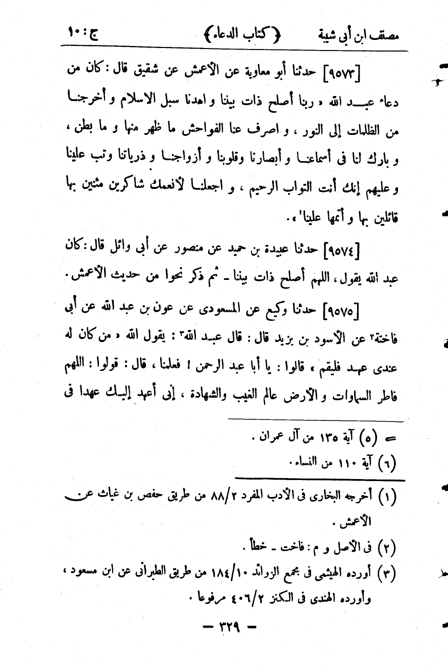 30138- حَدَّثَنَا أَبُو مُعَاوِيَةَ ، عَنِ الأَعْمَشِ ، عَن شَقِيقٍ ، قَالَ : كَانَ مِنْ دُعَاءِ عَبْدِ اللهِ رَبَّنَا أَصْلِحْ ذَاتَ بَيْنِنَا وَاهْدِنَا سُبُلَ الإِسْلامِ وَأَخْرِجْنَا مِنَ الظُّلُمَاتِ إِلَى النُّورِ ، وَاصْرِفْ عَنَّا الْفَوَاحِشَ مَا ظَهَرَ مِنْهَا ، وَمَا بَطَنَ ، وَبَارِكْ لَنَا فِي أَسْمَاعِنَا وَأَبْصَارِنَا وَقُلُوبِنَا وَأَزْوَاجِنَا وَذُرِّيَّاتِنَا وَتُبْ عَلَيْنَا وَعَلَيْهِمْ إنَّك أَنْتَ التَّوَّابُ الرَّحِيمُ ، وَاجْعَلْنَا لأَنْعُمِكَ شَاكِرِينَ مُثْنِينَ بِهَا قَائِلِينَ بِهَا وَأَتْمِمْهَا عَلَيْنَا.